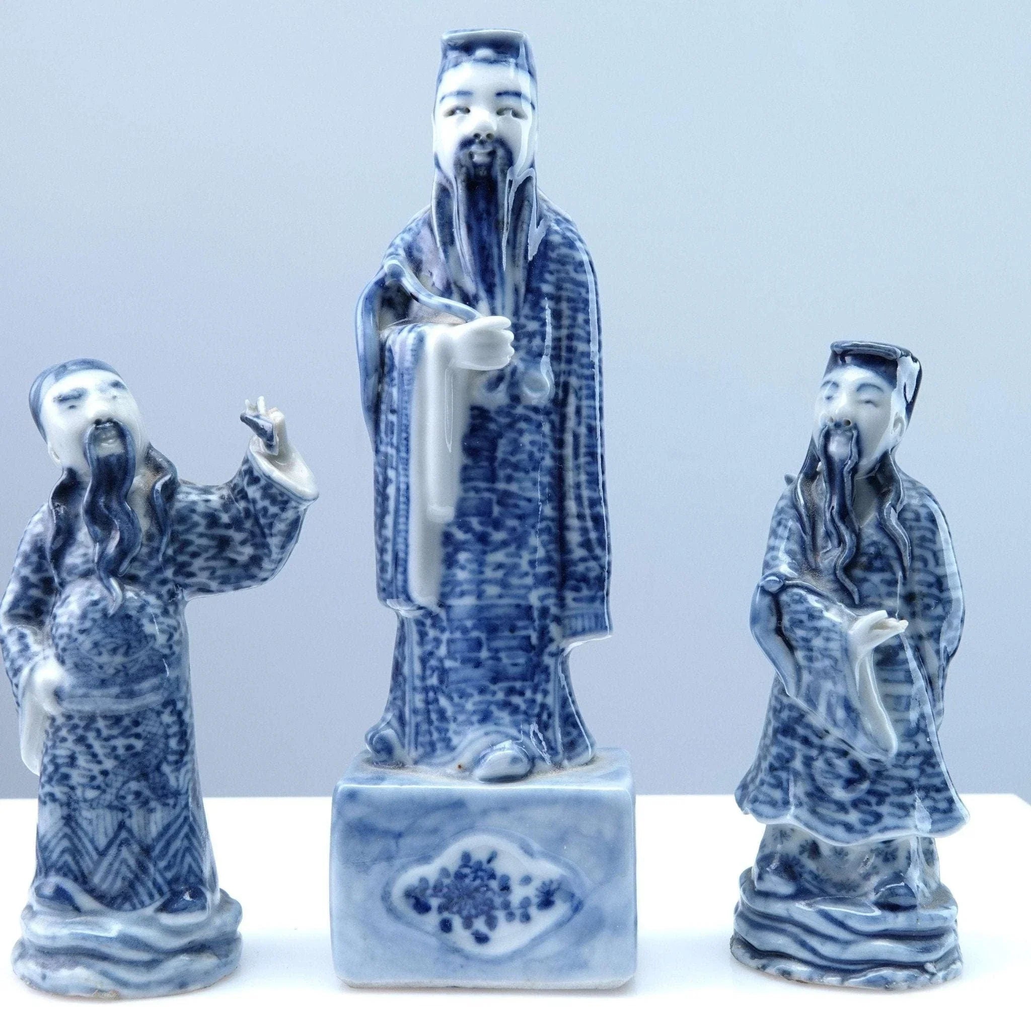 c1910 Antique Chinese Blue and Whit Fu Lu Shou Figues Lot. Actually I think<br>they're all Fu. They're a little over 100 years old. They're small with a little<br>damage but still pretty wonderful. Tallest is 5 5/8", smaller ones are 3.75"<br>tall. They all three have a little loss but no cracks or restorations.<br>B12