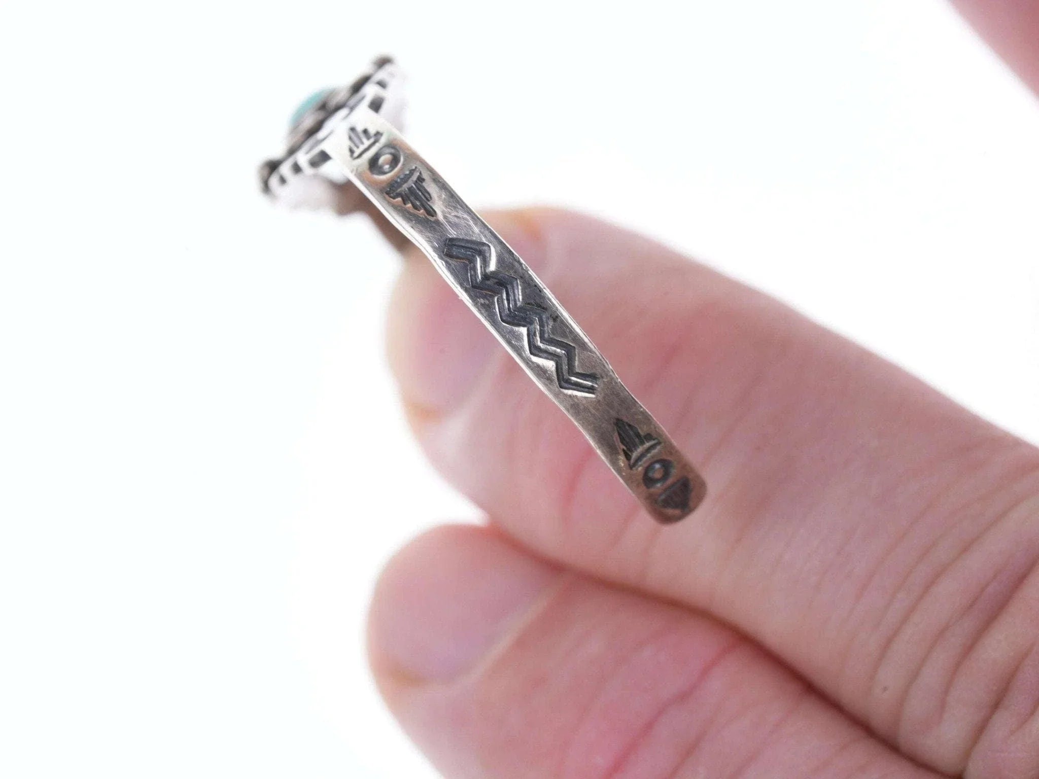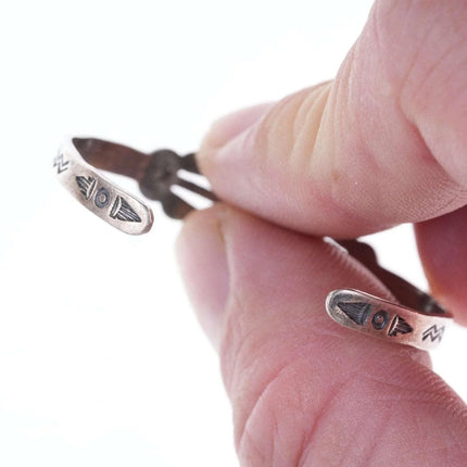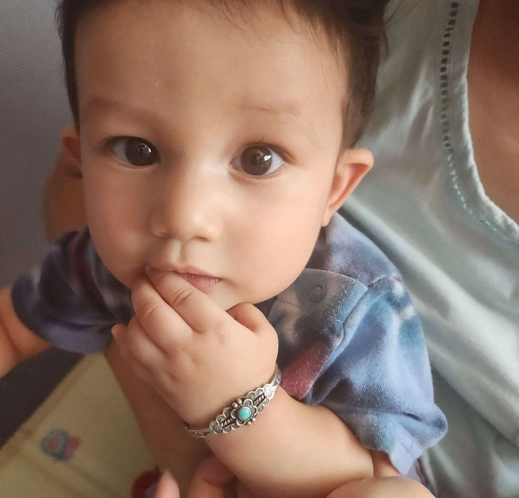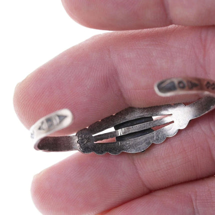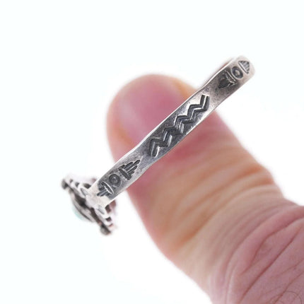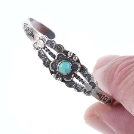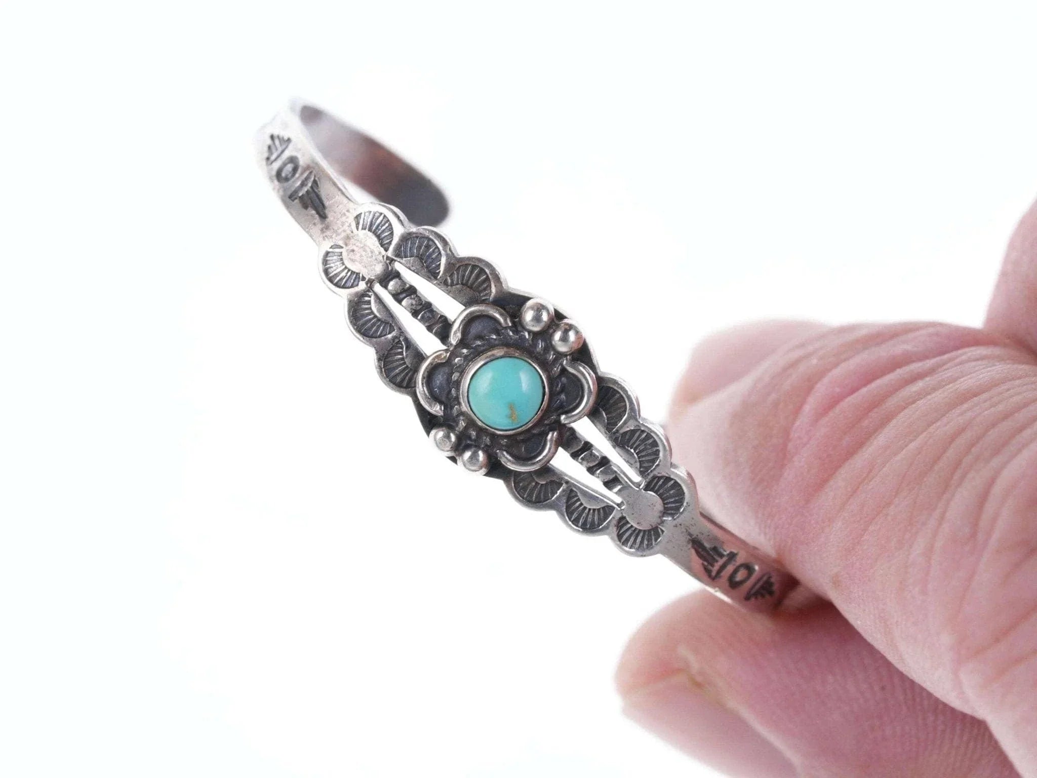 c1940's Fred Harvey Era child's bracelet. Appears unworn, fits up to a 4.75"<br>wrist, .75" flexible gap. 5.5 grams. Pictured on a 7.5 month old baby Jayden,<br>the owner of Estate Fresh Austin.<br><br><br>Established in the 1930s in Albuquerque, New Mexico, Bell Trading Post was<br>primarily known for its manufactured southwestern style jewelry that was<br>assembled and decorated by Native Americans. These souvenir jewelry pieces were<br>sold to tourists at their store on Rt. 66 and other tourist shops across the<br>Southwest. The company's name changed to Sunbell Corporation in 1969, and it<br>ceased operations in the late 1980s.<br><br>All precious metals are tested and guaranteed, any Native American jewelry<br>referred to as Silver or Sterling is guaranteed to be a minimum of 90% (coin)<br>silver and possibly higher content. Most cuff bracelets are shown photographed<br>on a 6" woman's wrist and will include a photo showing the inside circumference<br>where the metal tip meets the number on the tape measure.
