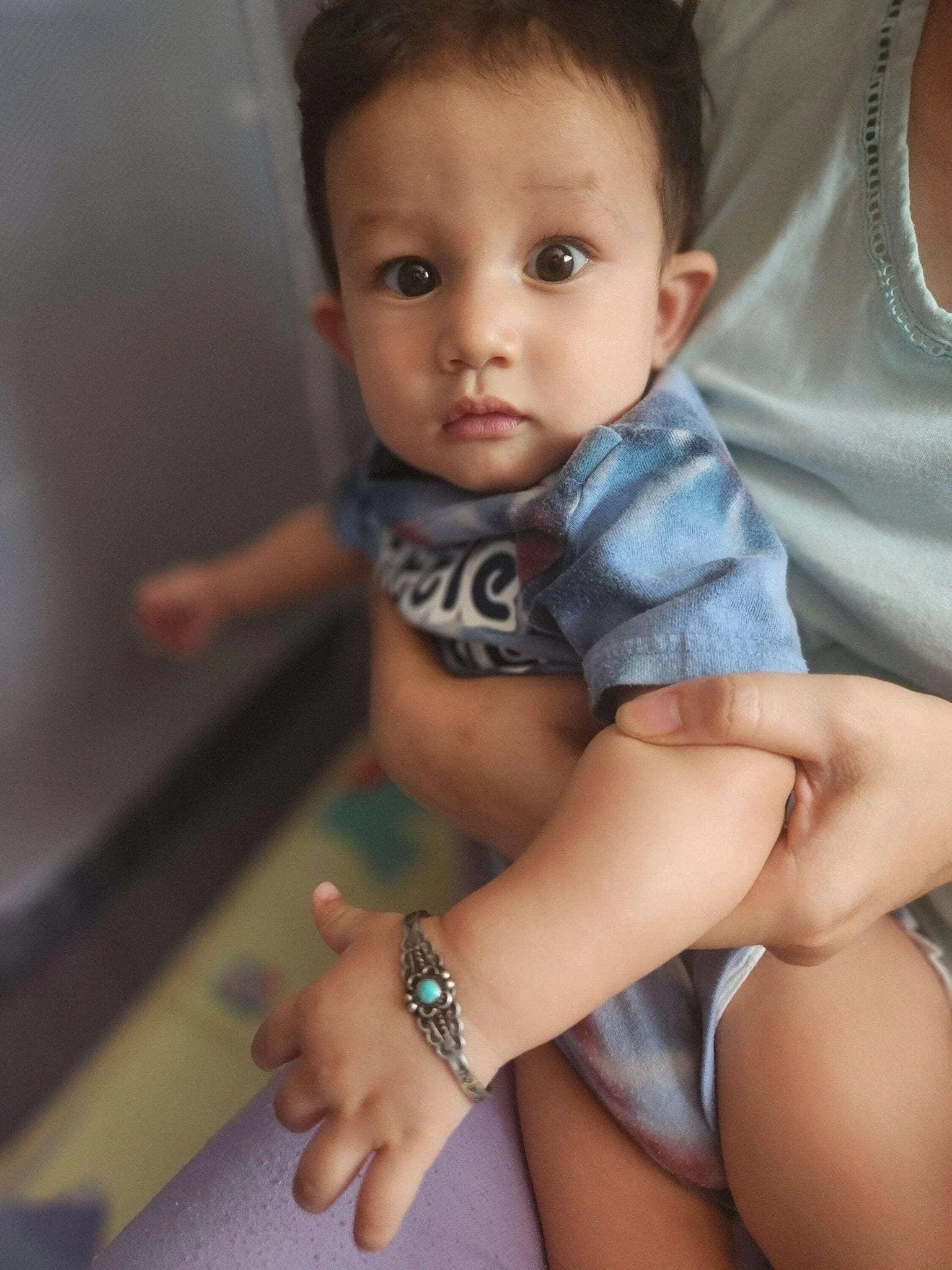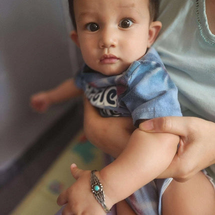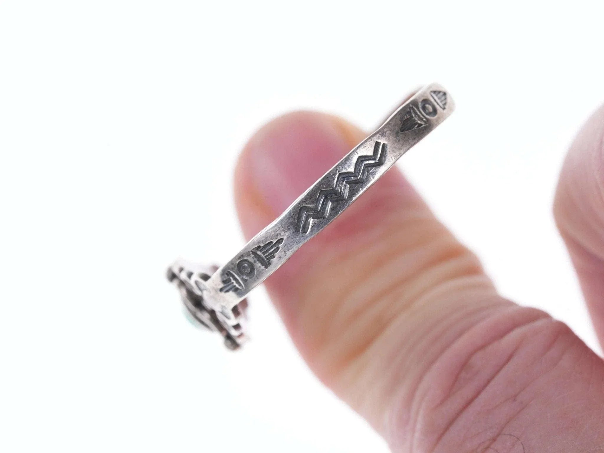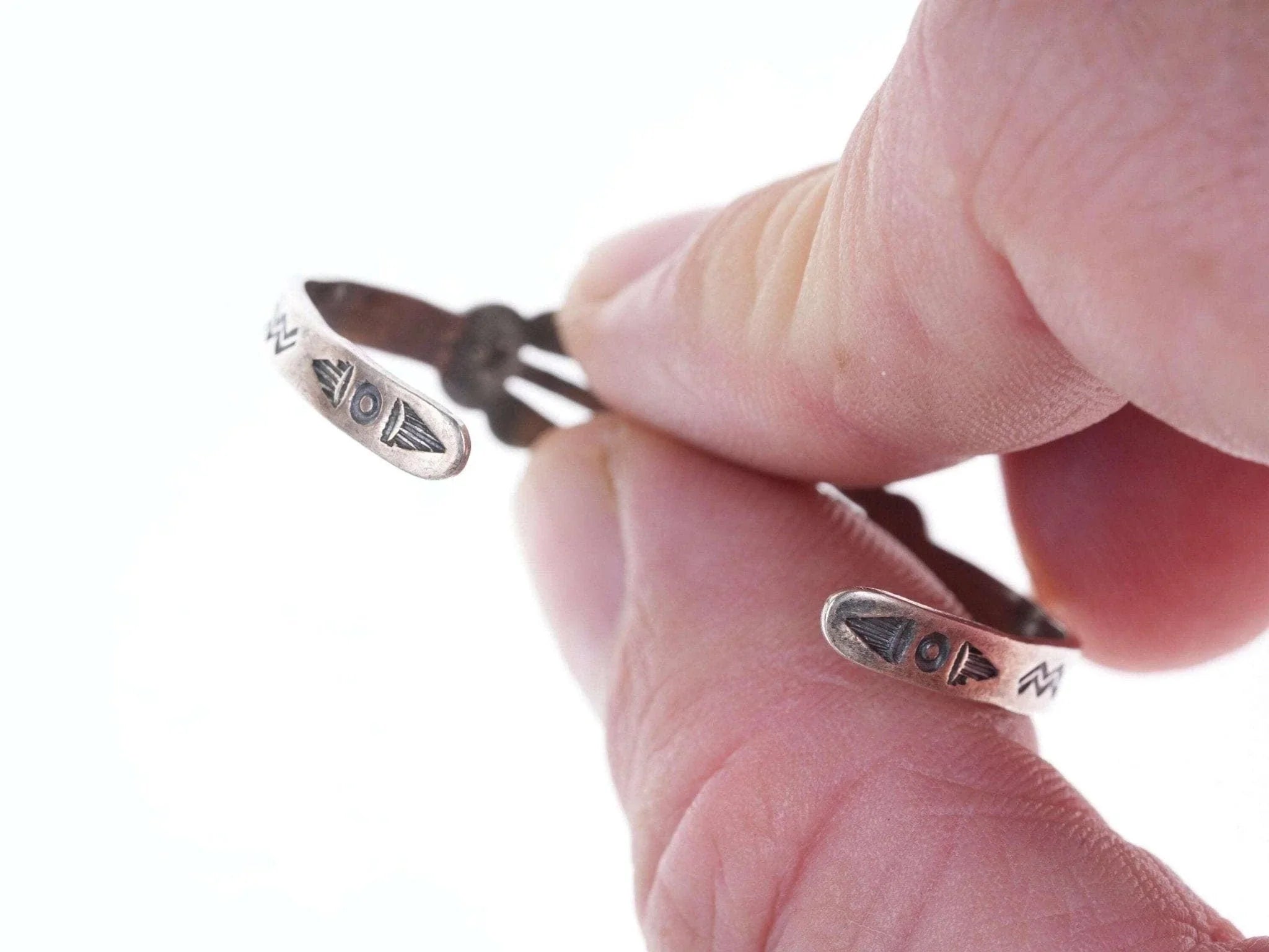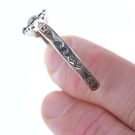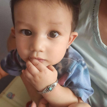 c1940's Fred Harvey Era child's bracelet. Appears unworn, fits up to a 4.75"<br>wrist, .75" flexible gap. 5.5 grams. Pictured on a 7.5 month old baby Jayden,<br>the owner of Estate Fresh Austin.<br><br><br>Established in the 1930s in Albuquerque, New Mexico, Bell Trading Post was<br>primarily known for its manufactured southwestern style jewelry that was<br>assembled and decorated by Native Americans. These souvenir jewelry pieces were<br>sold to tourists at their store on Rt. 66 and other tourist shops across the<br>Southwest. The company's name changed to Sunbell Corporation in 1969, and it<br>ceased operations in the late 1980s.<br><br>All precious metals are tested and guaranteed, any Native American jewelry<br>referred to as Silver or Sterling is guaranteed to be a minimum of 90% (coin)<br>silver and possibly higher content. Most cuff bracelets are shown photographed<br>on a 6" woman's wrist and will include a photo showing the inside circumference<br>where the metal tip meets the number on the tape measure.