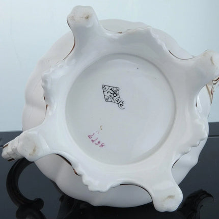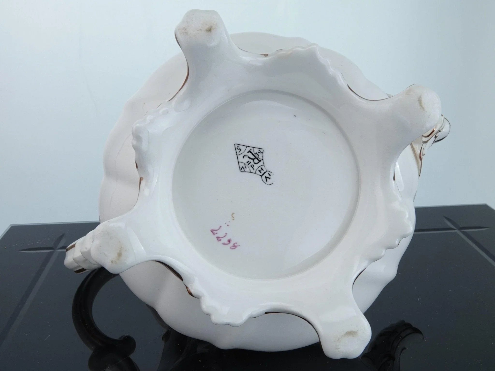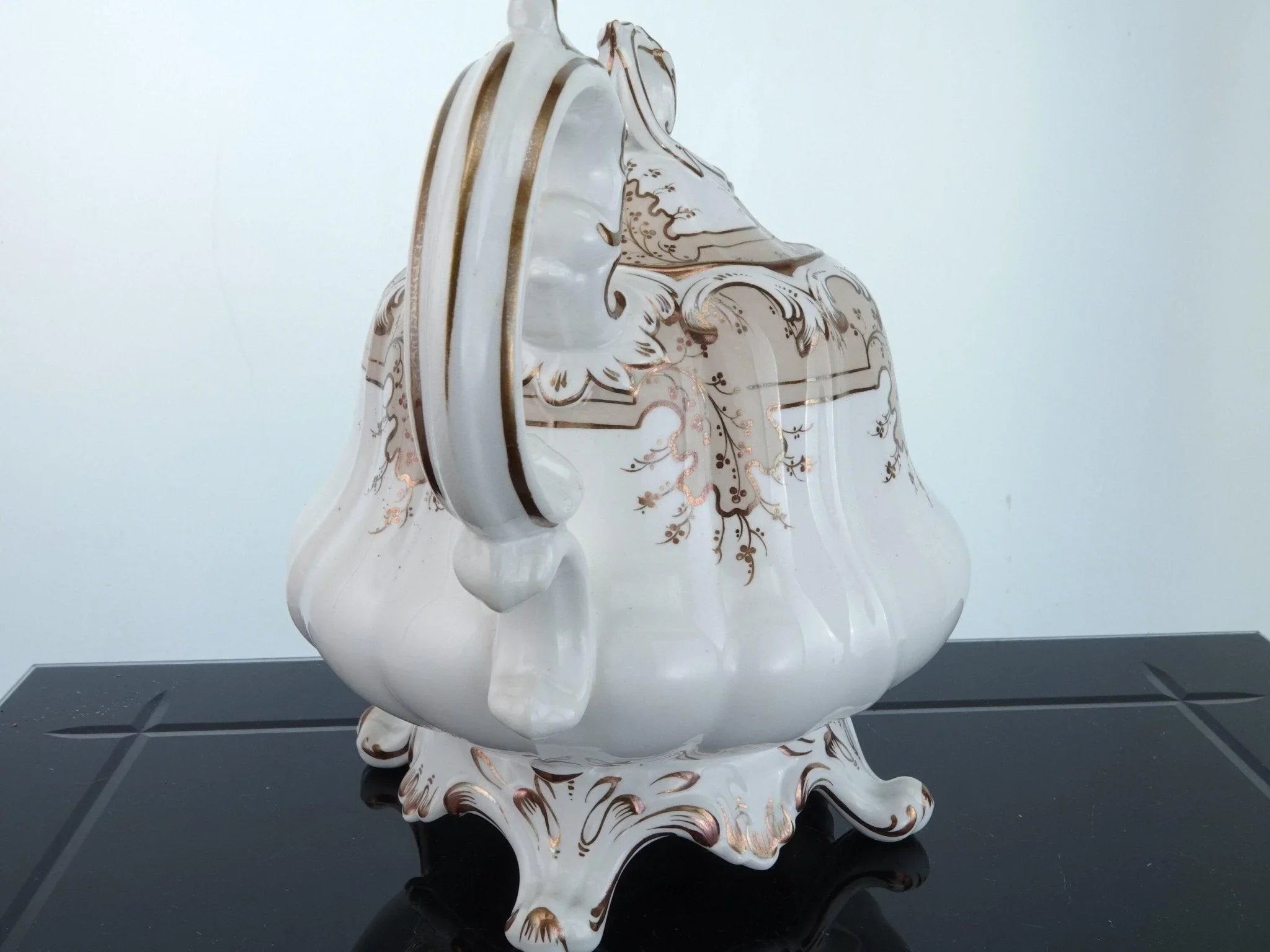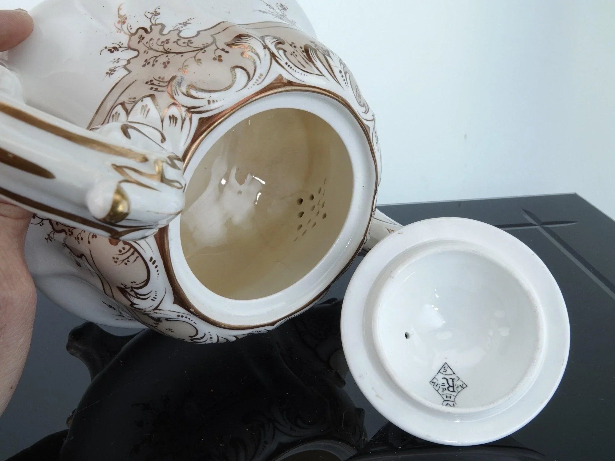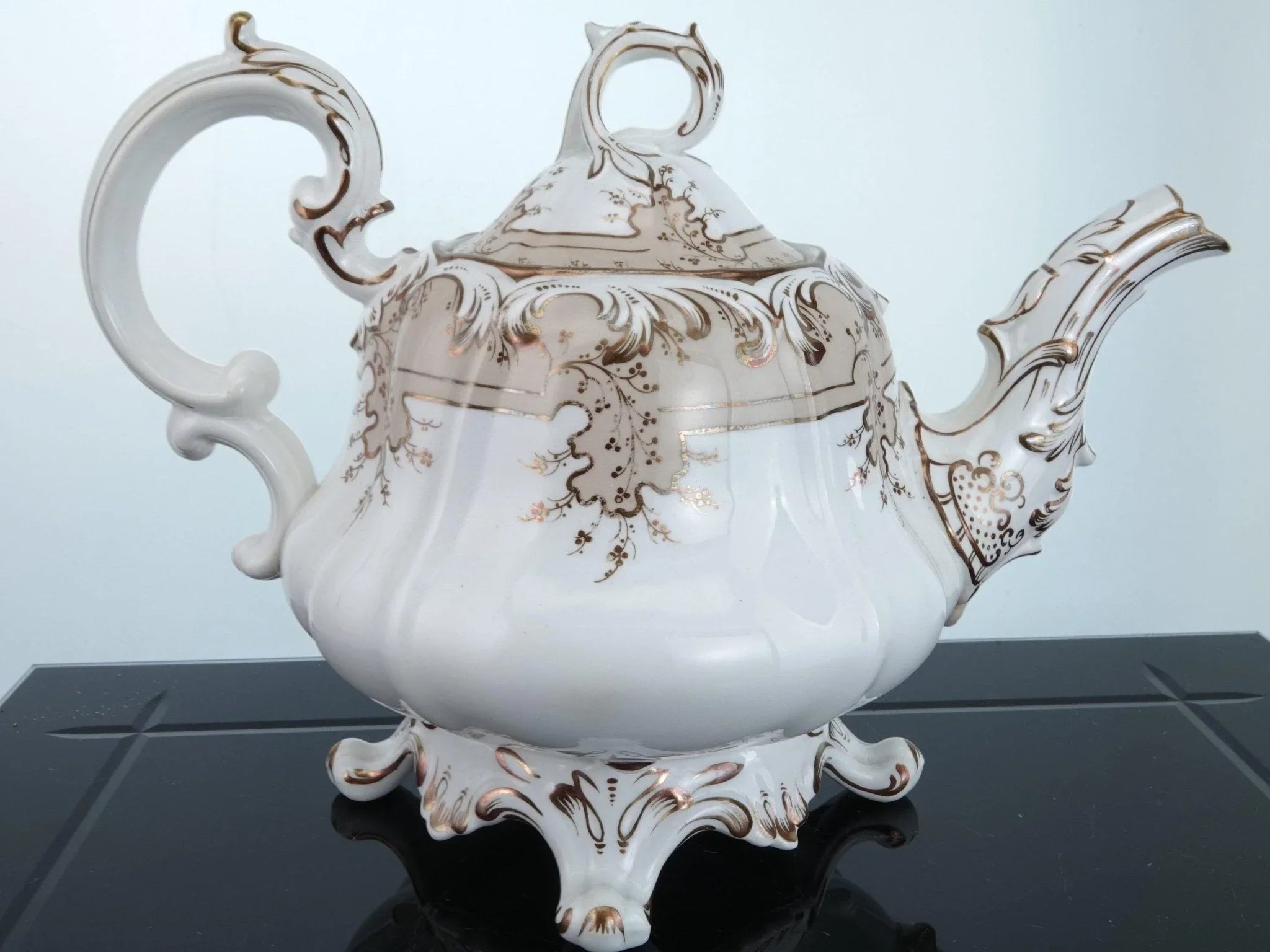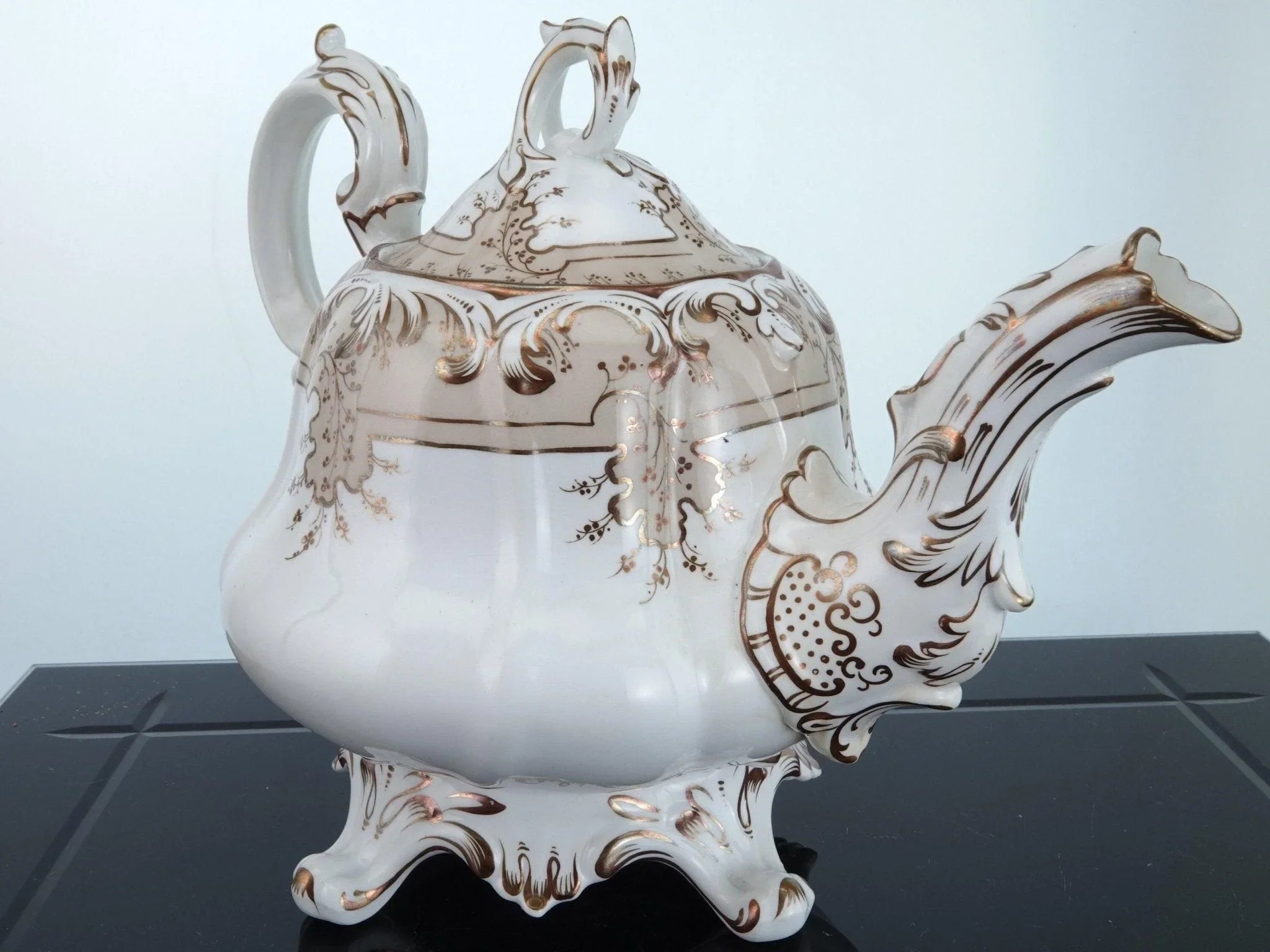 1843 Rococo British Teapot Hand Painted Gold Pattern #8677. Great Teapot with pattern number and other marks below that which should make identification simple along with this incredible mold. Registration mark on base and lid dates it to 1843. No cracks, chips, or restorations, very clean gold. Slight stains in interior only. 10.5" handle to spout x 7.25" tall. Amazing to find in this condition a 178 year old teapot. There was a spot on one side that I wiped off, just dirt. isshelf