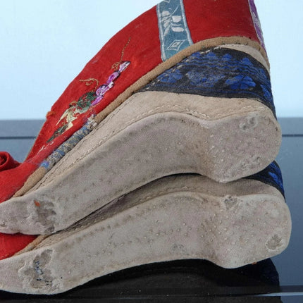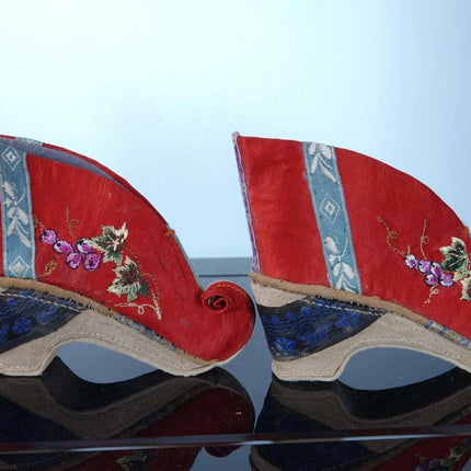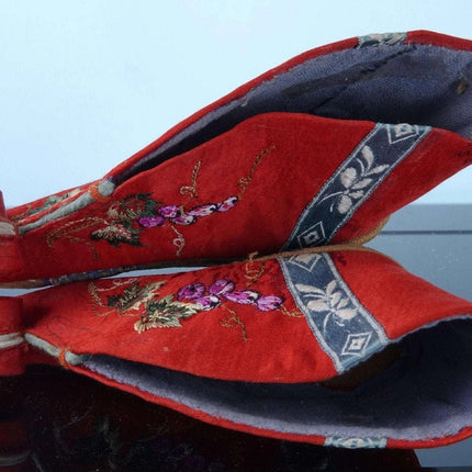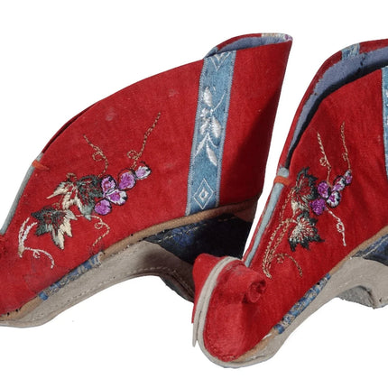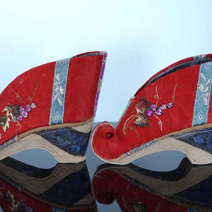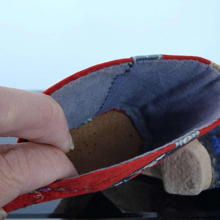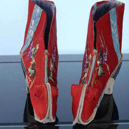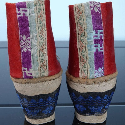 c1900 Antique Chinese Lotus Shoes For feet binding 4" tall x 5" long. They<br>appear to be cotton and silk. Very well preserved with just enough appropriate<br>wear to indicate they were worn for a period of time. Interestingly have<br>buddhist symbols on the back.<br><br>tw188