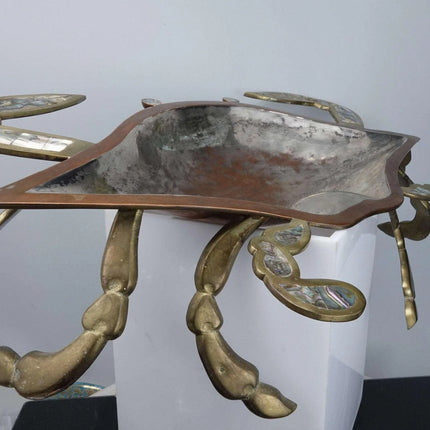 Huge c1960 Metales Casados Mixed Metals/ Abalone Crab Centerpiece Serving Dish. 21.25" x 12 5/8" x 5.25" tall. No damage, some wear to the inner silver plating. This is a very substantial and well made piece that would stand out in any setting.