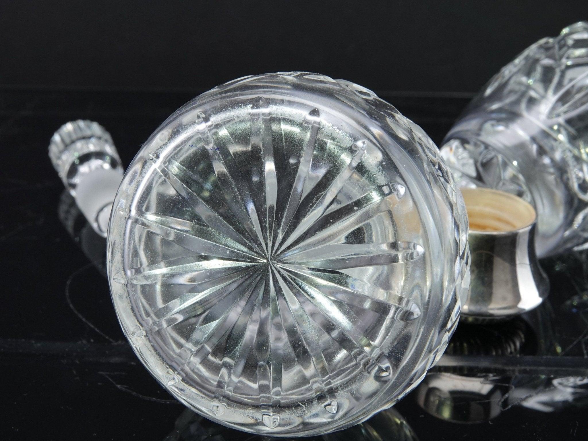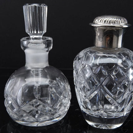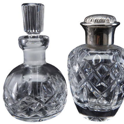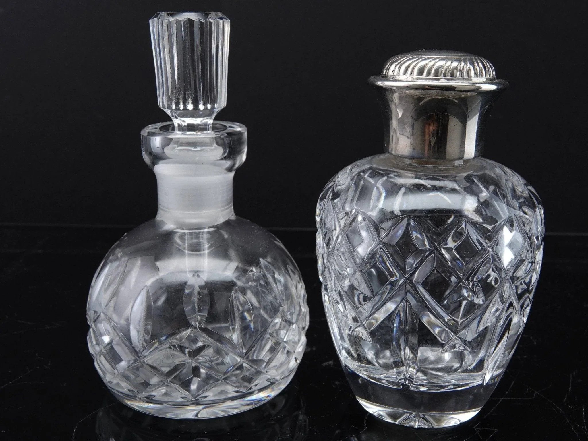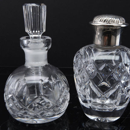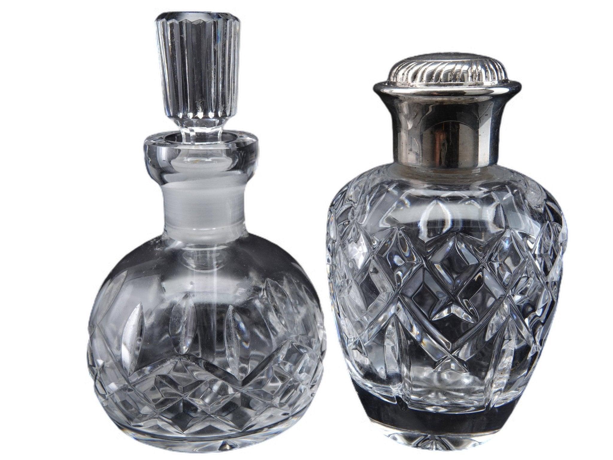 2 Waterford Crystal Scent bottles. Selling both, tallest 4 7/8". Neither with any chips, cracks, or scratches. Both marked, the mark on the one with the dauber is faint and on the base, you have to catch the light just right. The other is marked on bottom side. One with dauber, other with silverplate lid with plastic insert. Both smell of perfume inside but could easily be cleaned with alcohol if needed. TW161