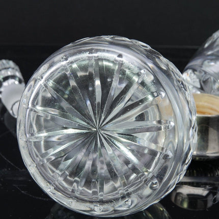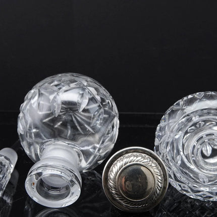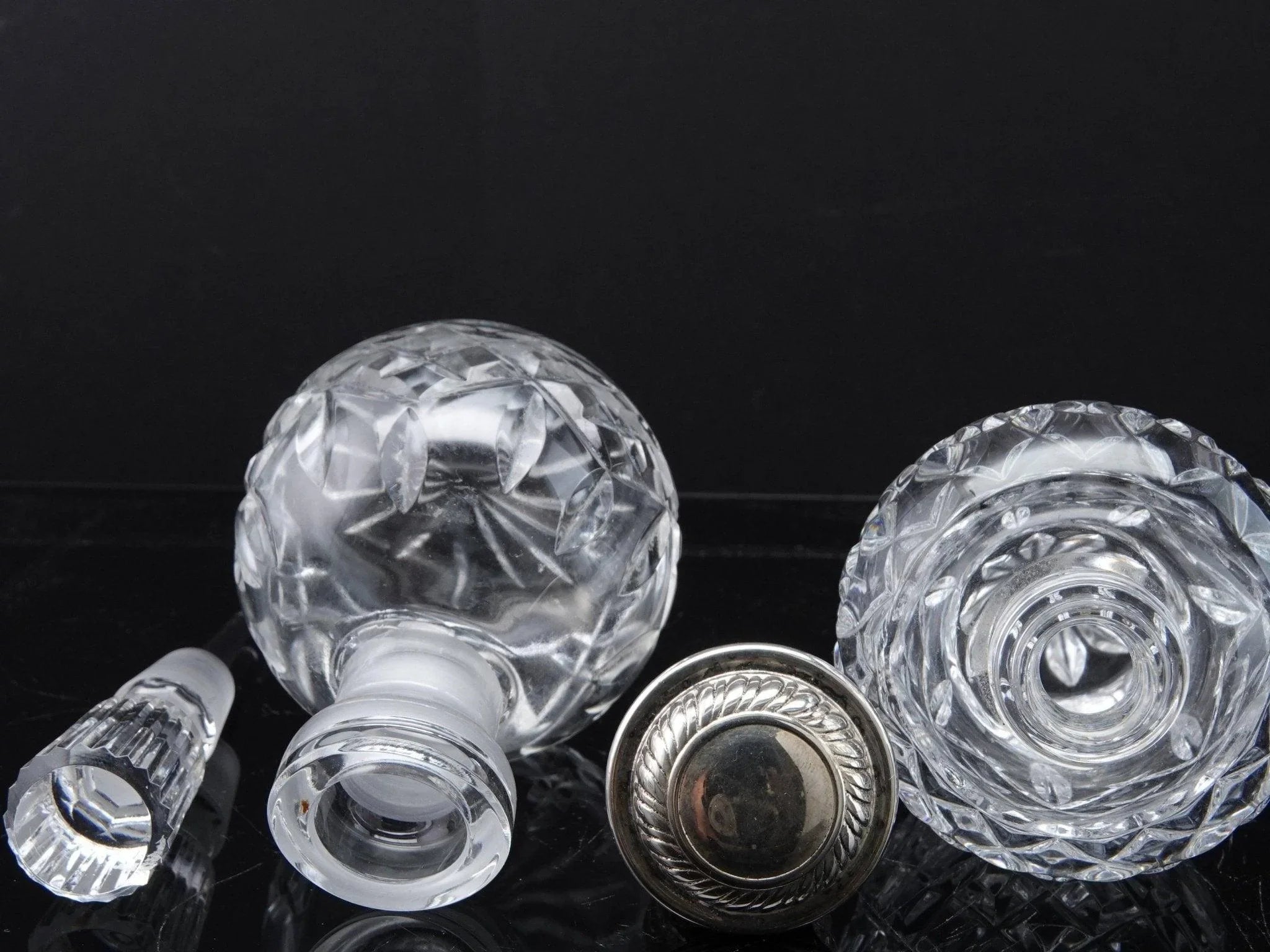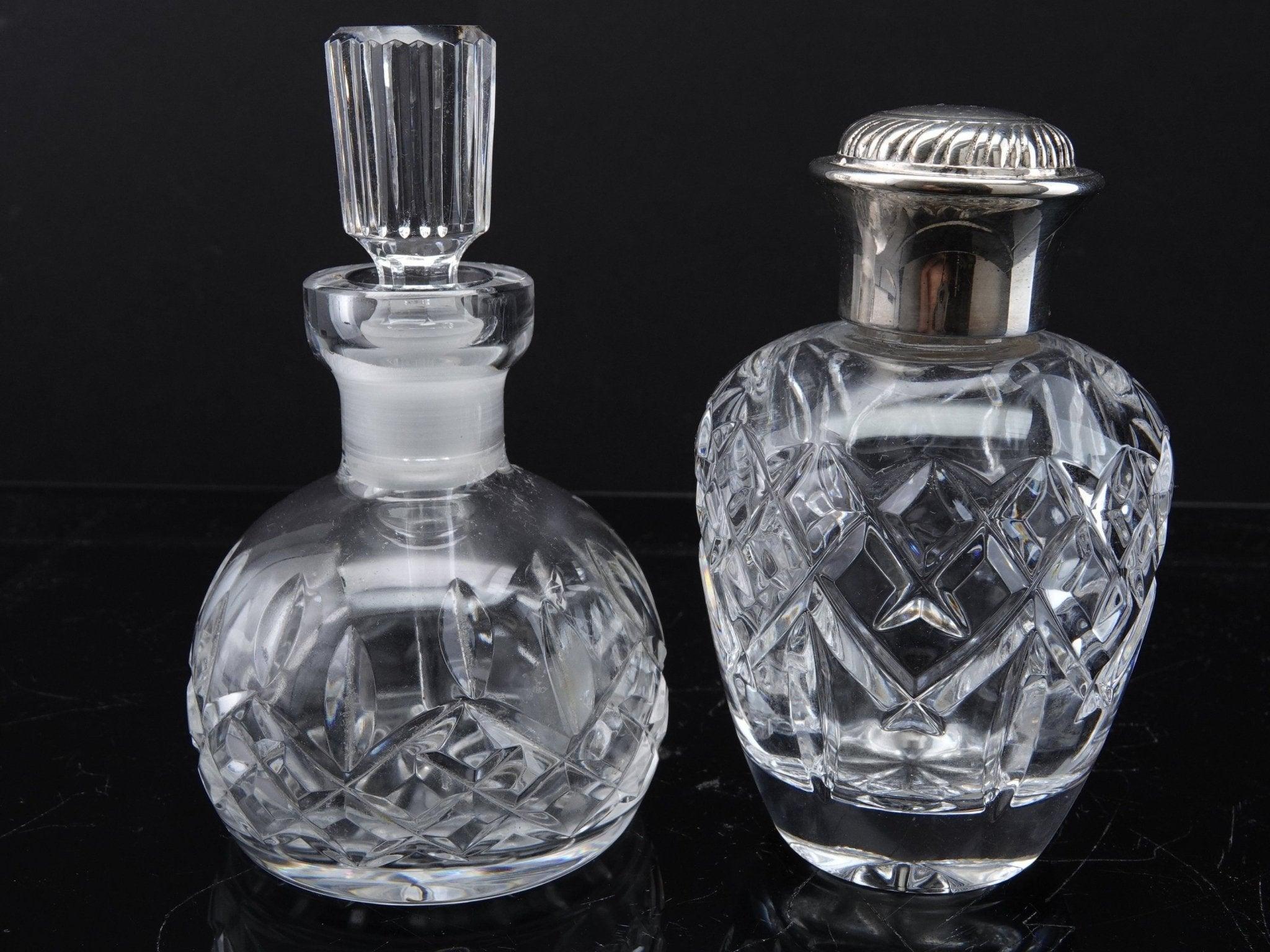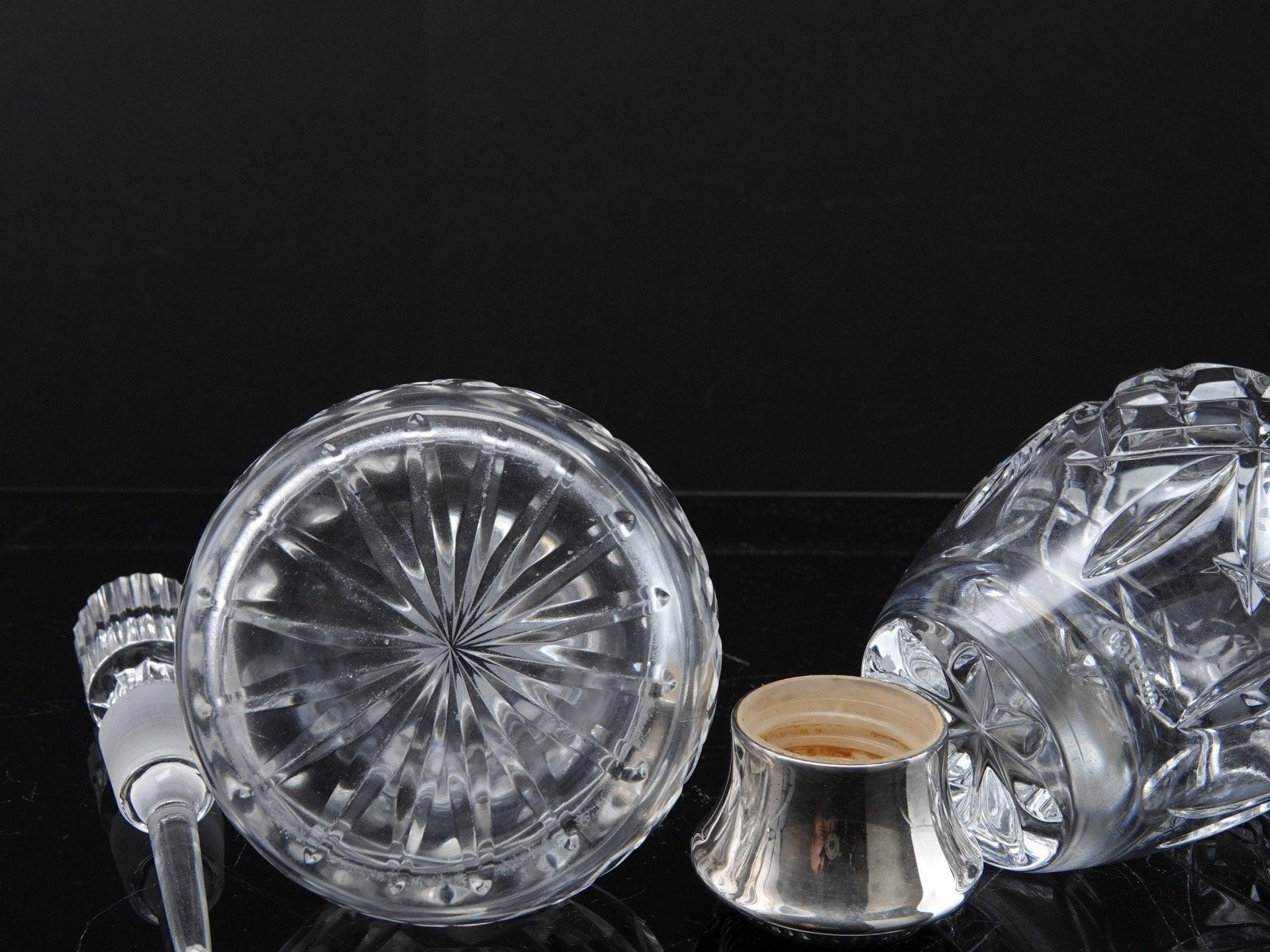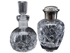 2 Waterford Crystal Scent bottles. Selling both, tallest 4 7/8". Neither with any chips, cracks, or scratches. Both marked, the mark on the one with the dauber is faint and on the base, you have to catch the light just right. The other is marked on bottom side. One with dauber, other with silverplate lid with plastic insert. Both smell of perfume inside but could easily be cleaned with alcohol if needed. TW161
