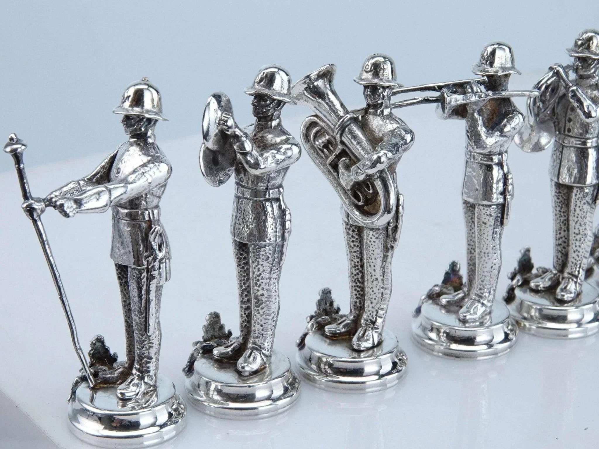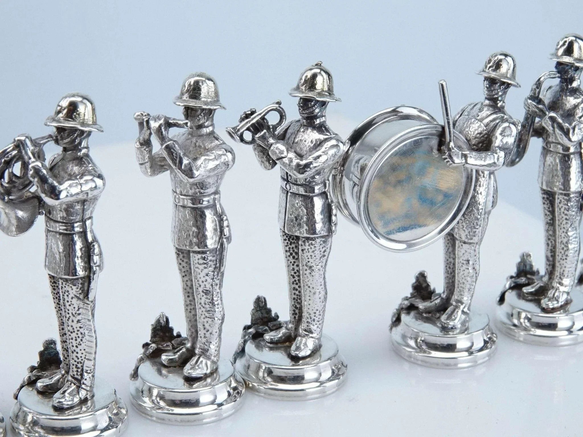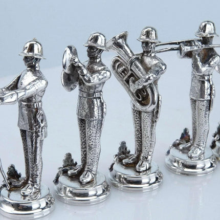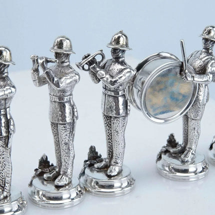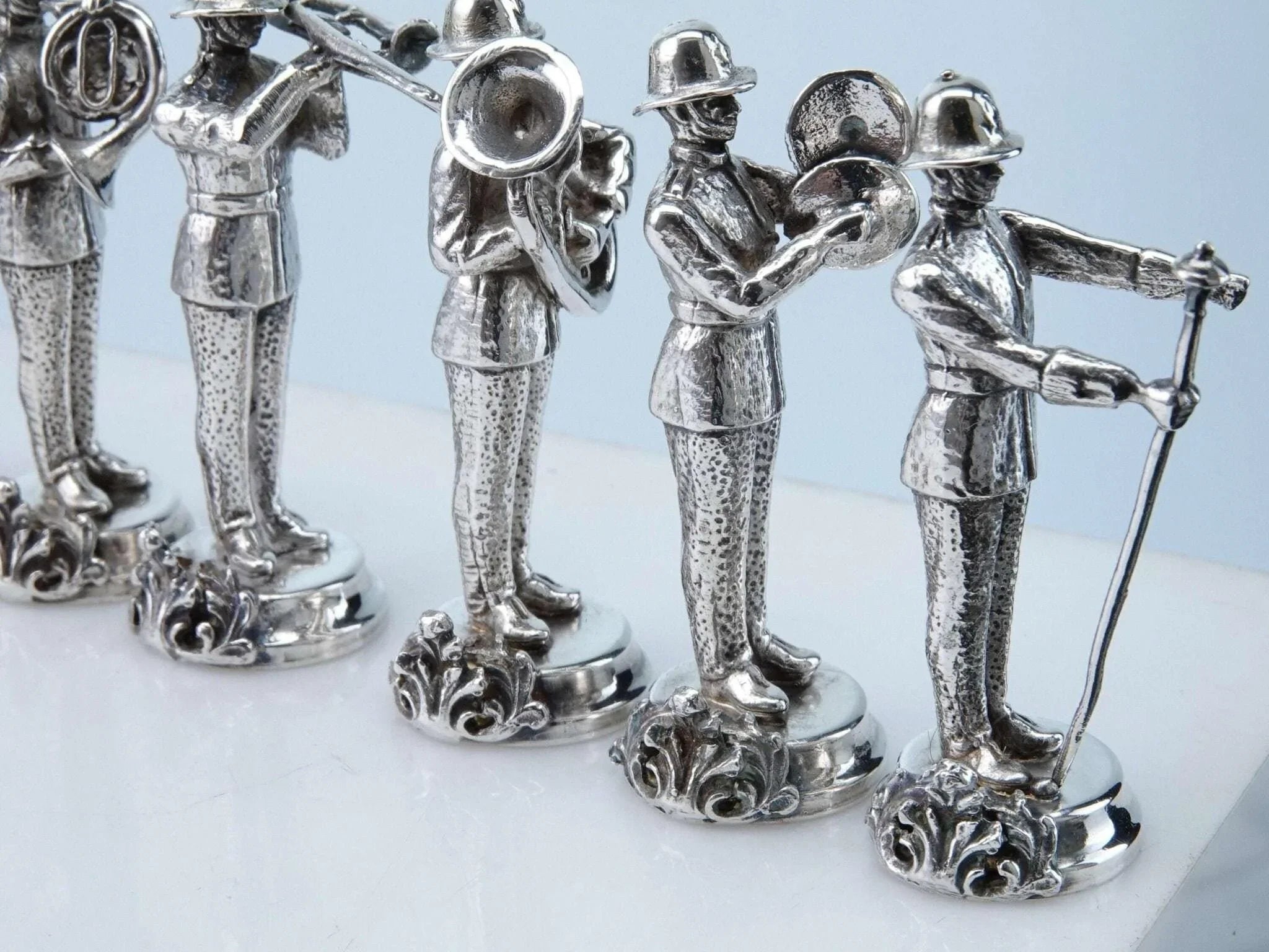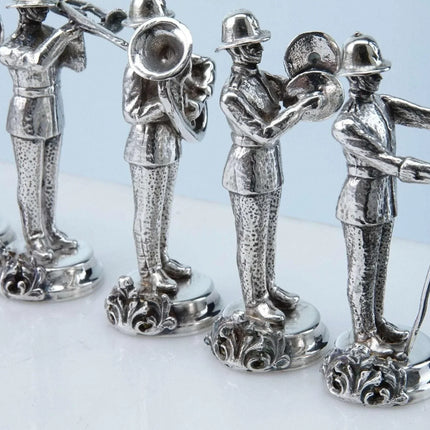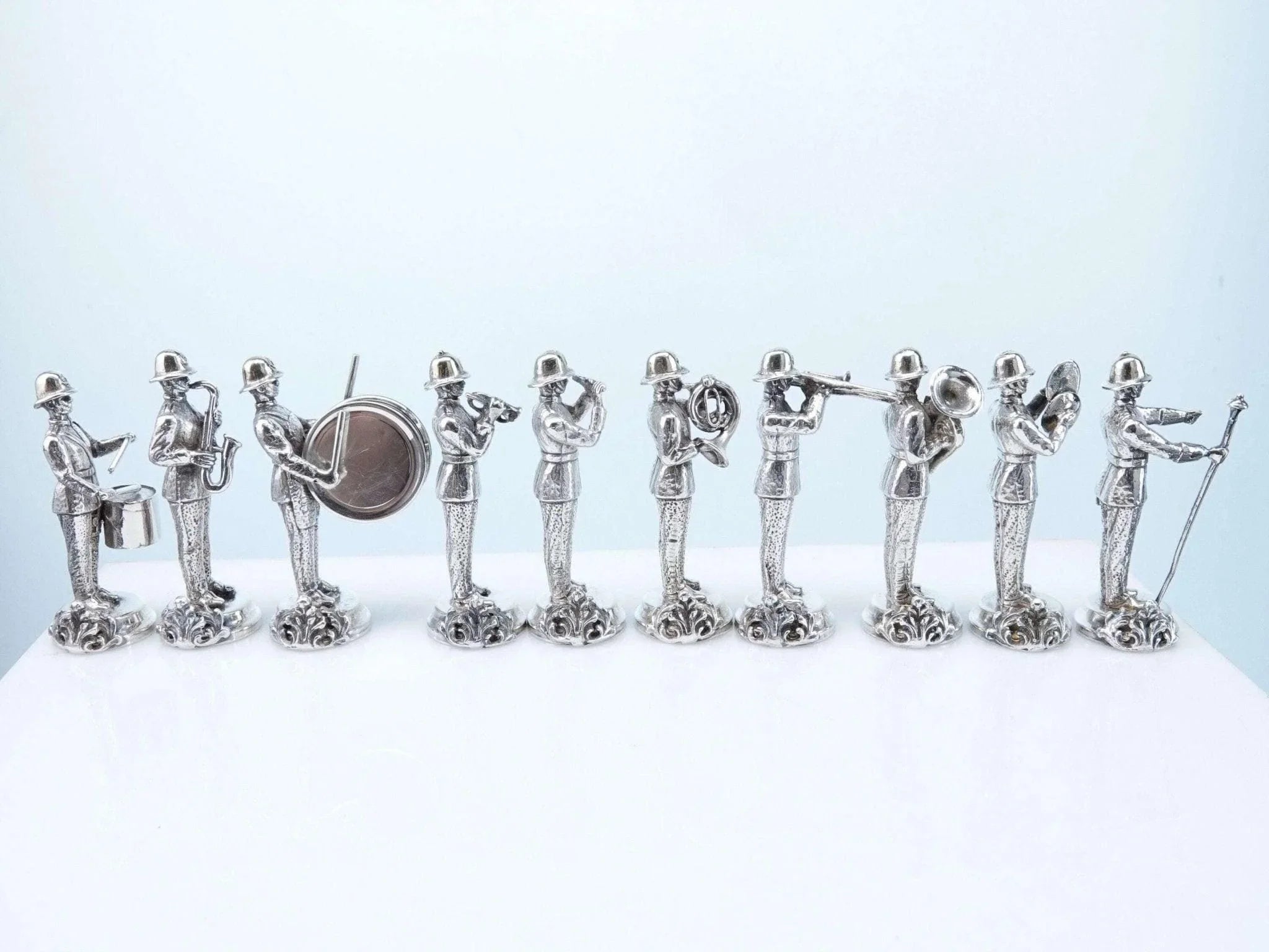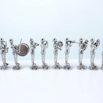 Italian 800 Silver Place Card Holders representing a Military Marching Band by<br>Fabbrica Argenteria Fiorentina Di Bartolini Bartolozzi (10). Selling the set of<br>10 show, very heavy for their size solid 80% silver averaging about 35 grams<br>each in weight. No damage or issues, from the third quarter of the 20th century.<br>Extremely fine quality casting and a great design. 2 3/8" tall with 7/8" bases,<br>they each have a slot behind the Fleur de lys to hold a place card.<br><br>Tested 80% silver and the mark on the base of each one 215fl indicates the maker<br>by Italian standards. These are about 60-70 years old and of a quality that just<br>can't be matched today and if it were it would be by someone like Tiffany or<br>Cartier and they would be 1k each or more.<br><br>tw210