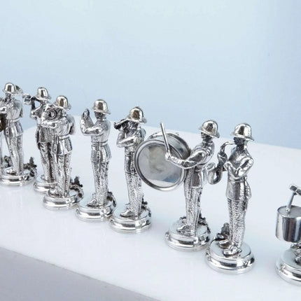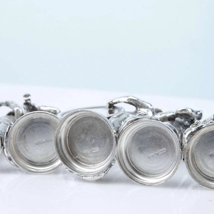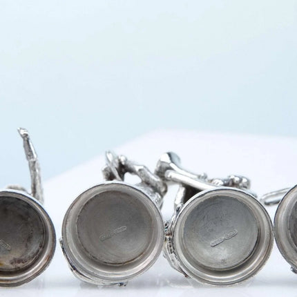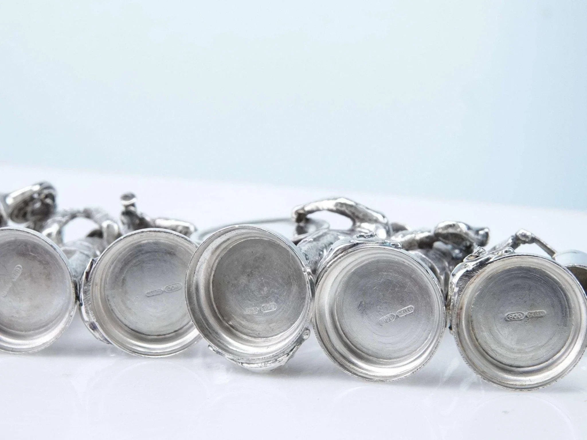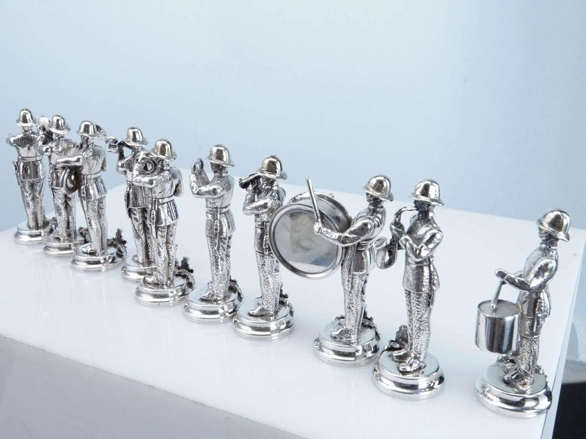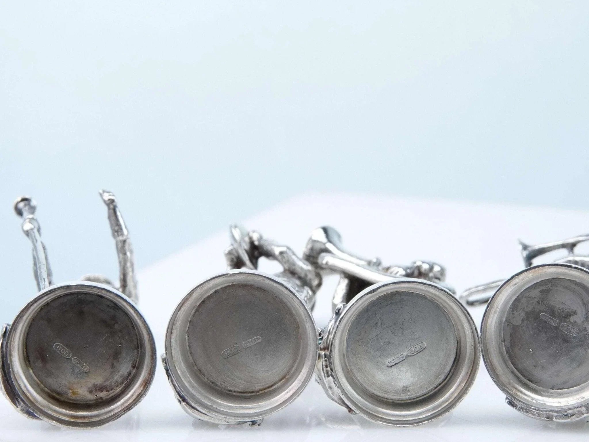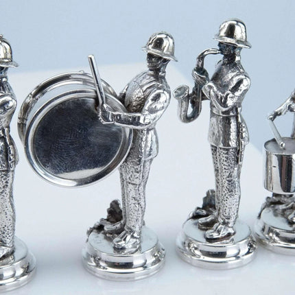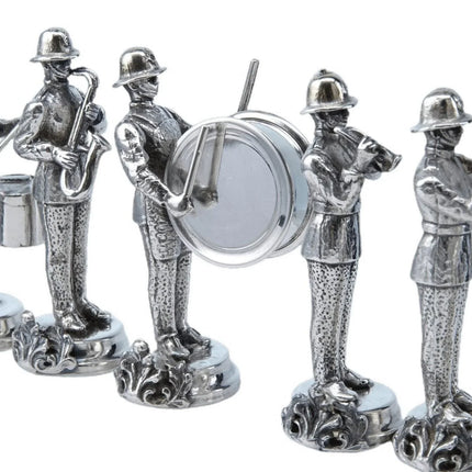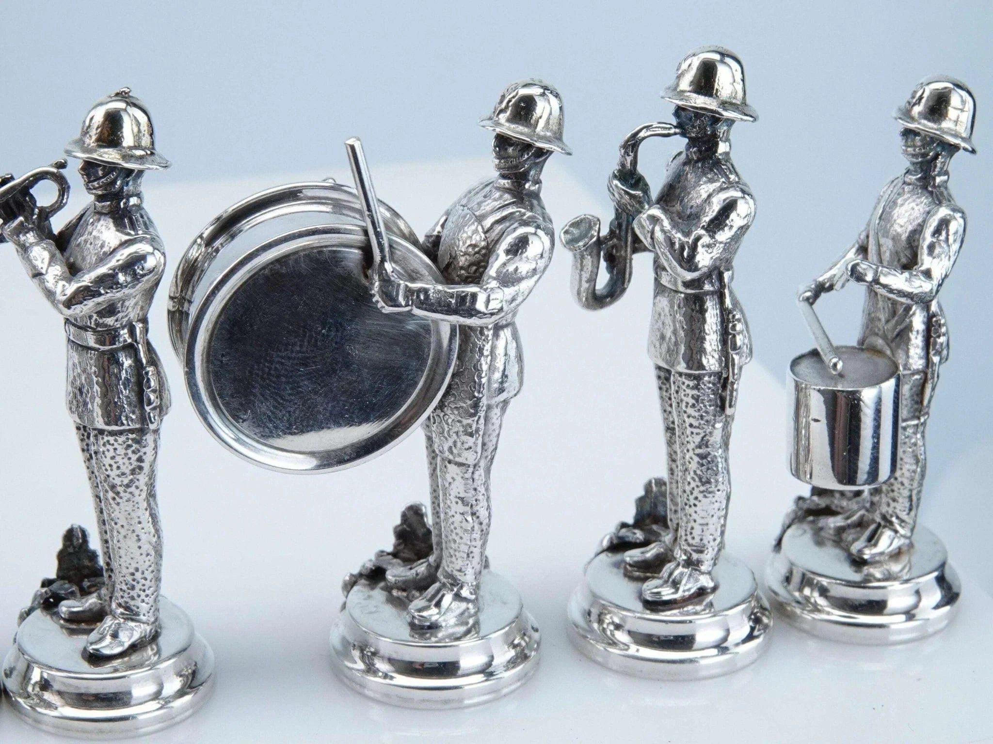 Italian 800 Silver Place Card Holders representing a Military Marching Band by<br>Fabbrica Argenteria Fiorentina Di Bartolini Bartolozzi (10). Selling the set of<br>10 show, very heavy for their size solid 80% silver averaging about 35 grams<br>each in weight. No damage or issues, from the third quarter of the 20th century.<br>Extremely fine quality casting and a great design. 2 3/8" tall with 7/8" bases,<br>they each have a slot behind the Fleur de lys to hold a place card.<br><br>Tested 80% silver and the mark on the base of each one 215fl indicates the maker<br>by Italian standards. These are about 60-70 years old and of a quality that just<br>can't be matched today and if it were it would be by someone like Tiffany or<br>Cartier and they would be 1k each or more.<br><br>tw210