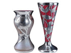 c1900 Art Nouveau Sterling Silver Overlay Art glass Vases. Selling both vases<br>shown, Loetz Iridescent 4.25" tall, The other pink cased Opaline 5 1/8" tall<br>with Sterling fish mark. Both tested sterling but I could find no markings on<br>the Loetz piece which is typical.. Neither with any cracks, chips, or<br>restorations.<br>tw134