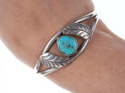 Vintage Native American sterling bracelet with turquoise. Fits up to a 6.25"<br>wrist, unmarked.<br><br>All precious metals are tested and guaranteed, any Native American jewelry<br>referred to as Silver or Sterling is guaranteed to be a minimum of 90% (coin)<br>silver and possibly higher content. Anything marked is guaranteed to be what<br>it's marked, most bracelets are photographed on a 6" wrist (non hairy), rings<br>photographed on the appropriate sized finger when possible. With bracelets if<br>the measurement is not given in the description then inside circumference is<br>shown where the metal meets the number on the the cloth tape measure.
