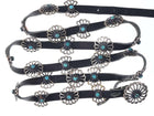 Native American Tufa Cast sterling and turquoise concho belt, signed at the<br>buckle LEB, the pierced circular floral form buckle with a central turquoise<br>cabochon, the belt with 23 other conchos in circular floral and bow tie forms,<br>each with a centered turquoise cabochon, belt: approx 50"l (end to end), buckle:<br>approx 1.25" diam, circular conchos: approx 1 1/8" diam, bow tie conchos: approx<br>1 1/8"h, 0.75"w, 161 grams total weight.