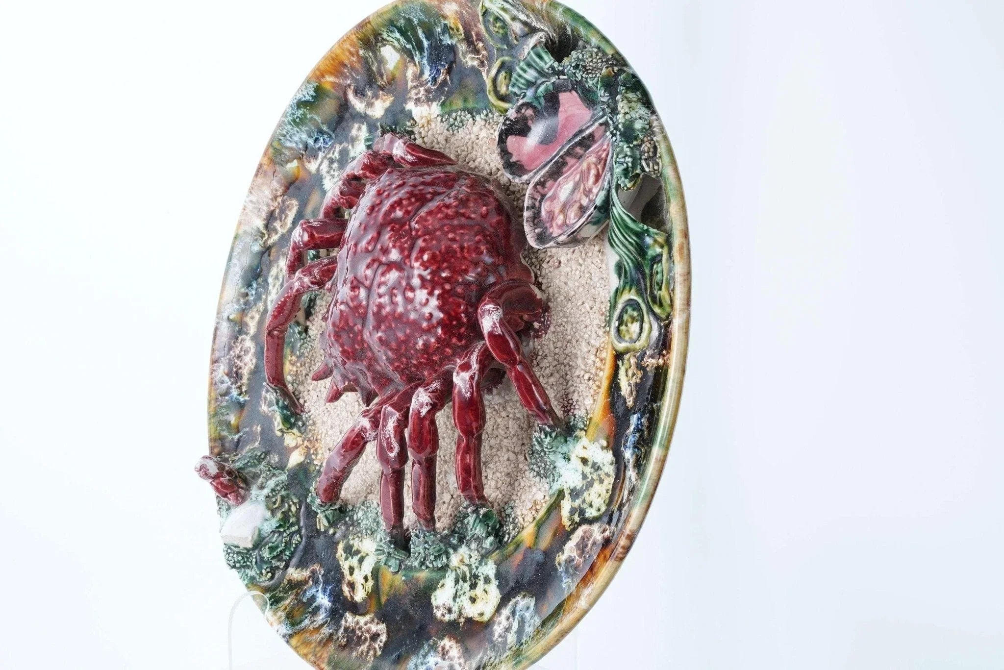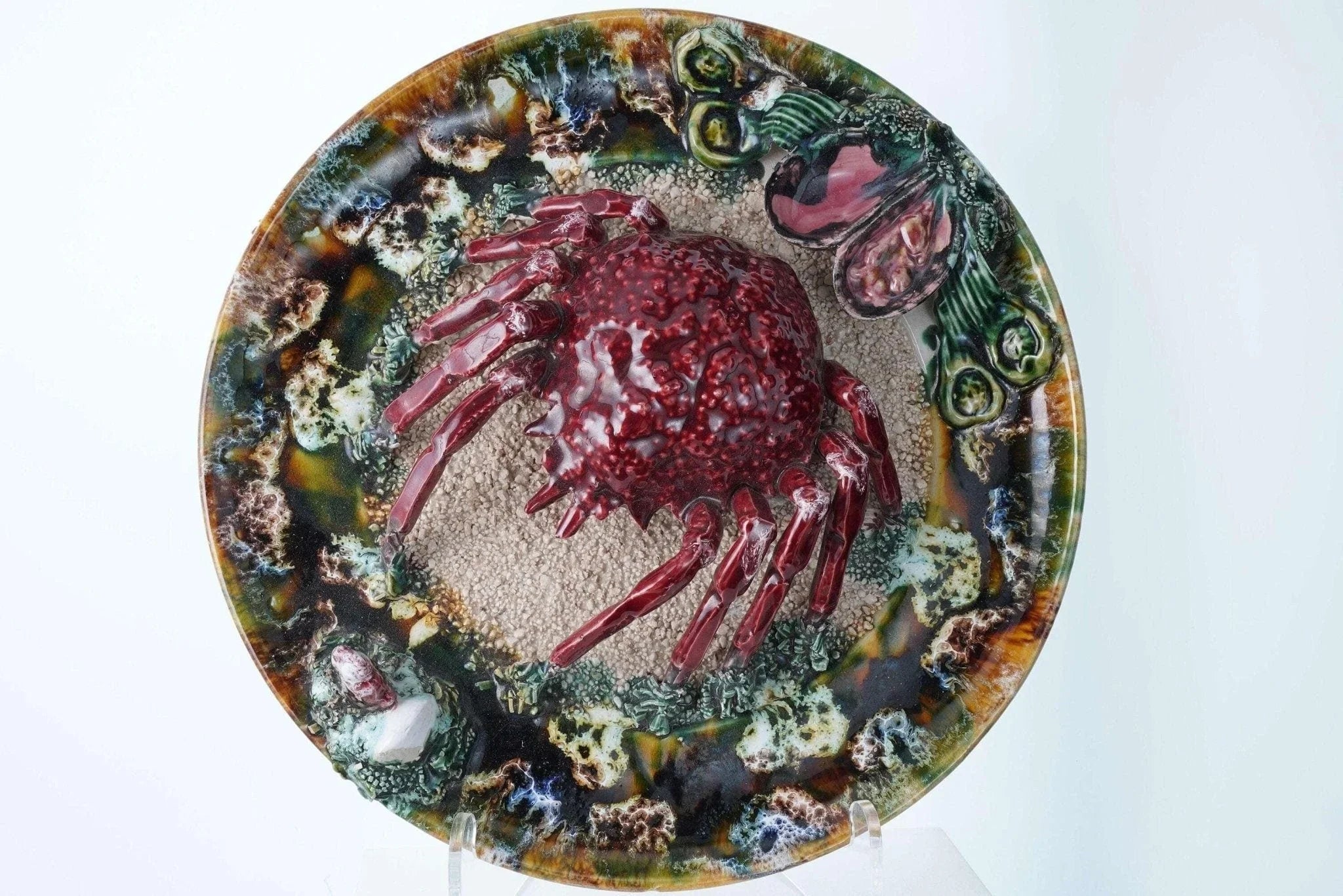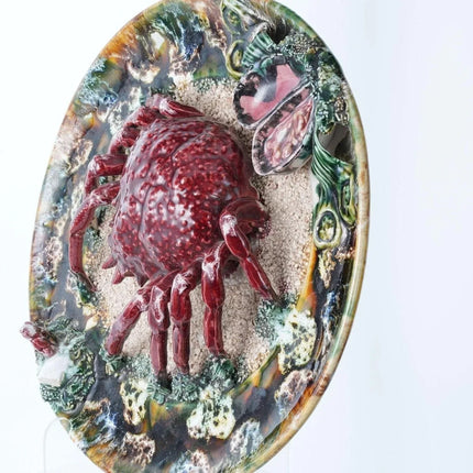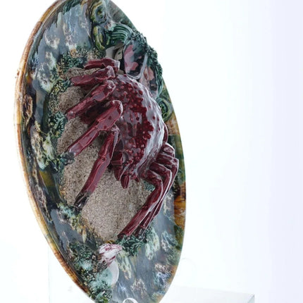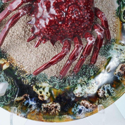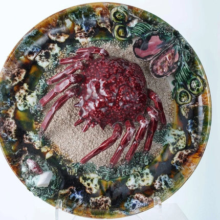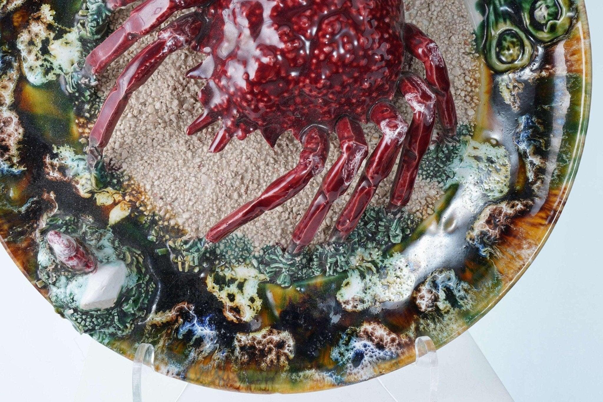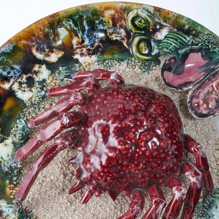 Large Portuguese Majolica Palissy Ware Crab Charger. Great piece from the first<br>half of the 20th century with no cracks or restorations, a very small amount of<br>loss under very close inspection Actually I only see two small spots, one close<br>to the rim past the white rock in the direction the crab is facing and another<br>tiny spot on the green leaf next to the shells. 13" wide 4 pounds 2 ounces.<br>tw162