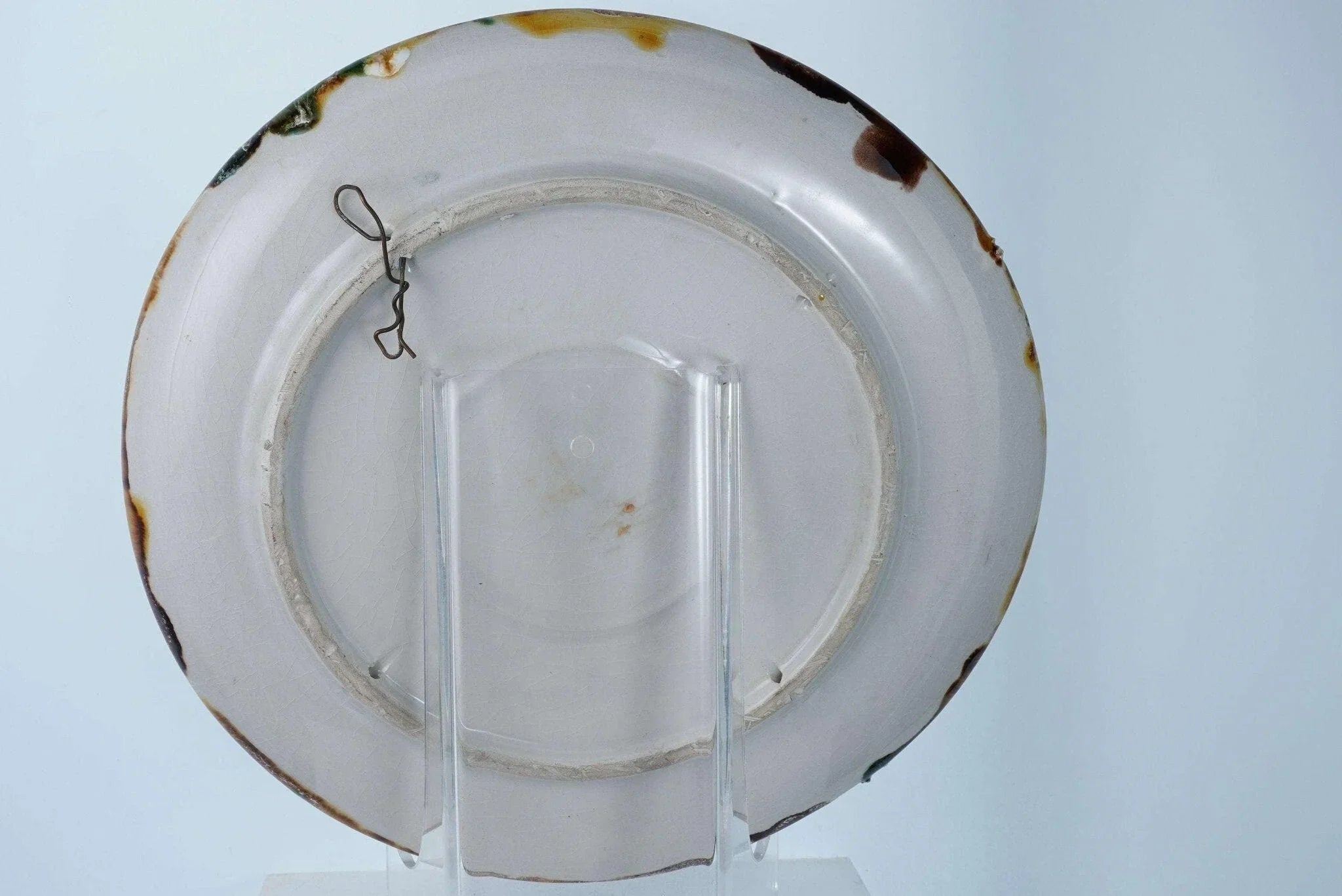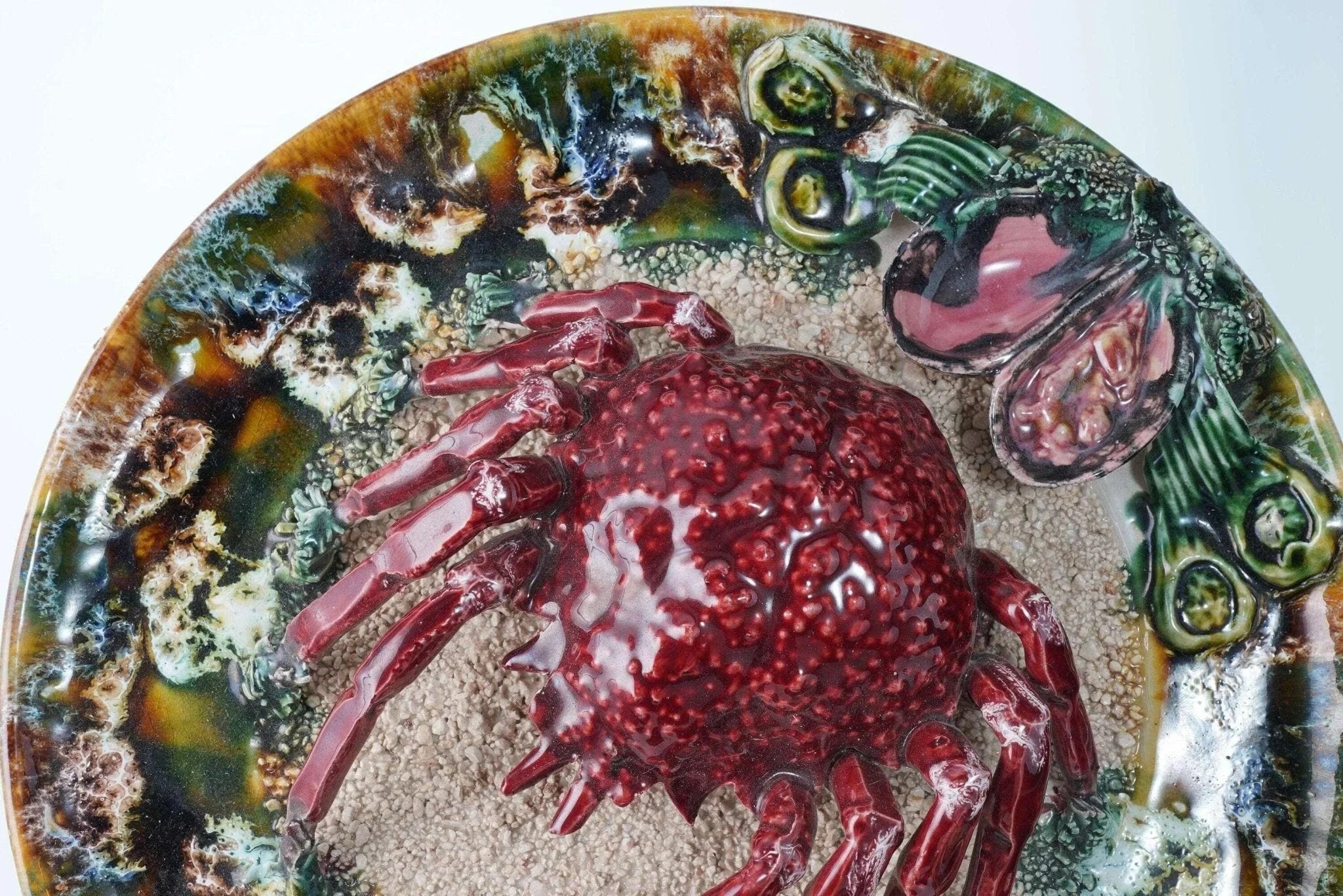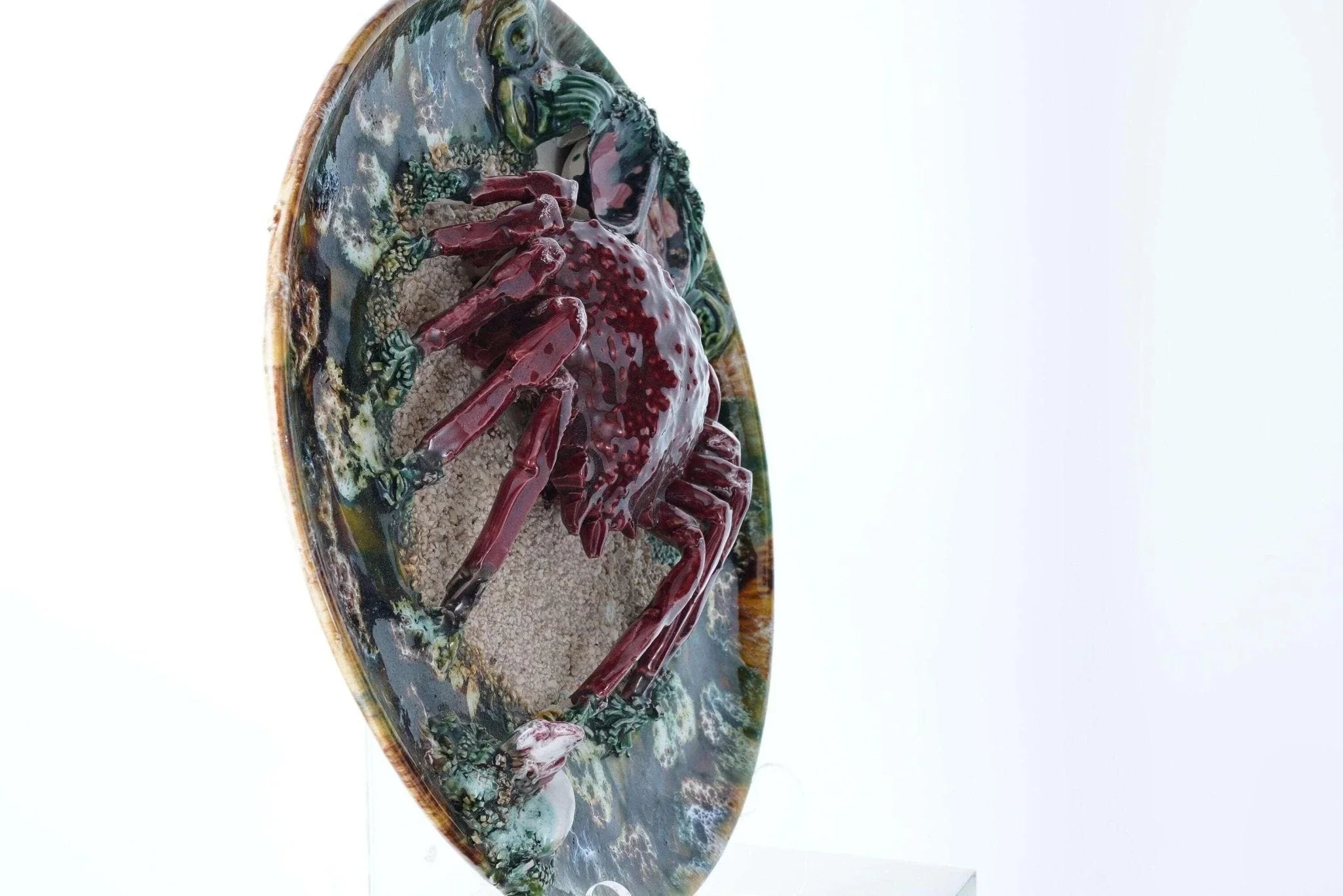 Large Portuguese Majolica Palissy Ware Crab Charger. Great piece from the first<br>half of the 20th century with no cracks or restorations, a very small amount of<br>loss under very close inspection Actually I only see two small spots, one close<br>to the rim past the white rock in the direction the crab is facing and another<br>tiny spot on the green leaf next to the shells. 13" wide 4 pounds 2 ounces.<br>tw162