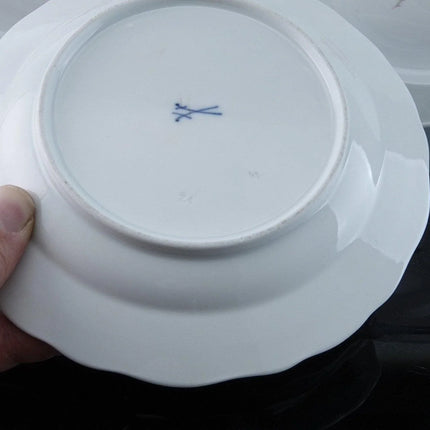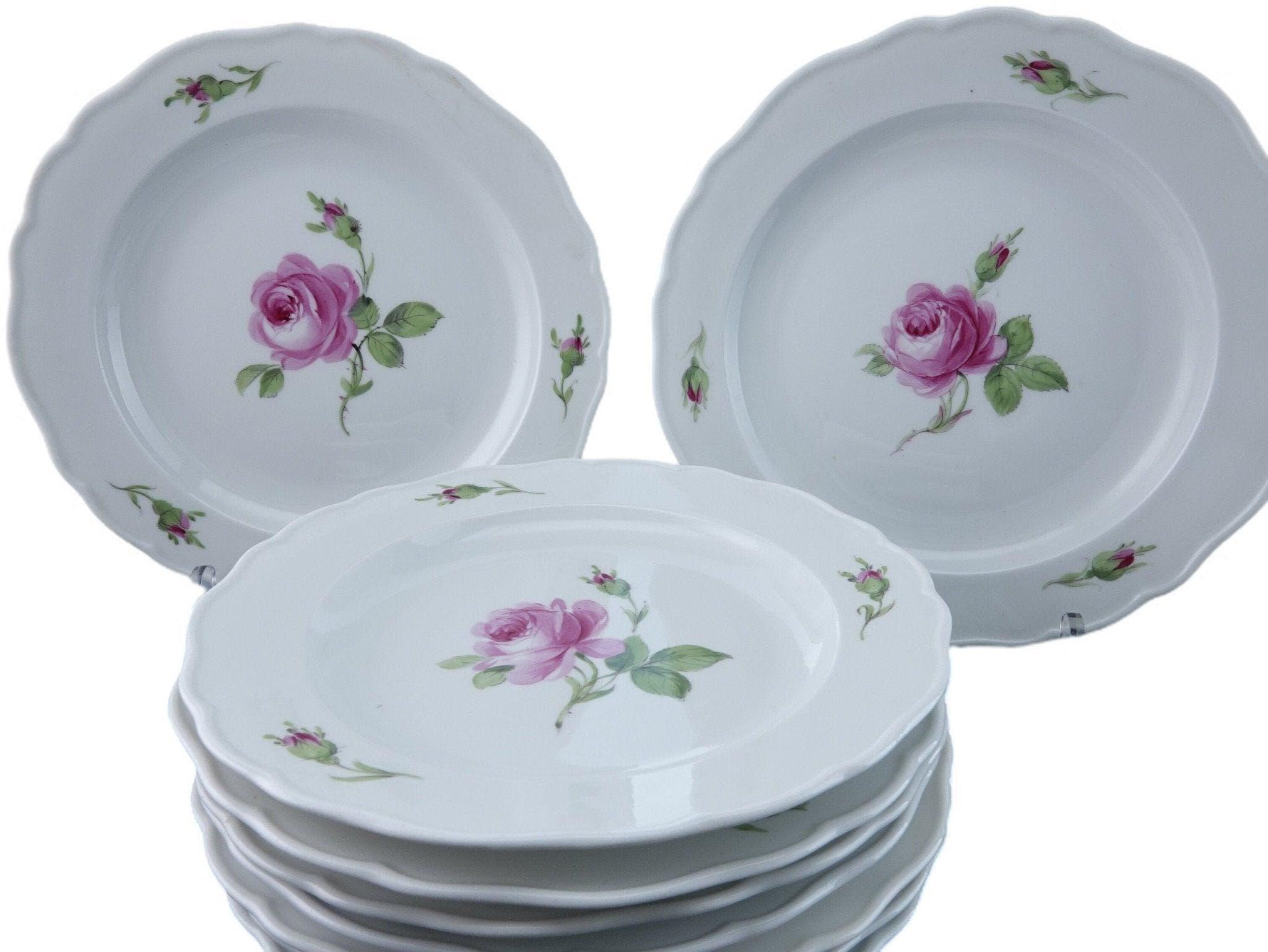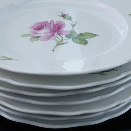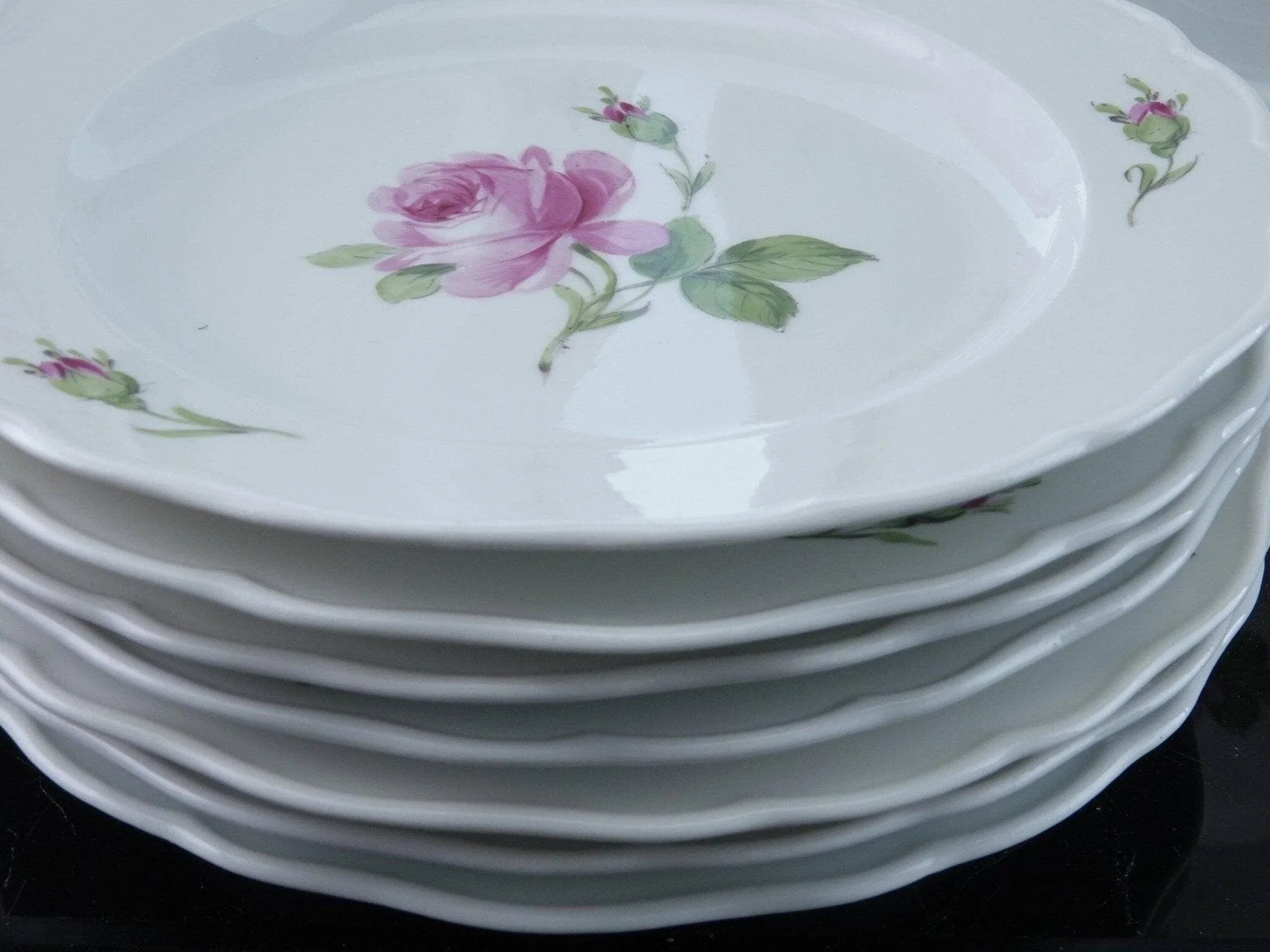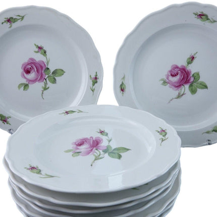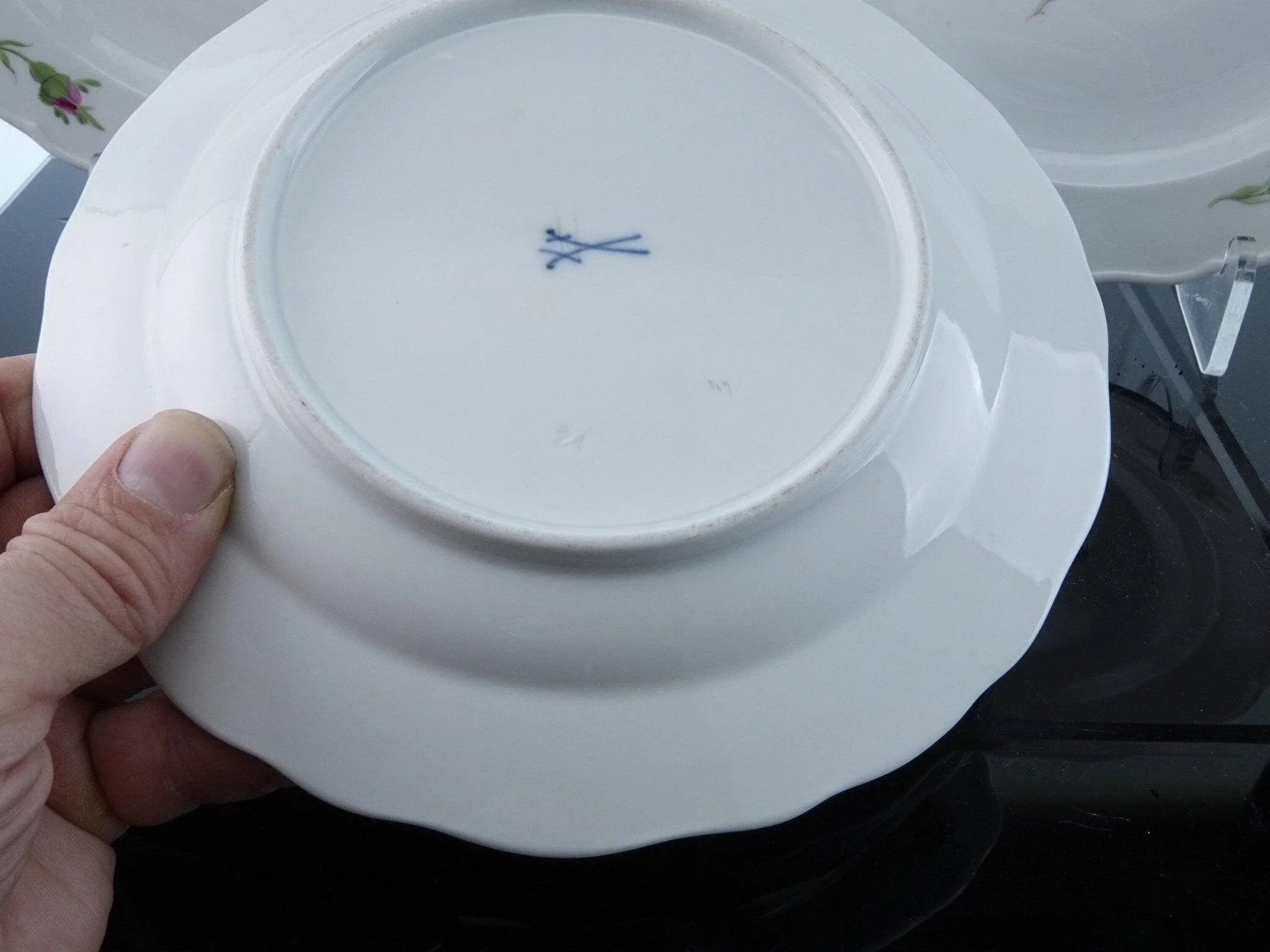 9 Meissen Rose Plates (No Trim). Selling two 8 3/8" plates and Seven 7 5/8" plates shown. All with no cracks, chips, utensil marks, or noticeable flaws, they do have two lines through the mark designating it as a second I believe but I can find no issues or flaws. All hand painted with precision. isshelf