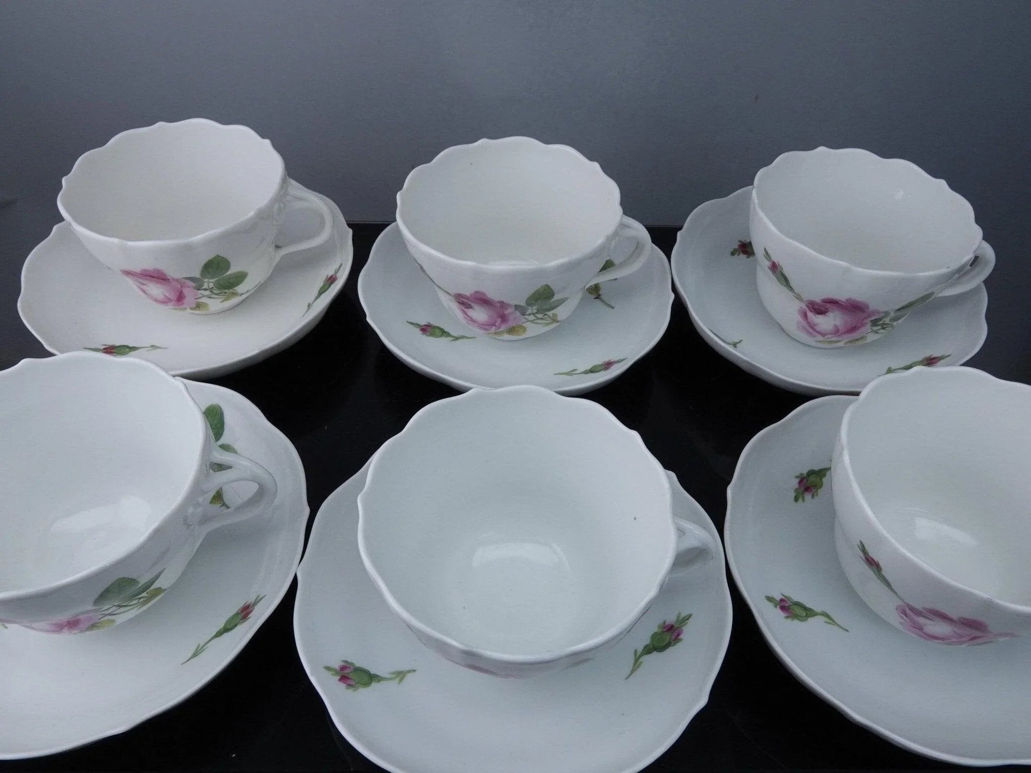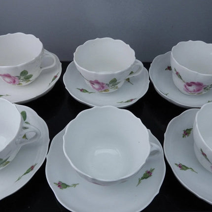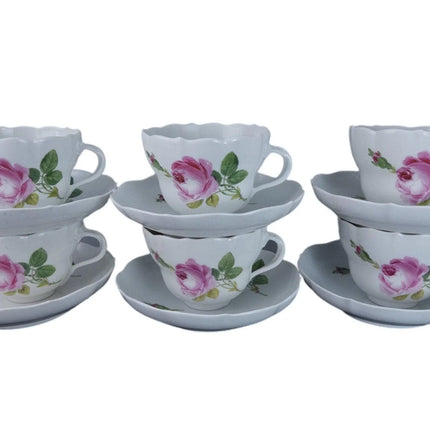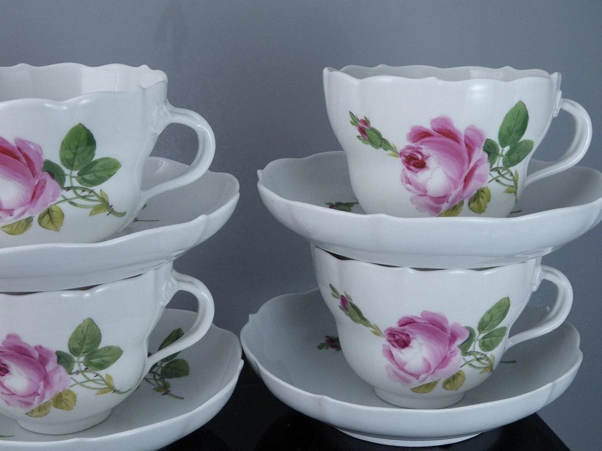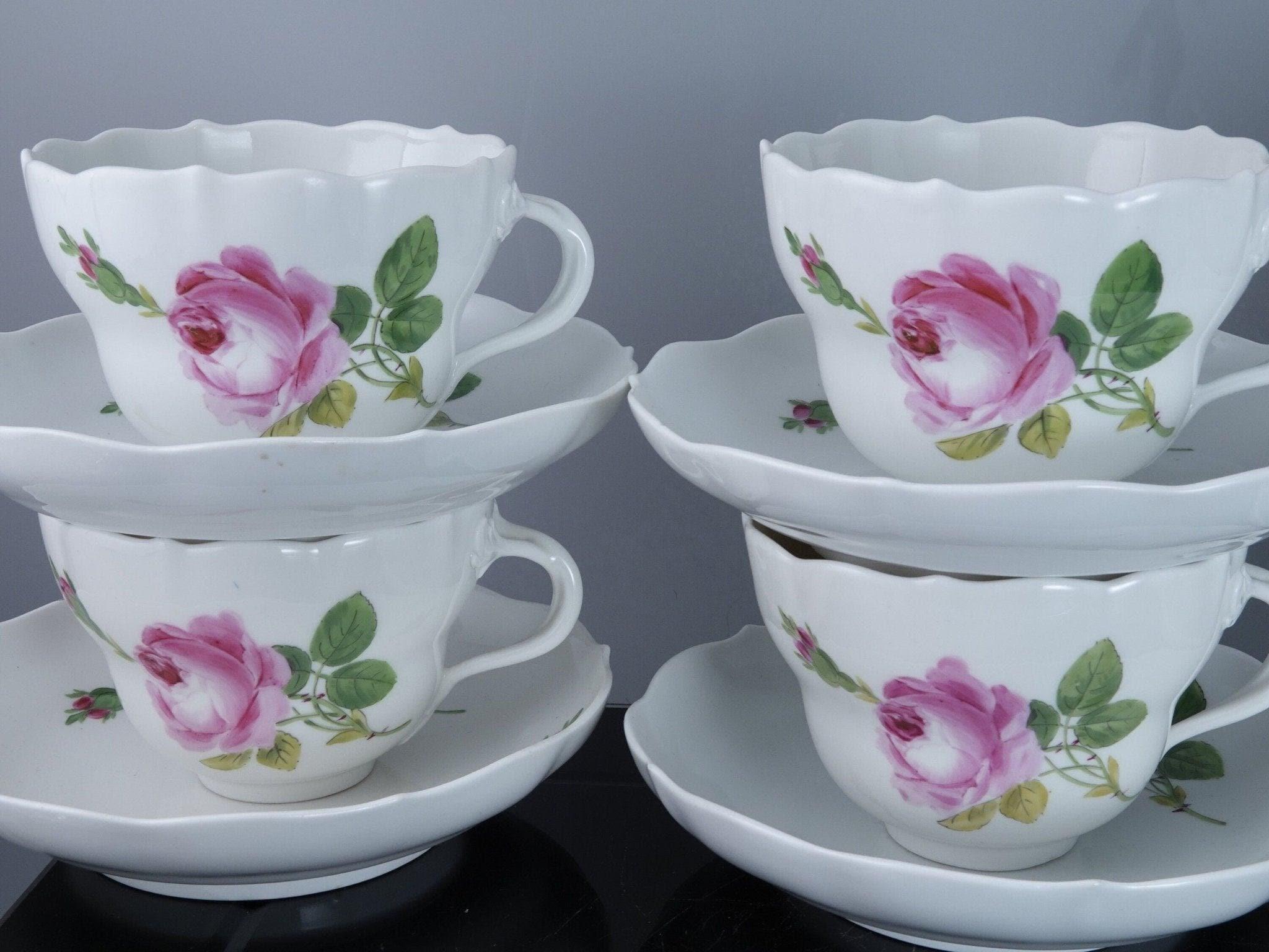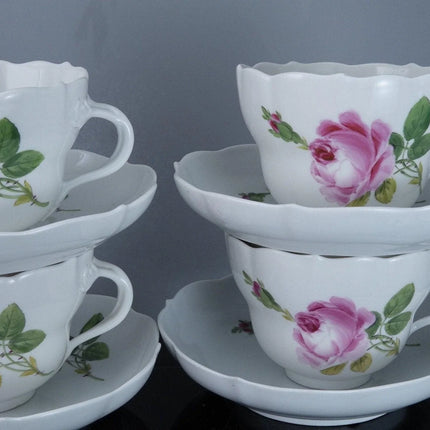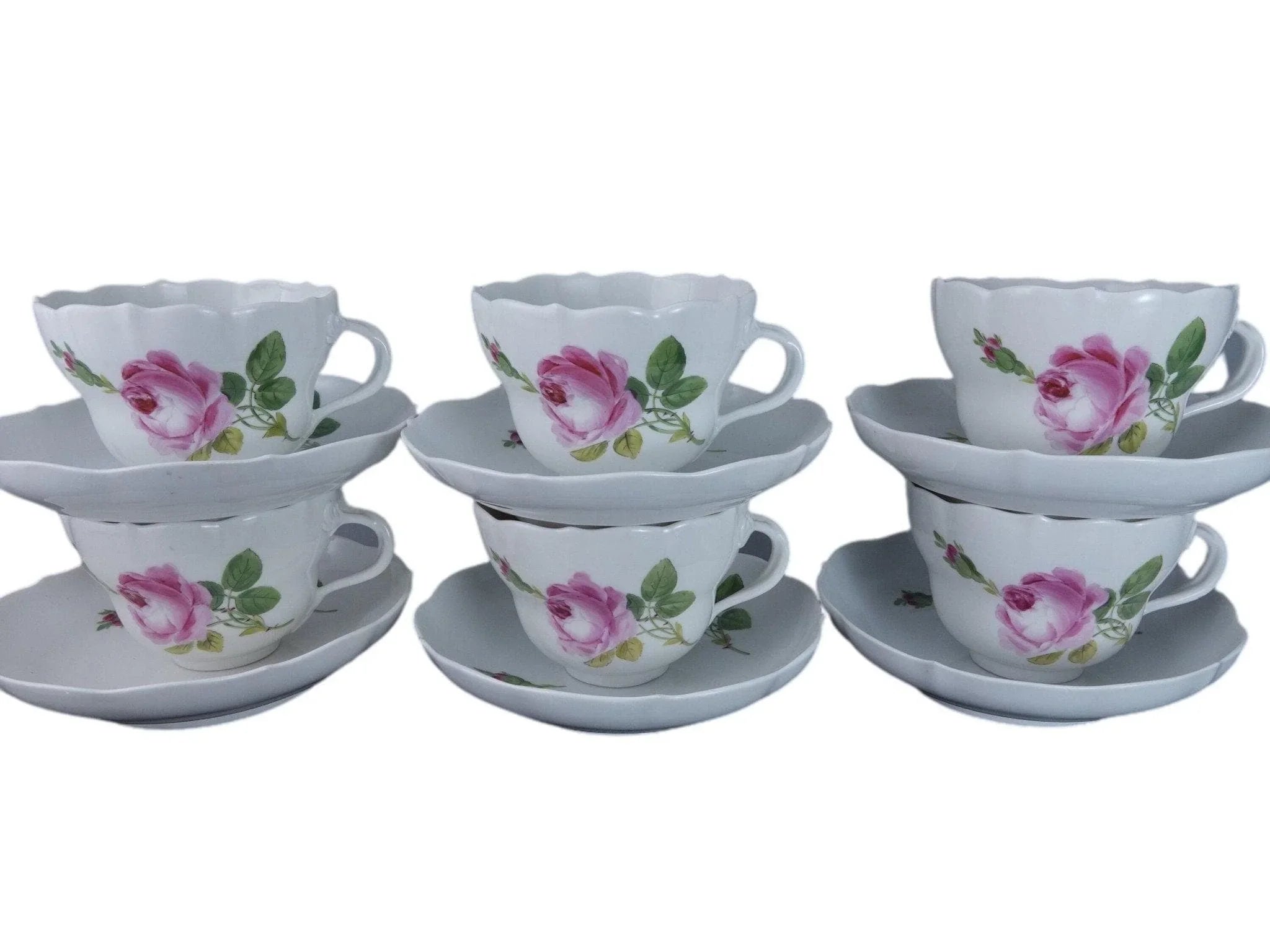 6 Meissen Rose Tea Cups and Saucers (No Trim). Selling the six cups and saucers shown. Cups 2.75" tall x 3 7/8" wide at rim, saucers 6" wide. Two saucers with