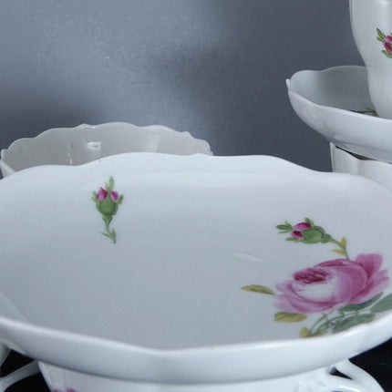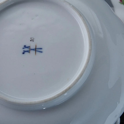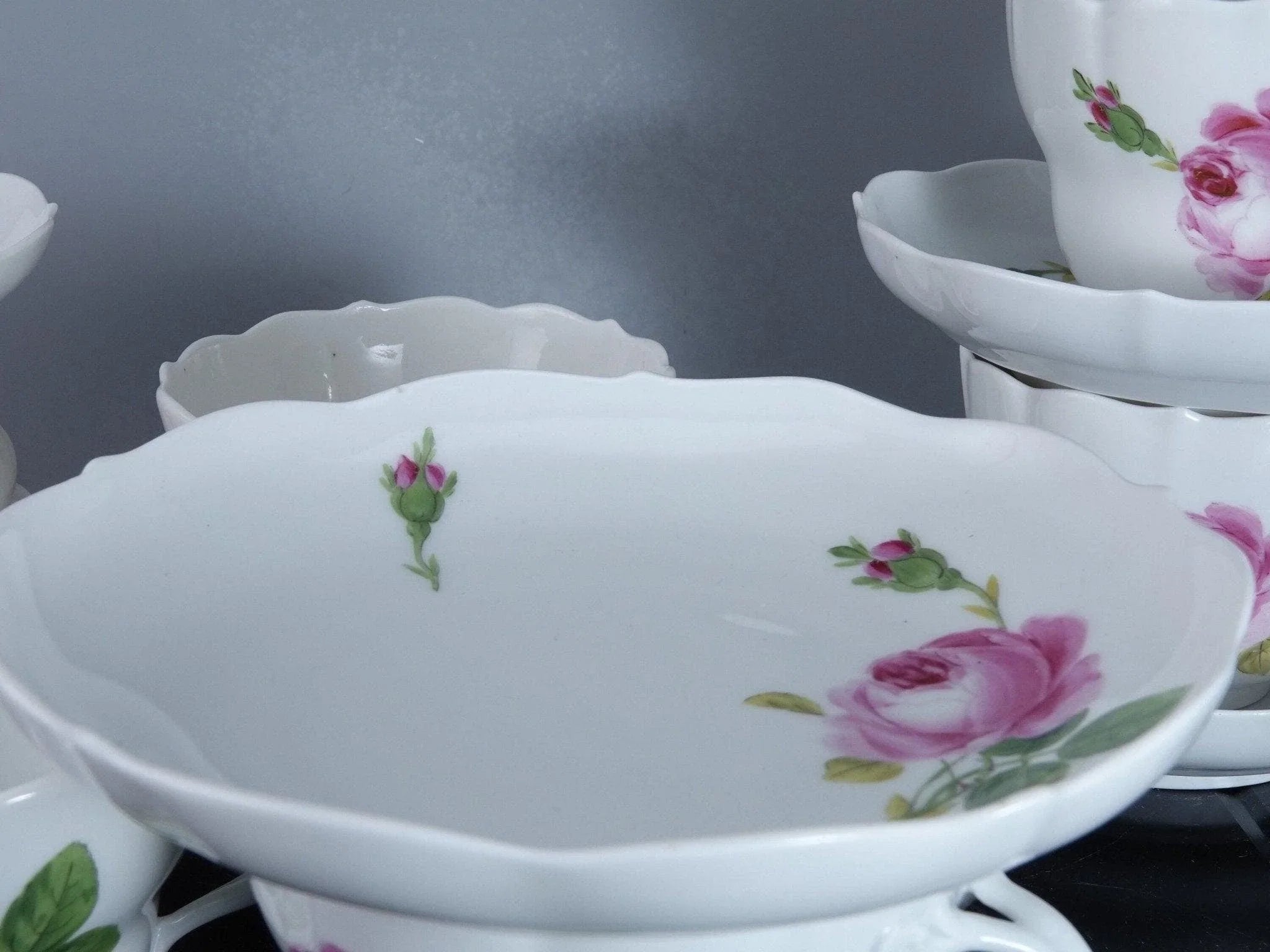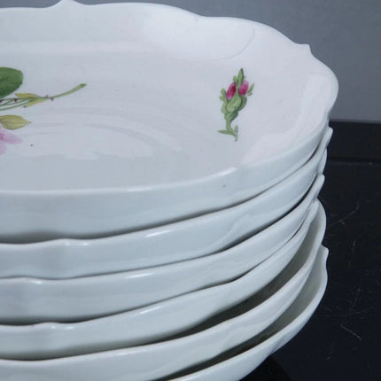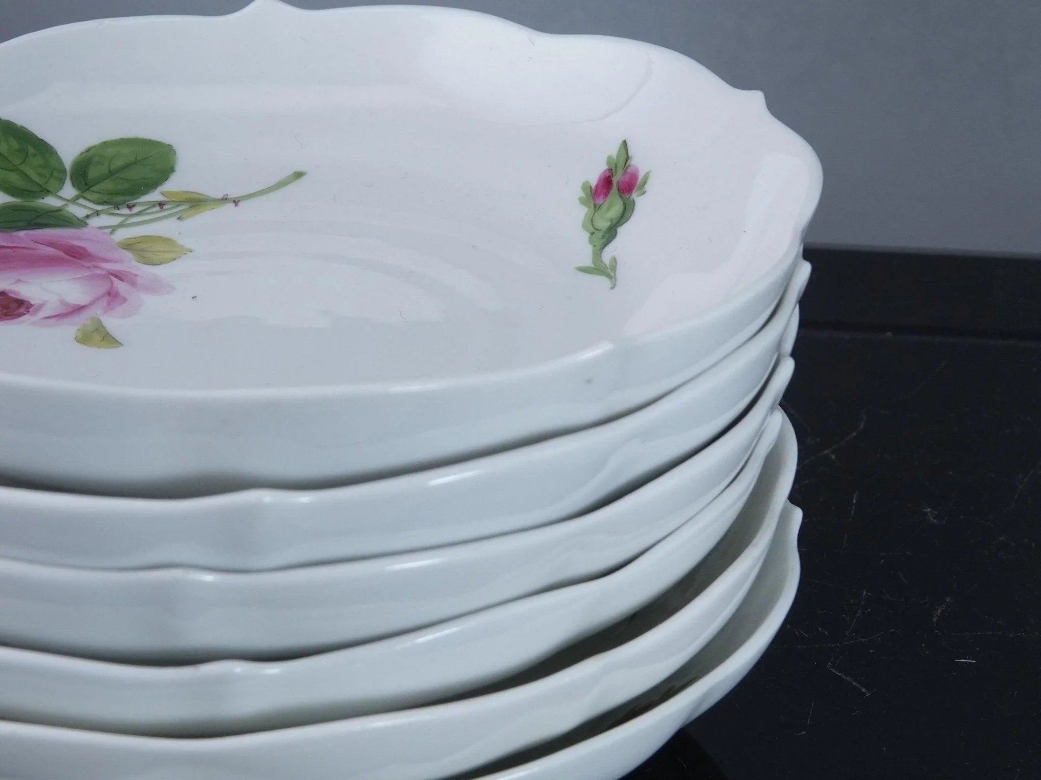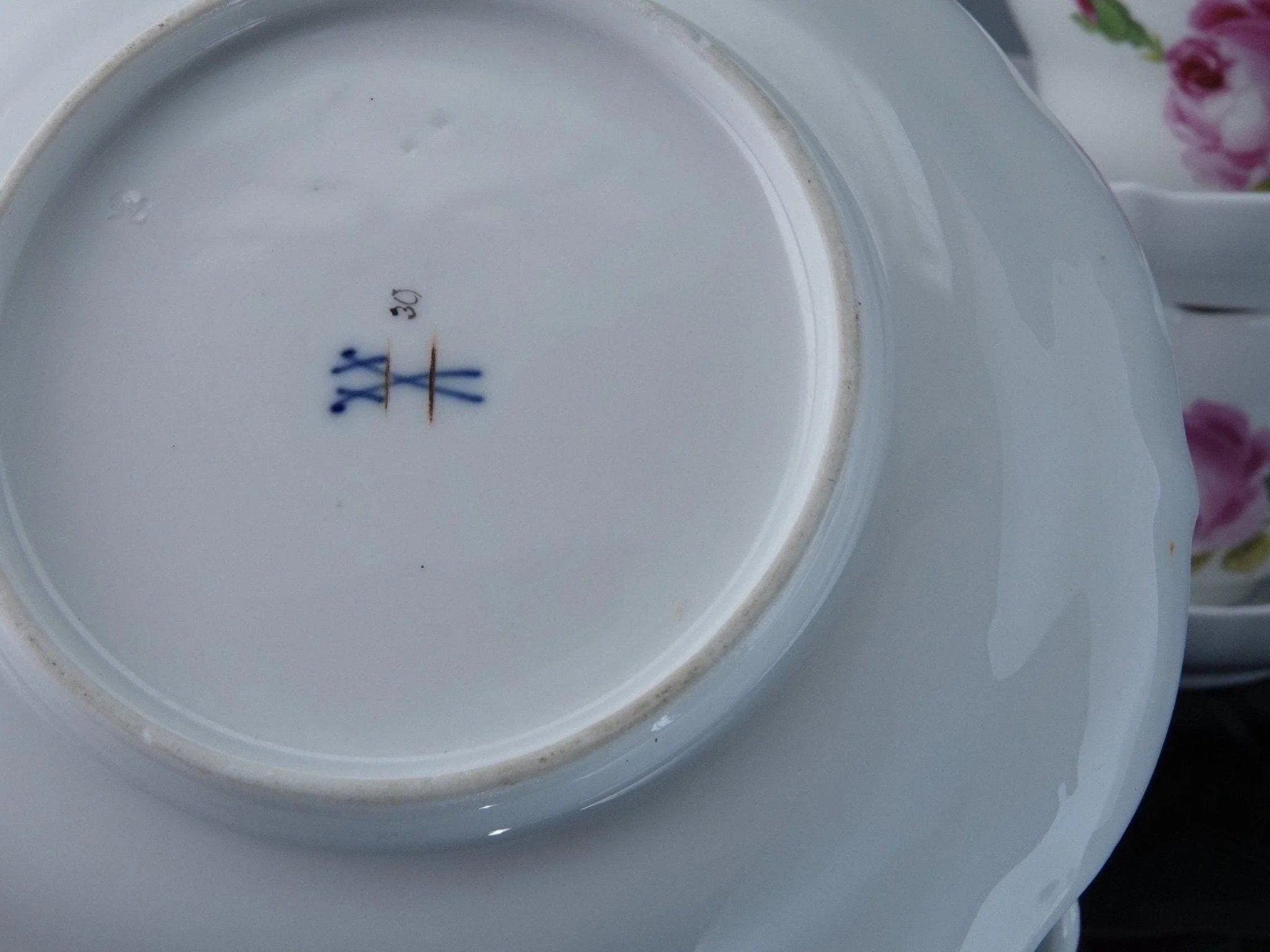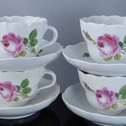6 Meissen Rose Tea Cups and Saucers (No Trim). Selling the six cups and saucers shown. Cups 2.75" tall x 3 7/8" wide at rim, saucers 6" wide. Two saucers with
