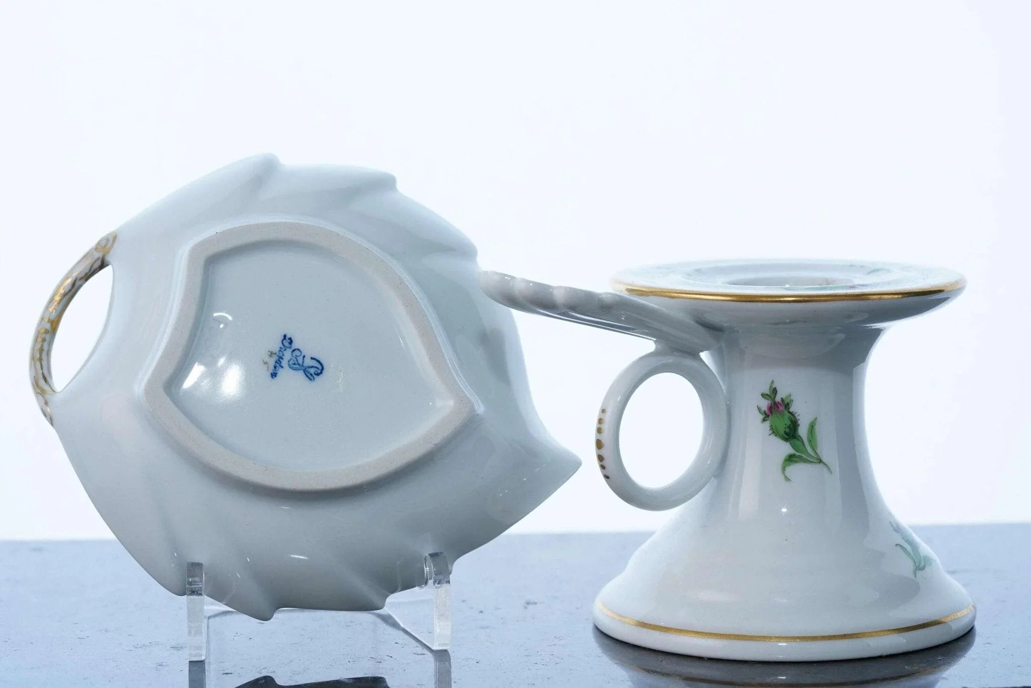 Meissen Rose Pink Chamberstick and Carl Thieme Dresden Trinket dish. Selling<br>both pieces with no damage for one price. Meissen has two lines through mark but<br>I can find no flaws. Chamberstick is 2.5" tall, leaf is 4". Both hand painted,<br>high quality.<br>B61