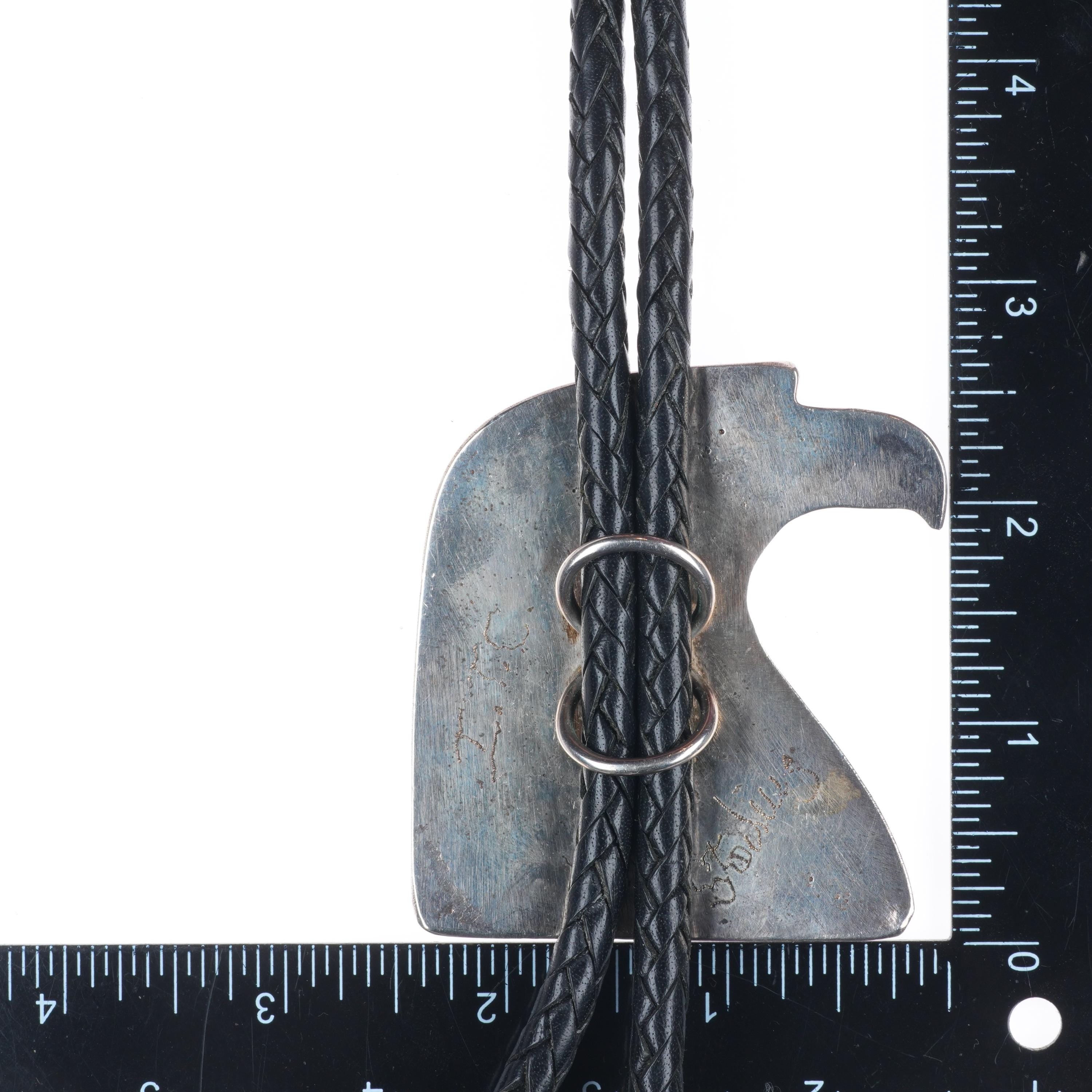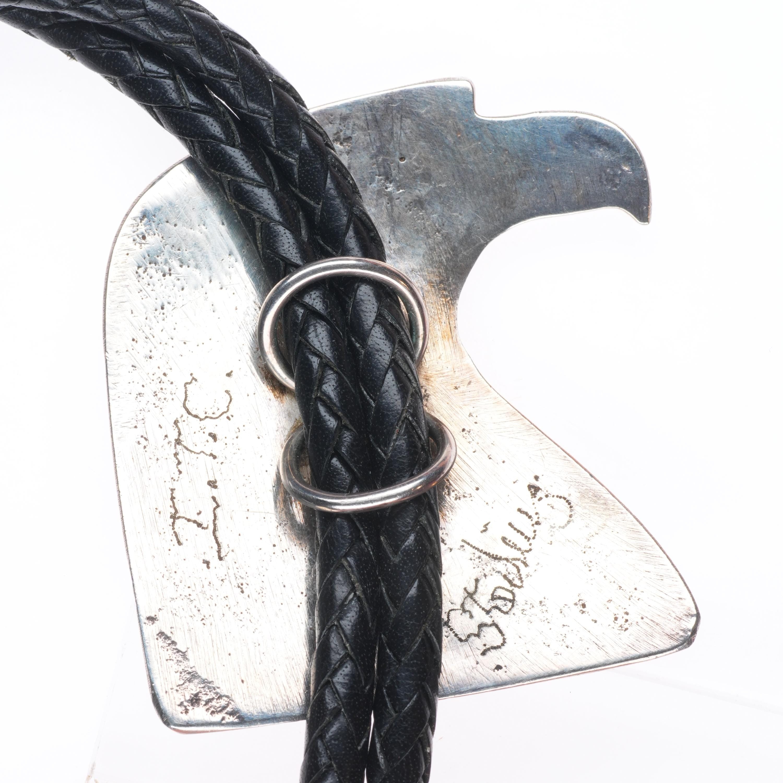 Heavy vintage southwestern sterling silver patriotic eagle bolo tie fancy tips. Tested and guaranteed solid sterling silver slide and tips. Weight and measurements in pictures. 60" long. Circa last quarter of the 20th century. Illegible, unknown hallmark.