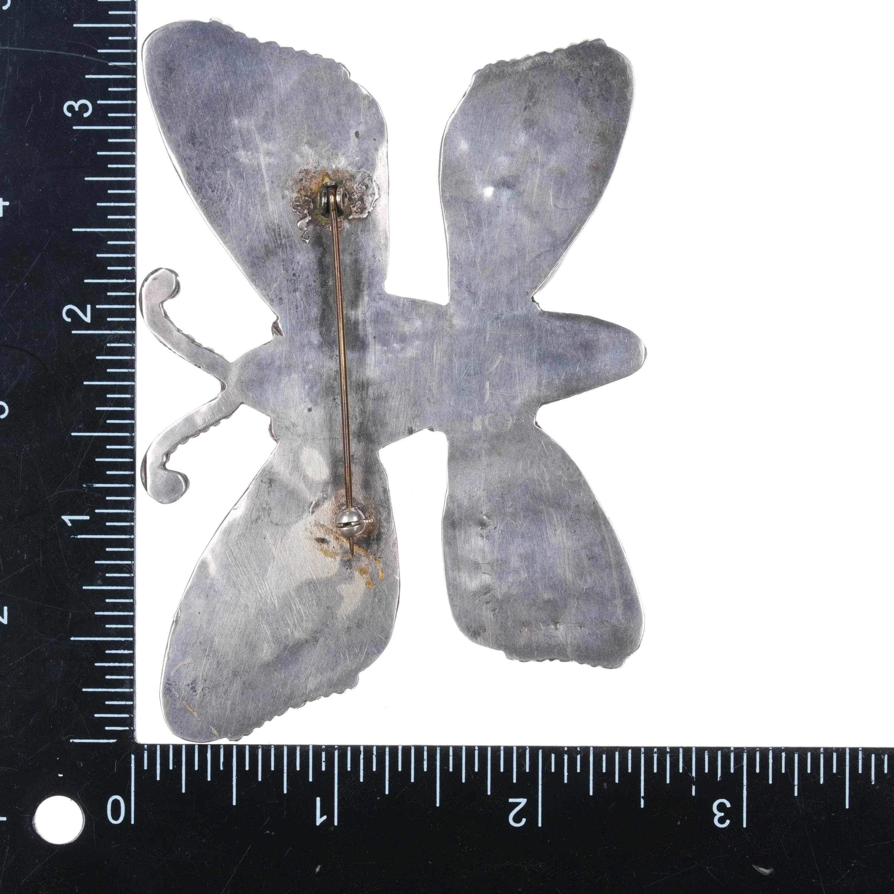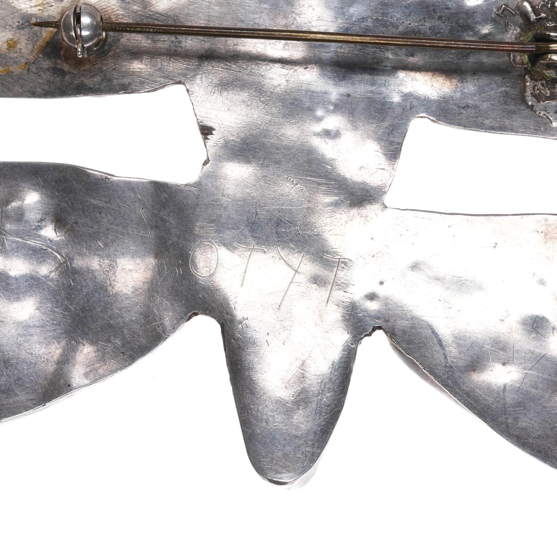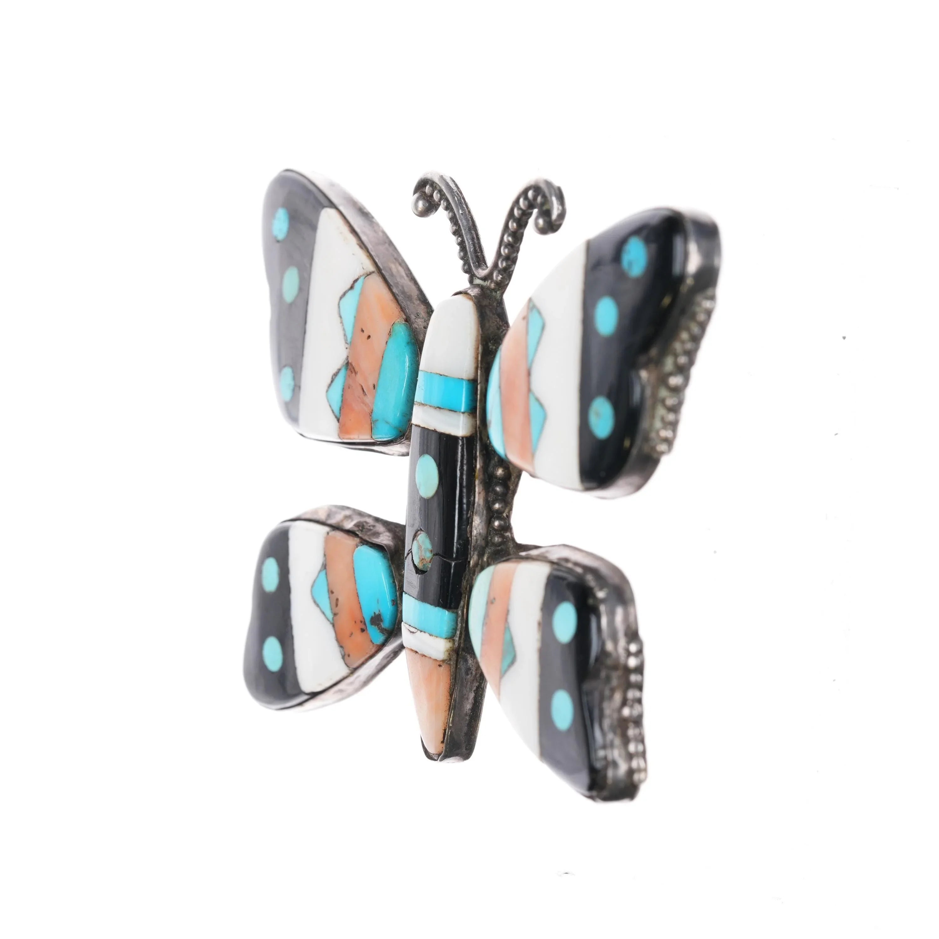 Huge 1940‘s Leo Poblano Zuni multi-stone inlay butterfly pin sterling silver. Weight and measurements in pics, all solid sterling. All stones/inlay secure in bezels with very old fracture to jet inlay in center at bottom inlaid turquoise. Circa mid 20th century, unmarked other than C.G. Wallace code on the reverse side. Attributed to Leo Poblano family. Very big pin, it would be a big belt buckle by most standards. The "Average" men‘s belt buckle is 3" wide, this is 3.5" wide.
