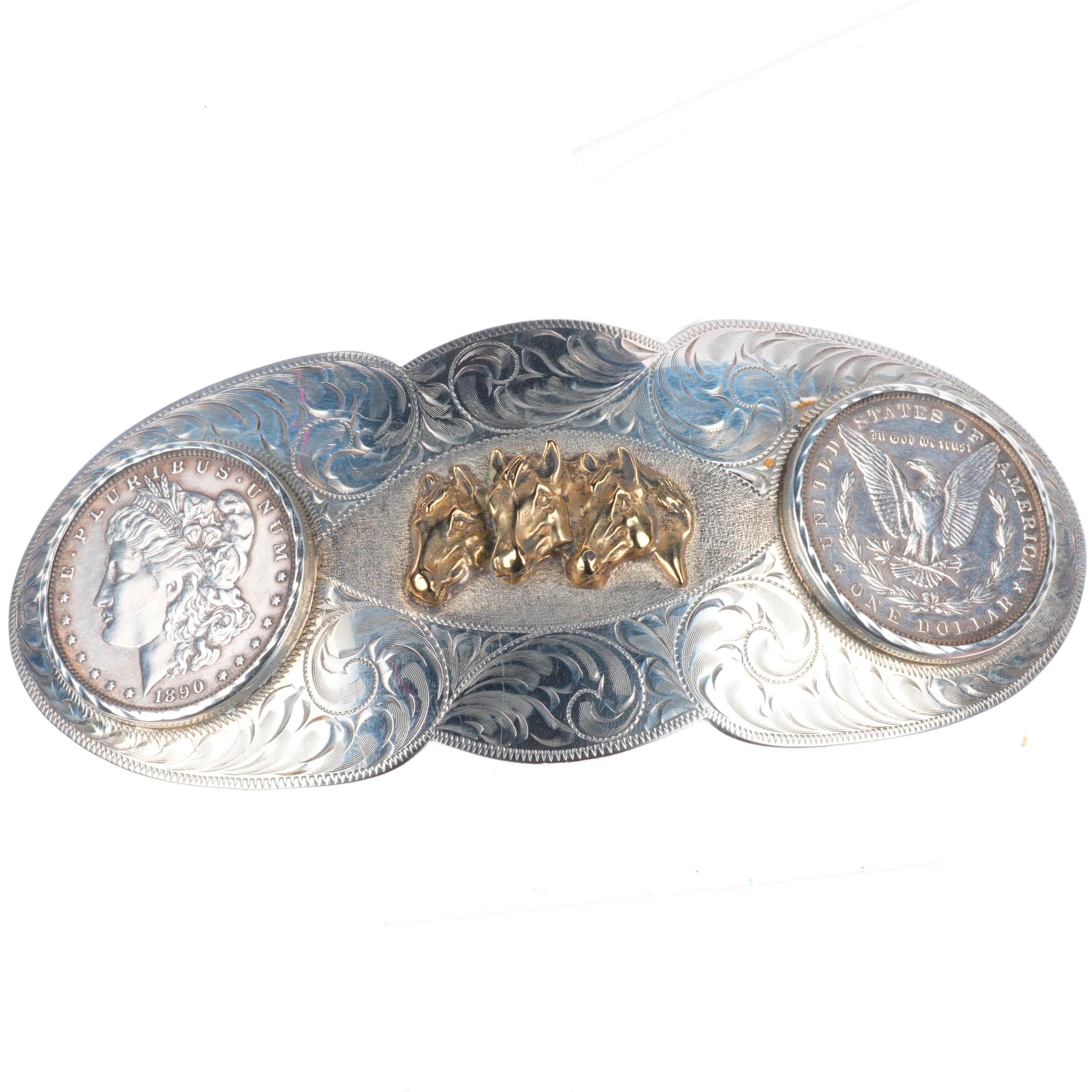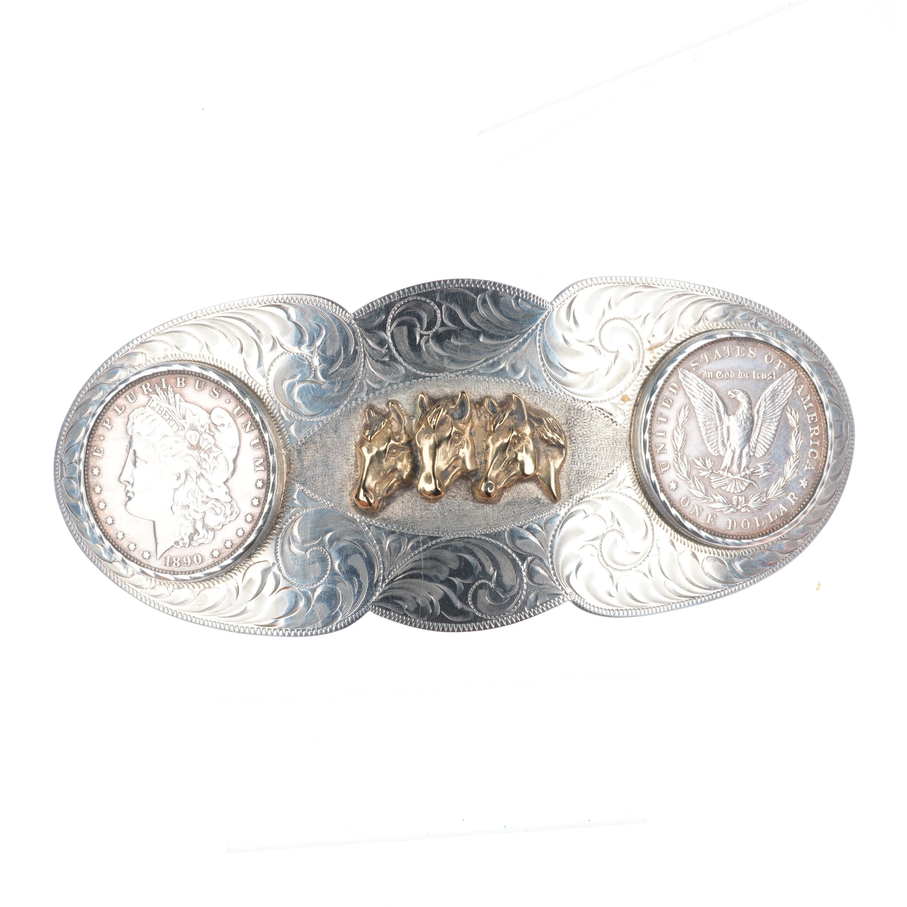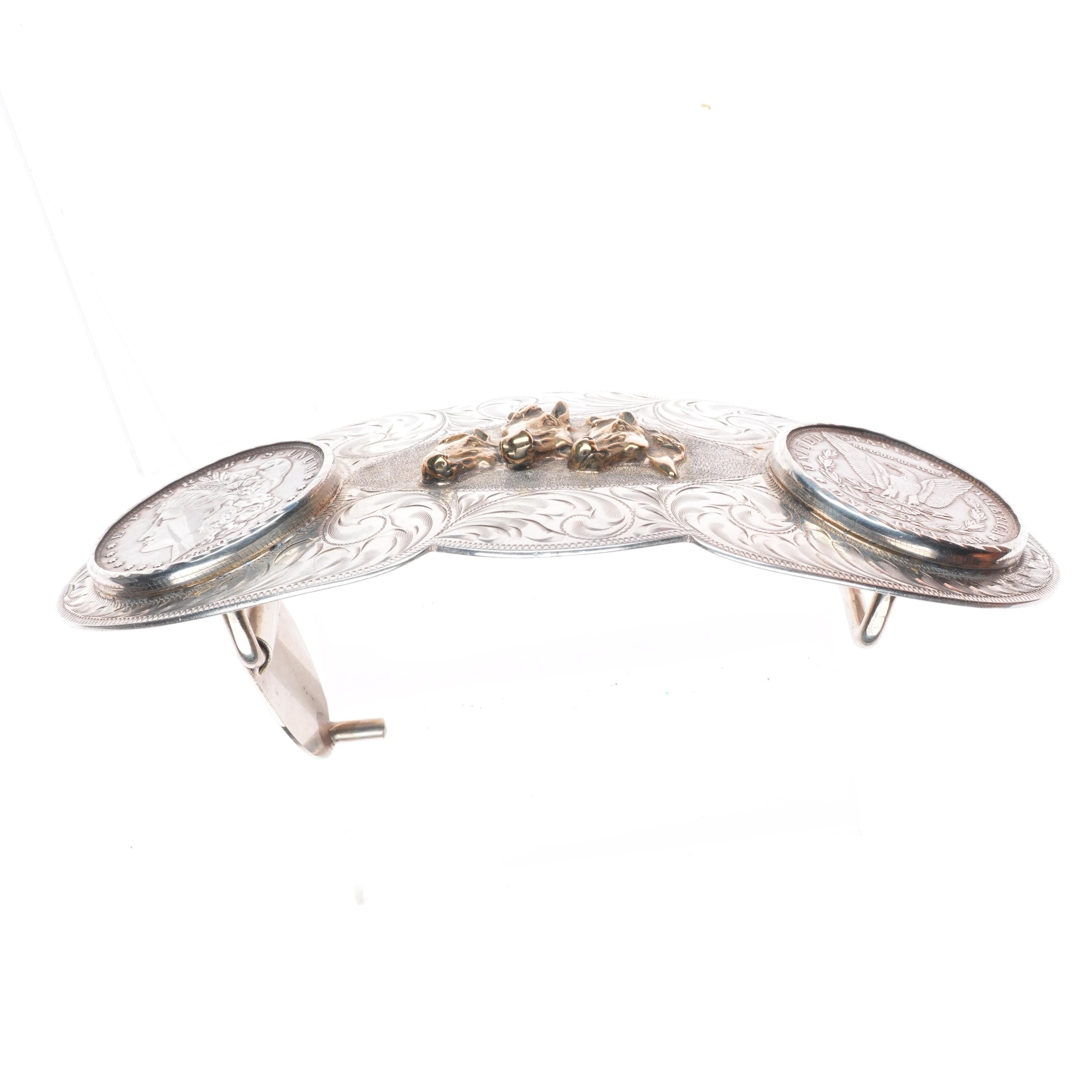 Huge Vintage Hand engraved sterling 2 silver dollar horse bust belt buckle. Tested and guaranteed solid sterling silver with weight and measurements in pictures. Fully functional. All items will likely have some age appropriate/expected wear, the older they are the more wear they should have. Circa third quarter of the 20th century.. Fits up to a 1.5" belt.