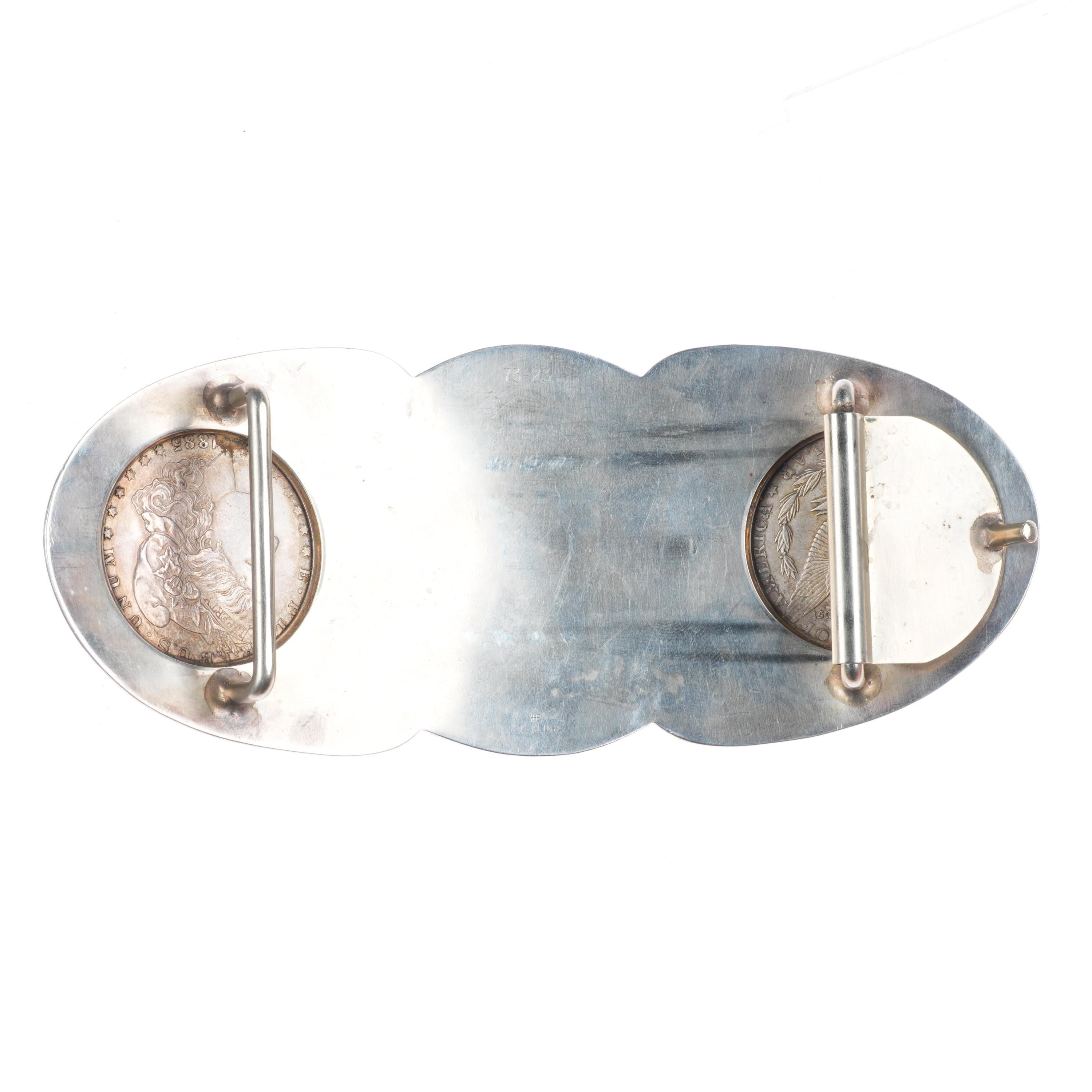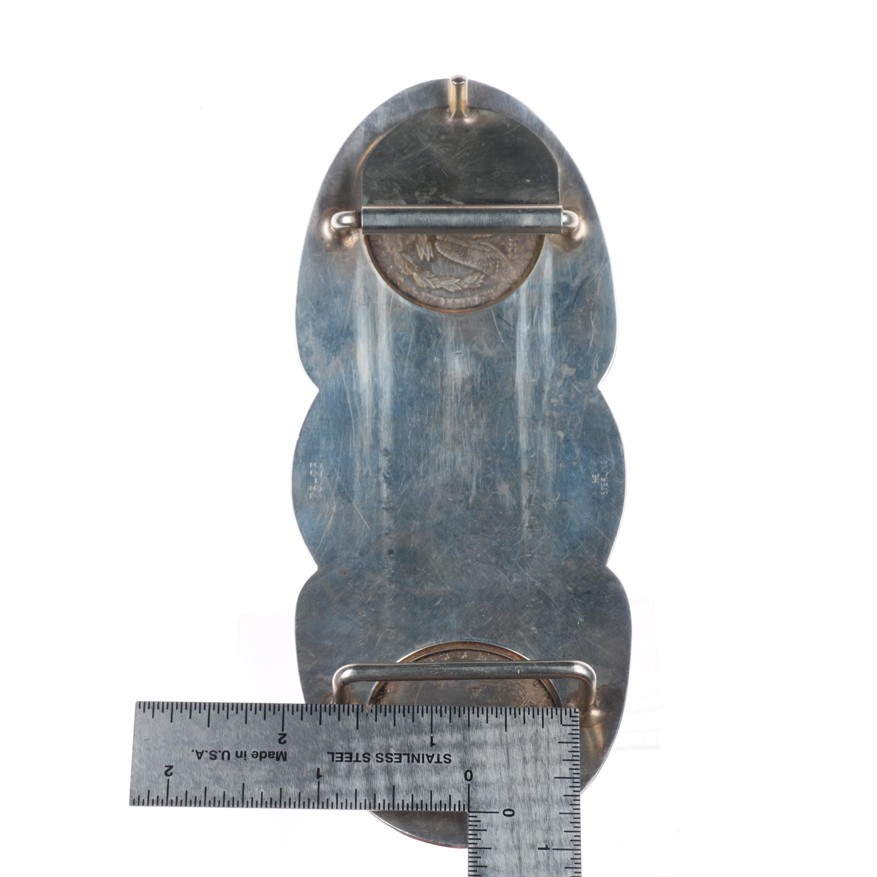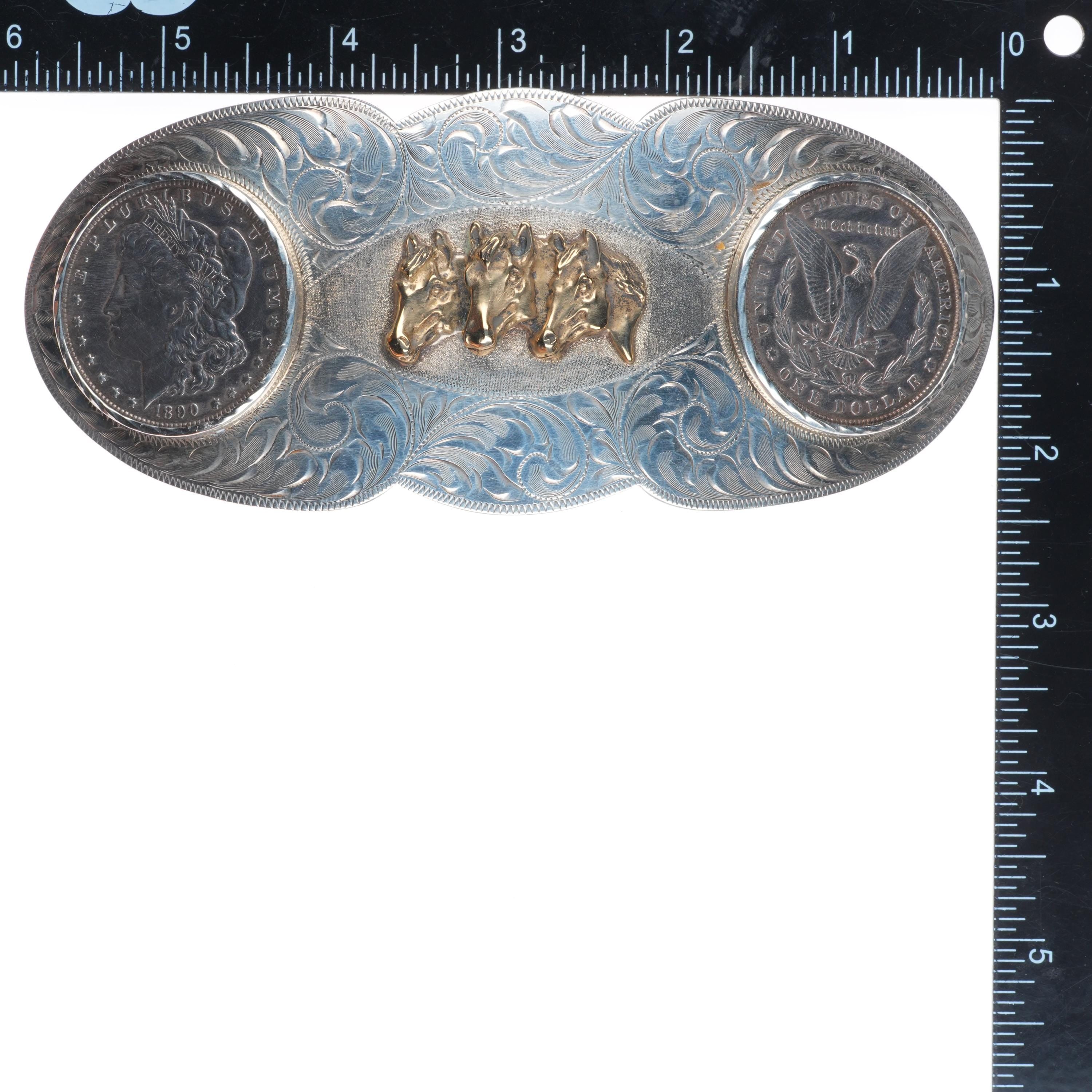 Huge Vintage Hand engraved sterling 2 silver dollar horse bust belt buckle. Tested and guaranteed solid sterling silver with weight and measurements in pictures. Fully functional. All items will likely have some age appropriate/expected wear, the older they are the more wear they should have. Circa third quarter of the 20th century.. Fits up to a 1.5" belt.