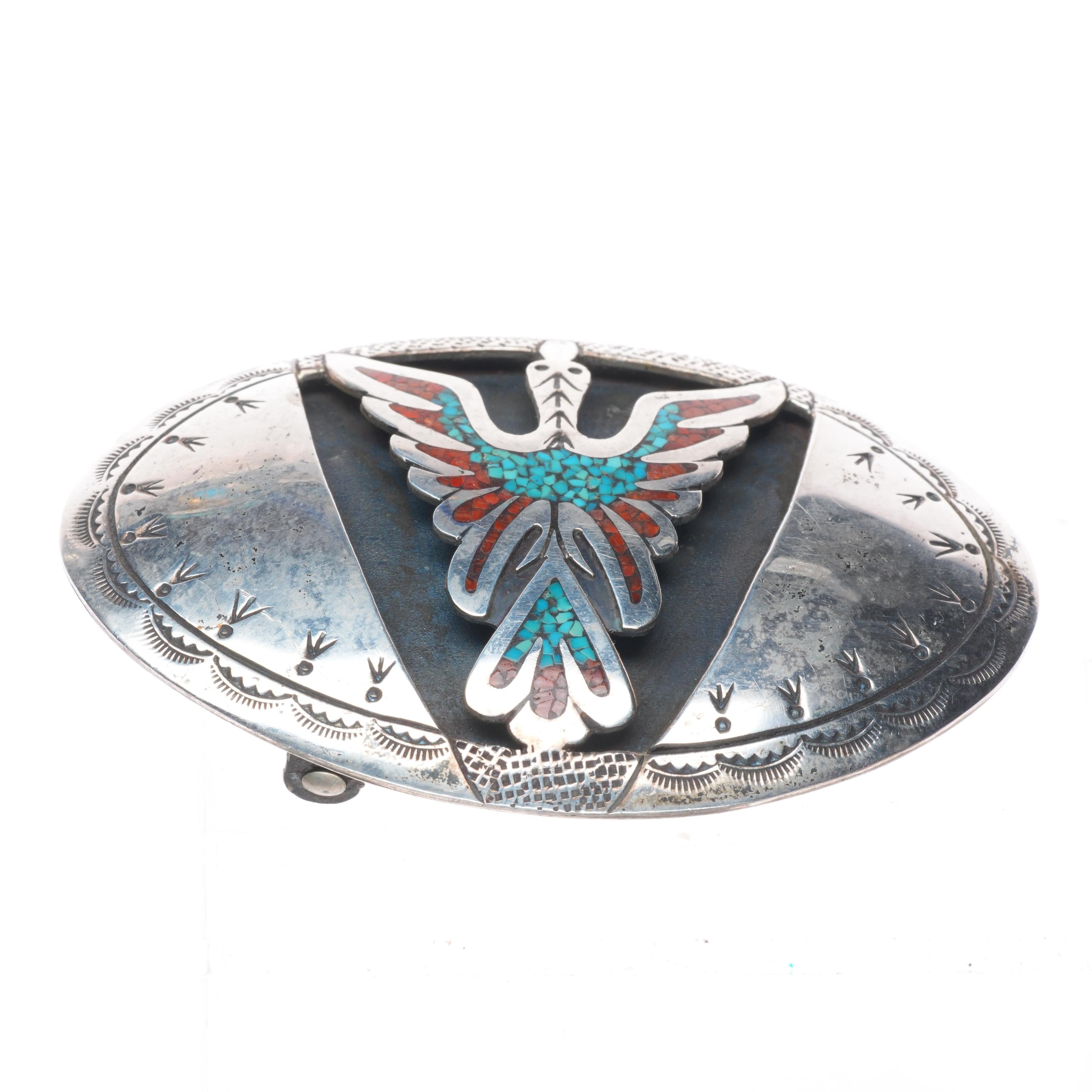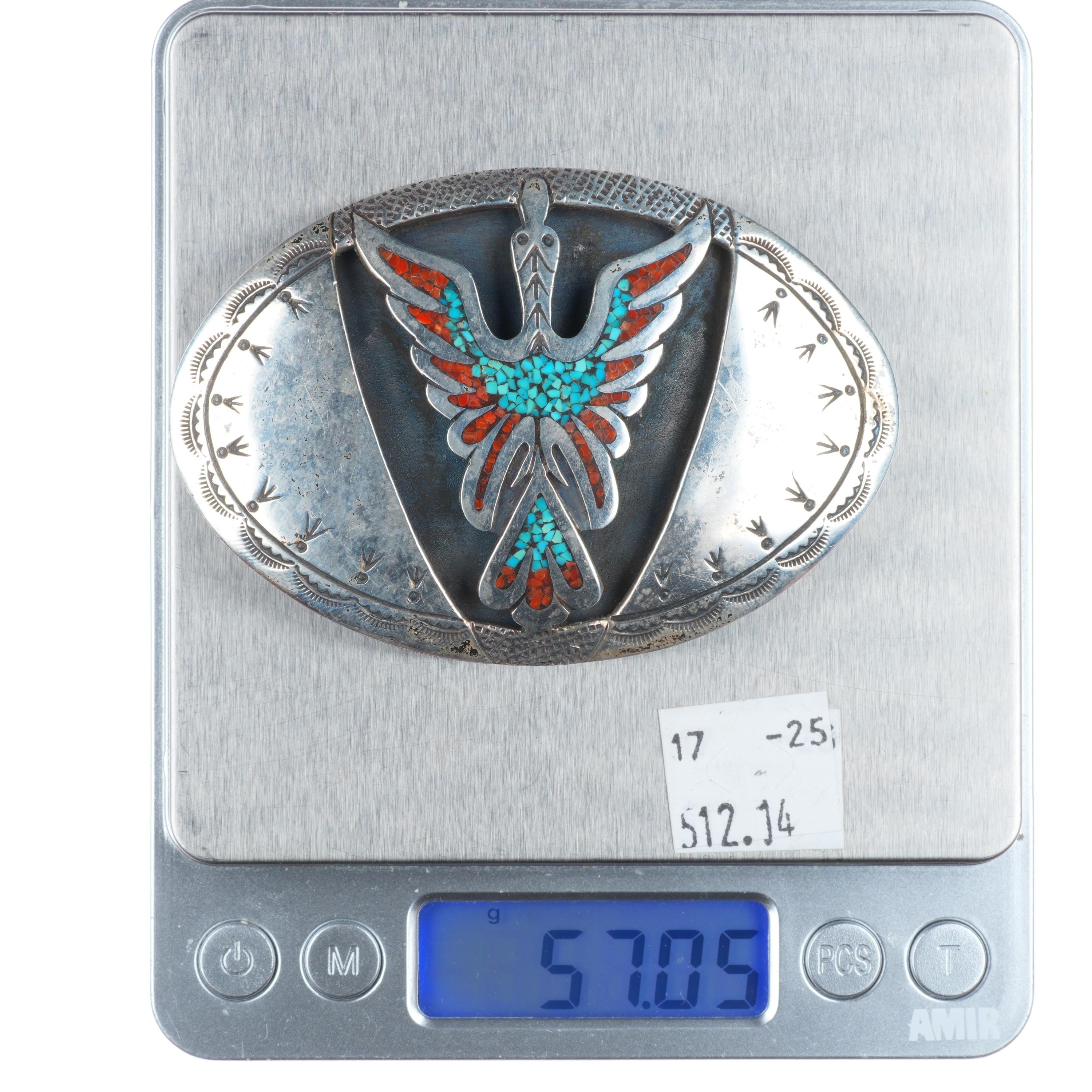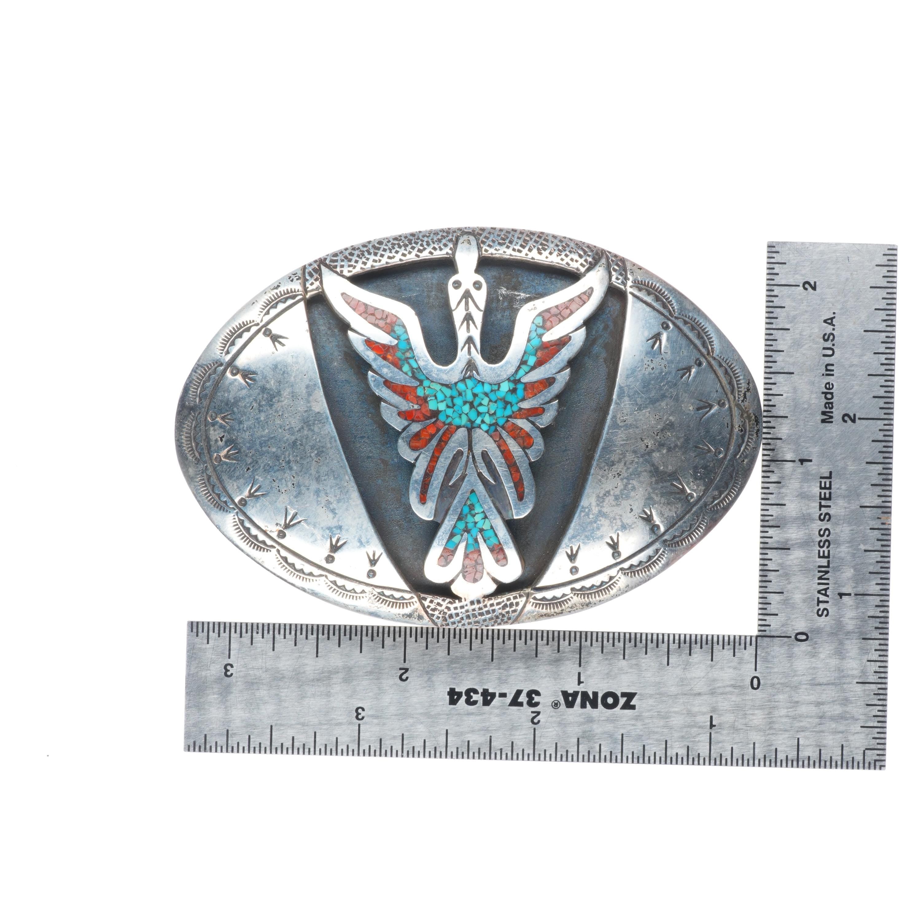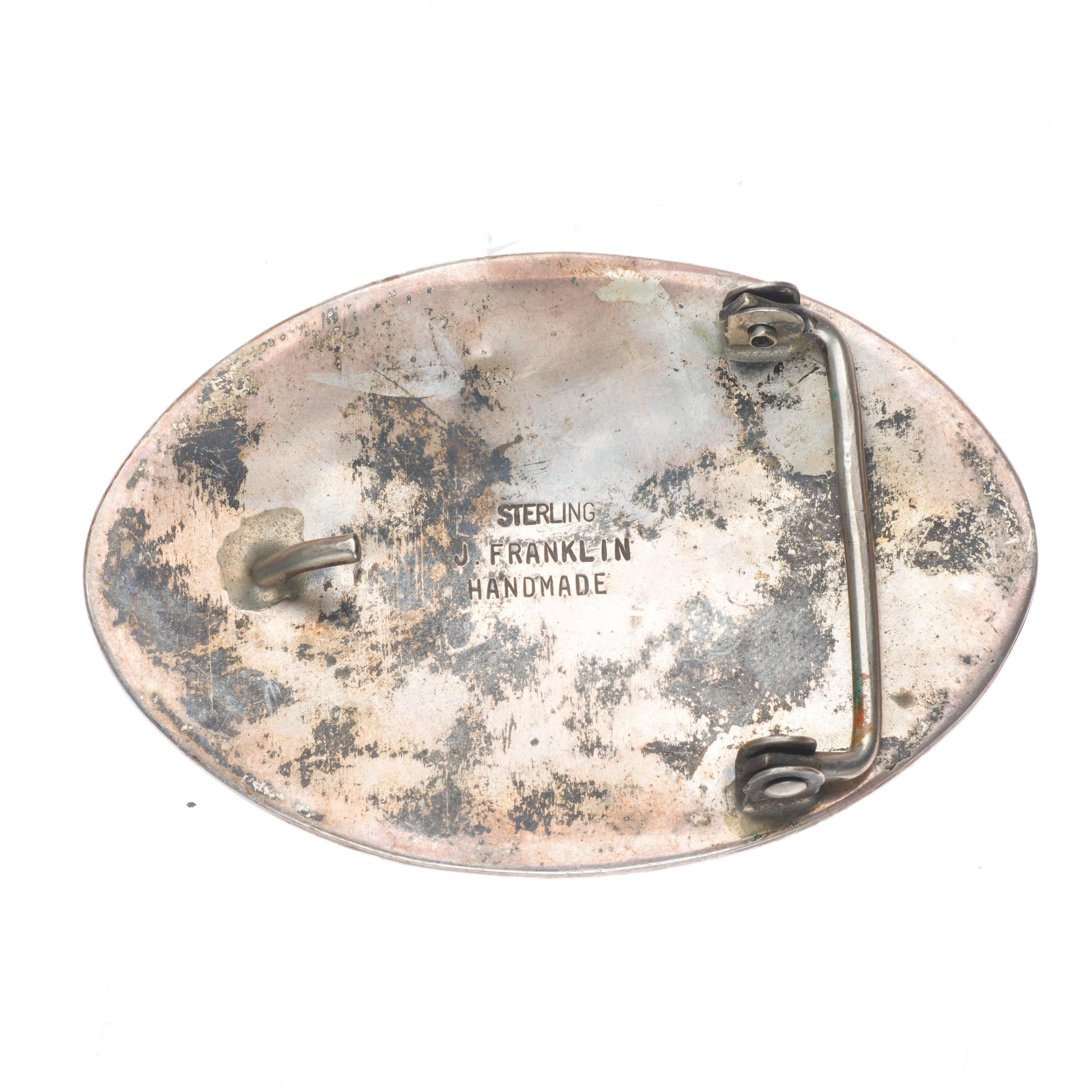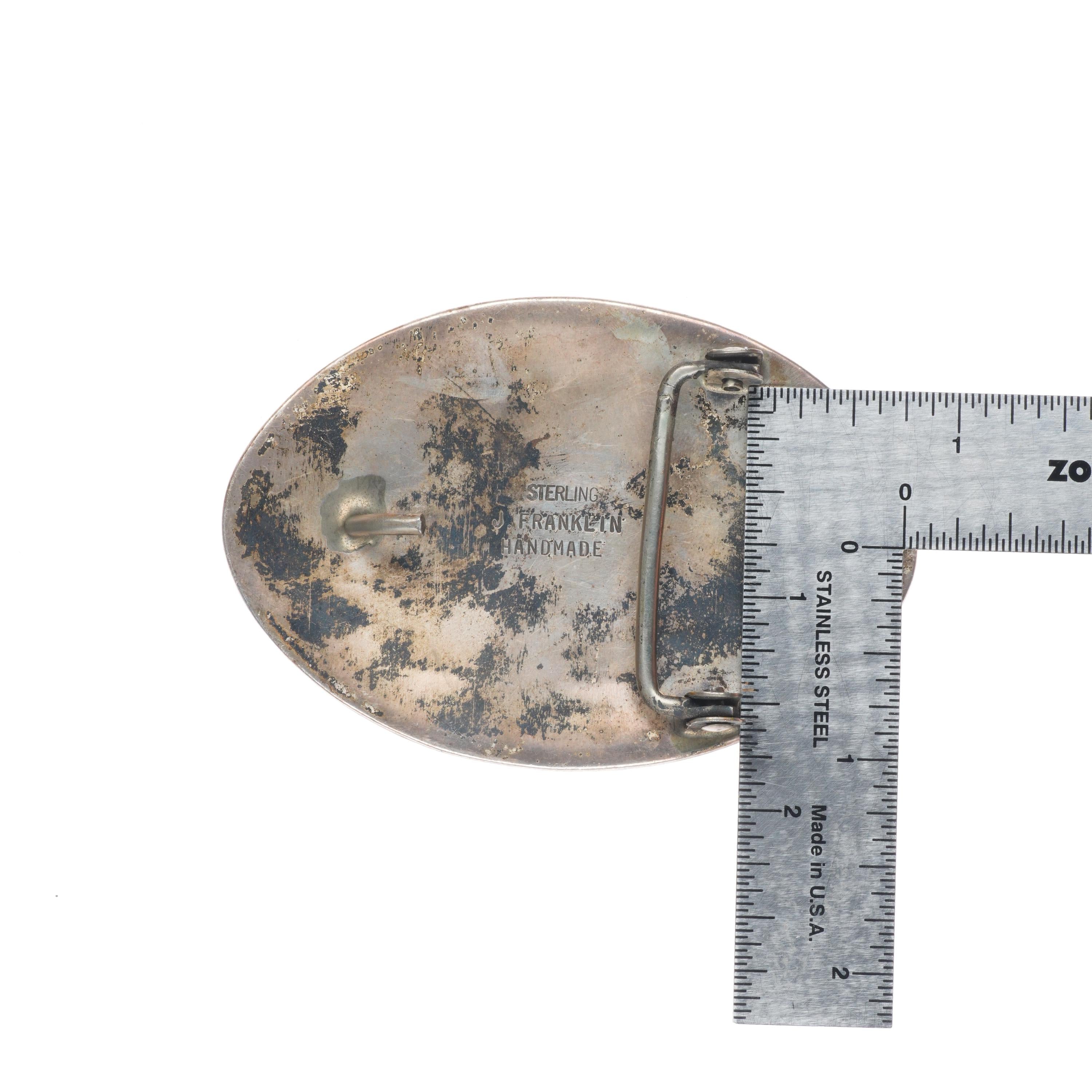 J Franklin Navajo sterling silver chip inlay peyote bird belt buckle. Tested and guaranteed solid sterling silver with weight and measurements in pictures. Fully functional. All items will likely have some age appropriate/expected wear, the older they are the more wear they should have. Circa third quarter of the 20th century.. Fits up to a 1.5" belt.