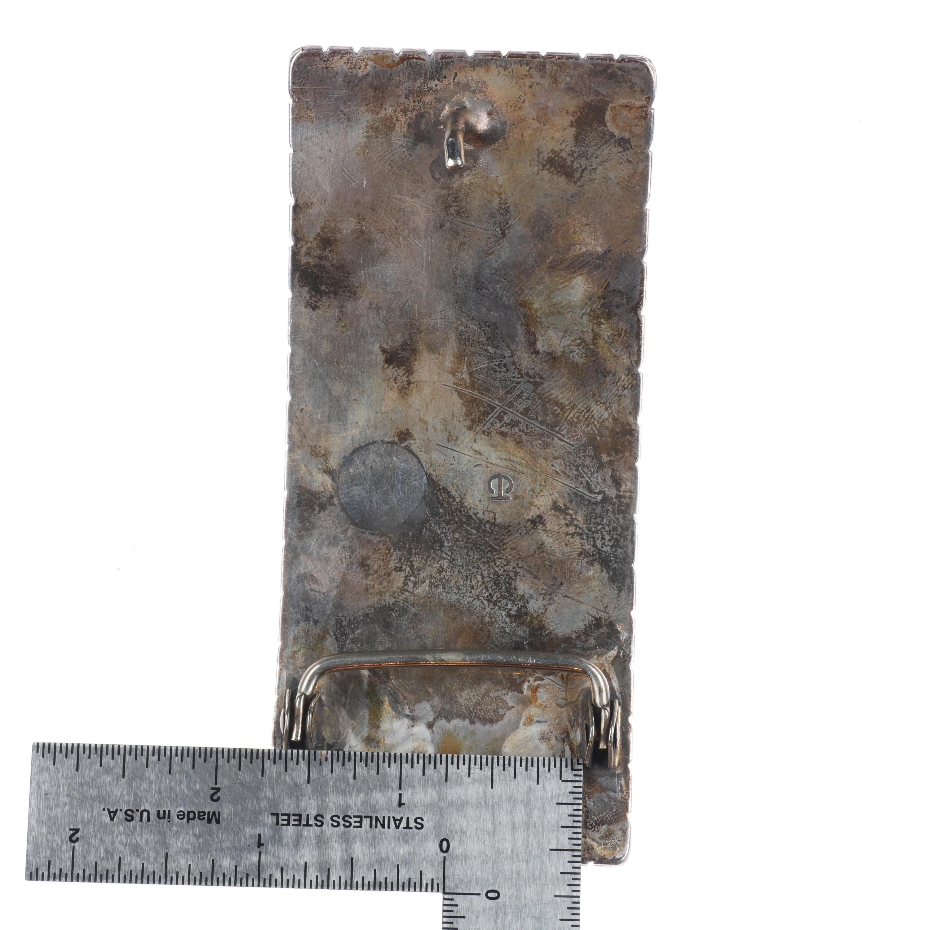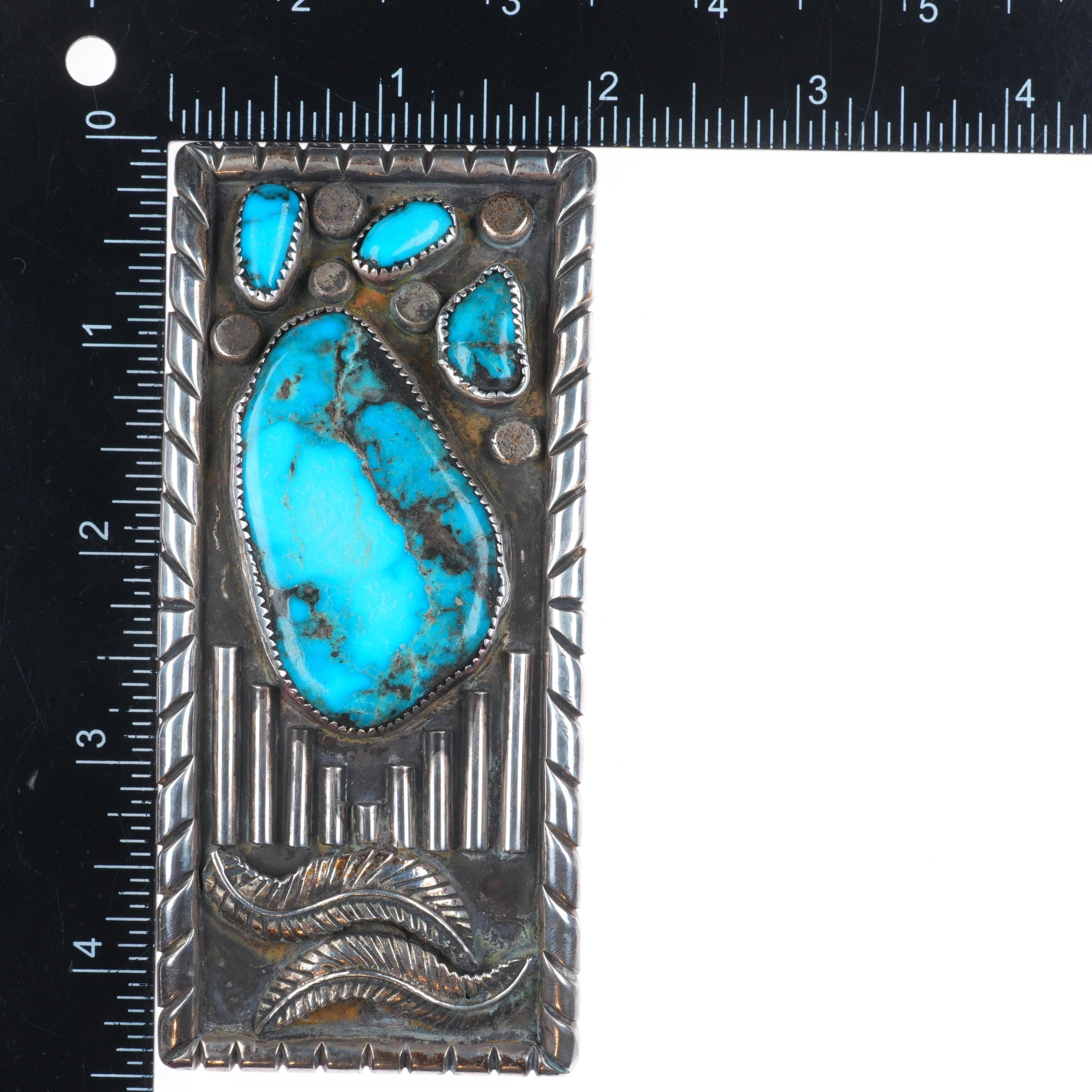 Large long Vintage Navajo sterling silver belt buckle with nice turquoise Tested and guaranteed solid sterling silver. Weight and measurements in pictures, circa third quarter of the 20th century. Fits a 1.5" belt.