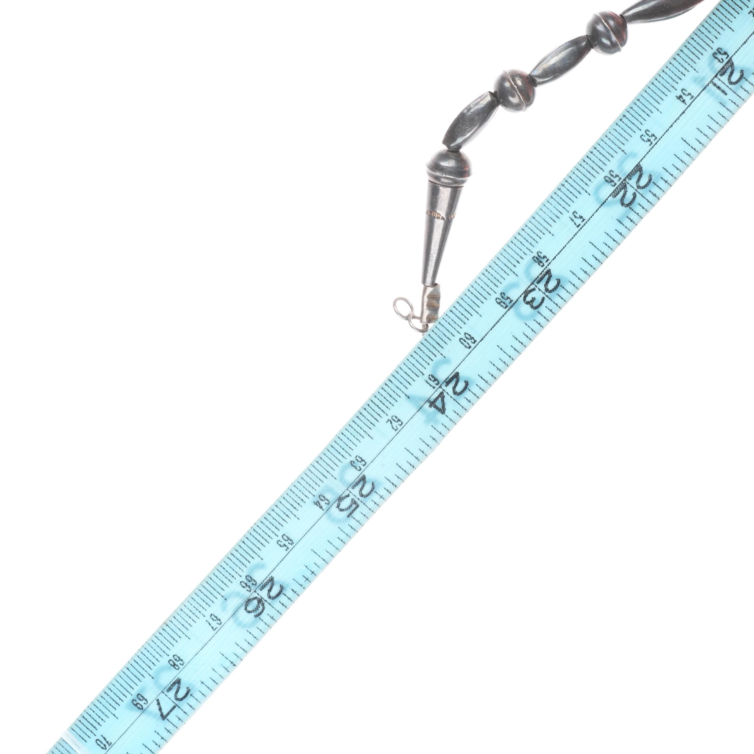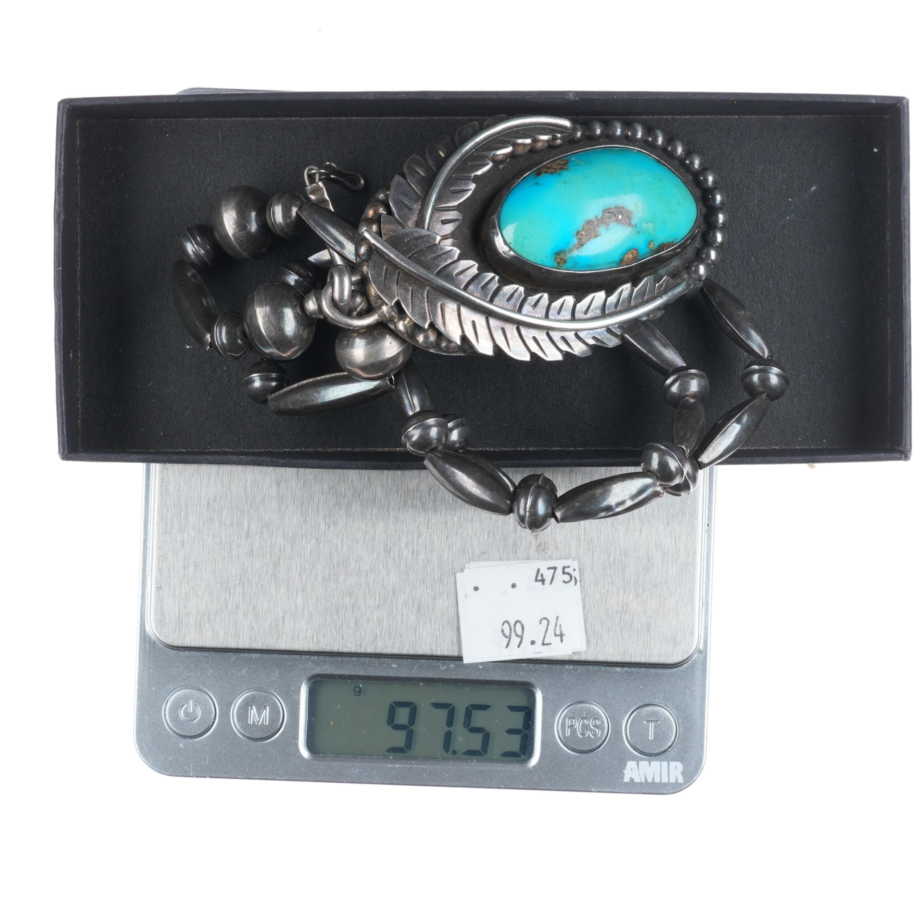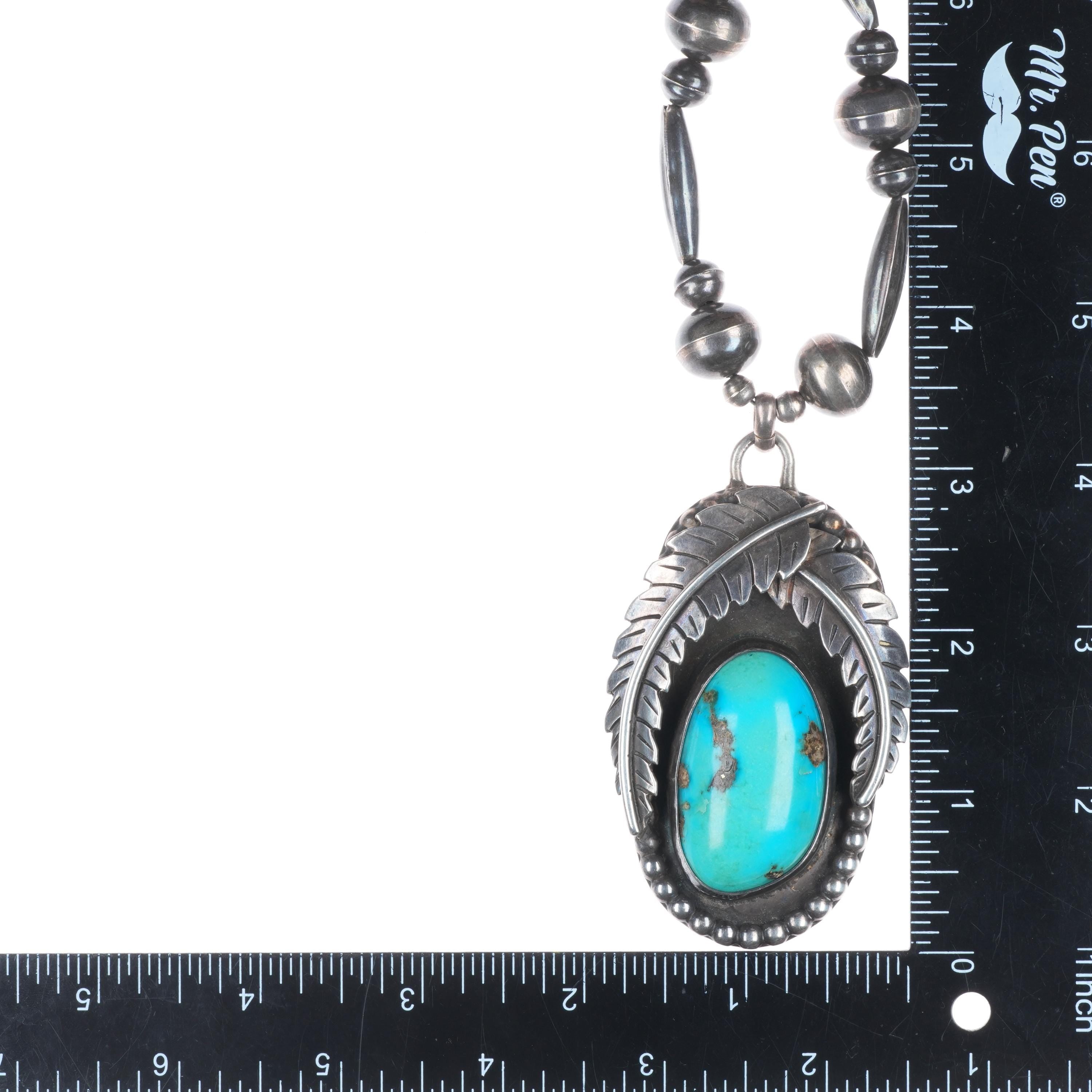 Large Vintage Navajo RSJC Sterling feathers/turquoise pendant/beaded necklace. Solid sterling silver tested and guaranteed with weight and measurements in the pictures. Circa third quarter of the 20th century. No issues, 24" long necklace.