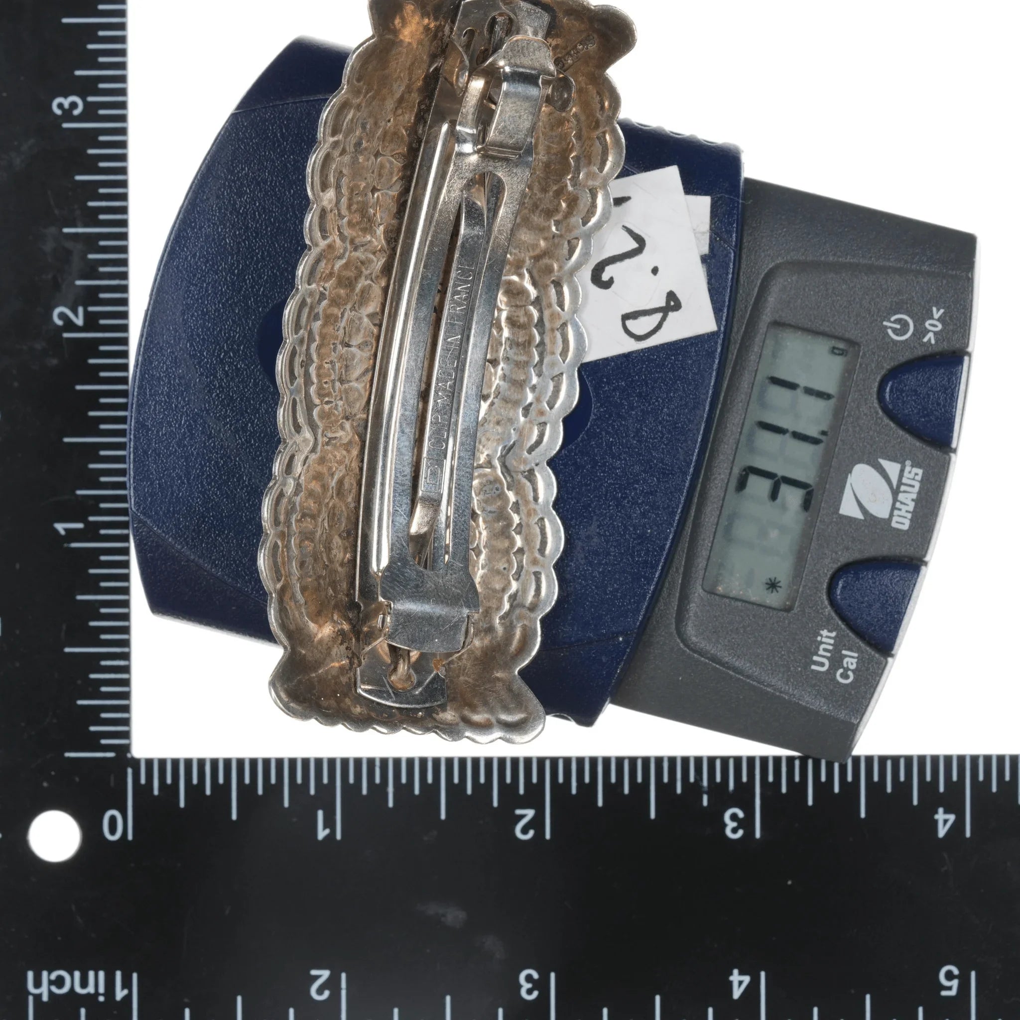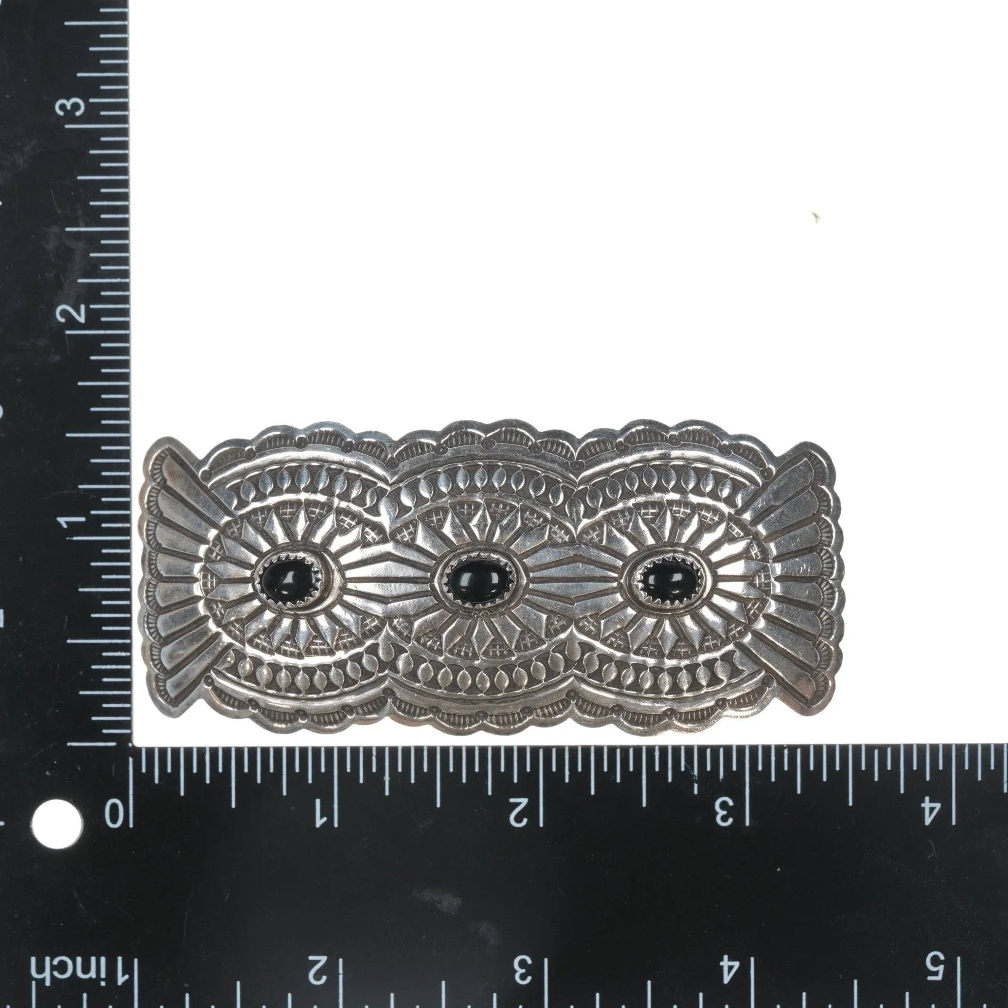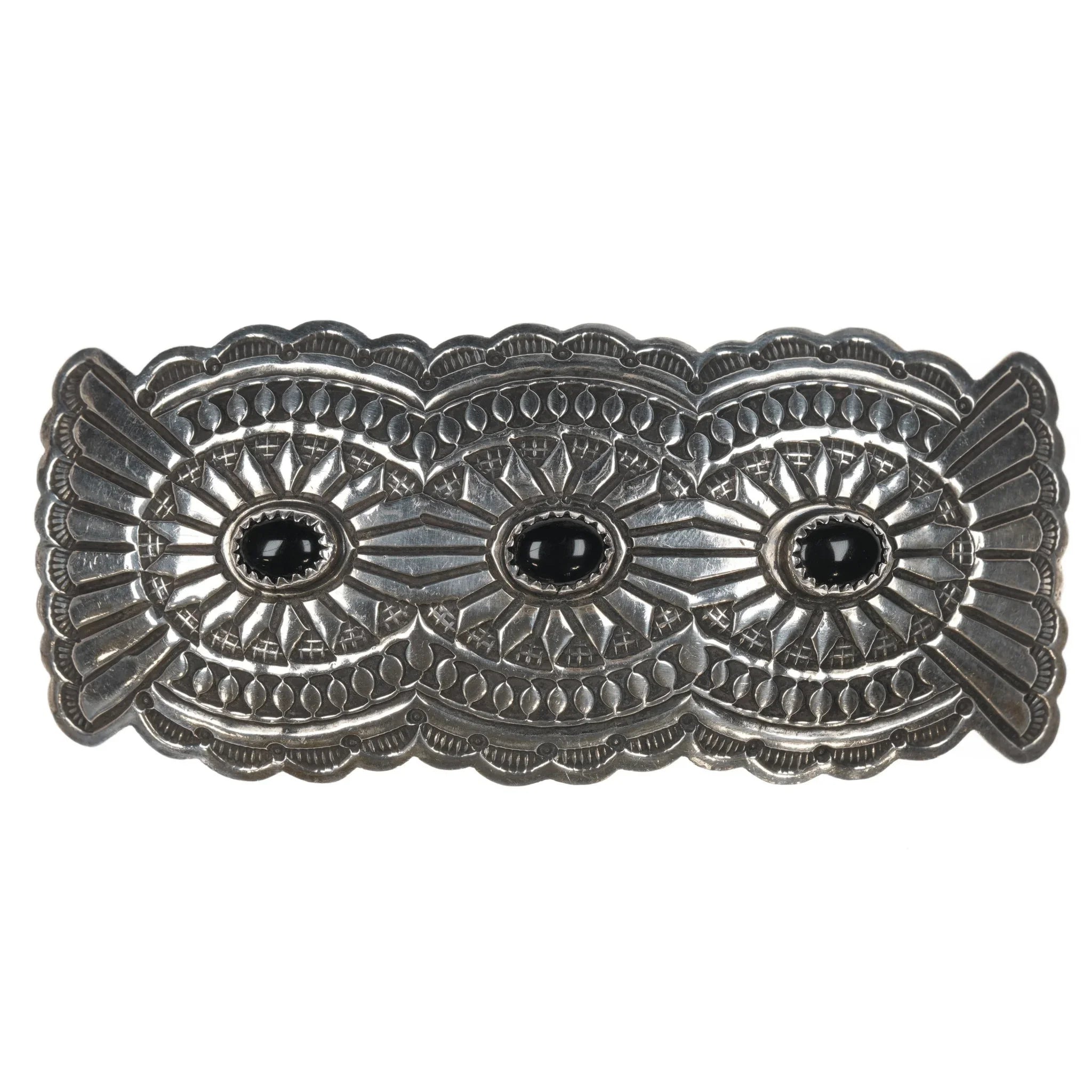 Large Vintage Navajo Sterling and onyx barette. Fully functional, appears unused. Clip is metal made in France. Main part is sterling and marked.