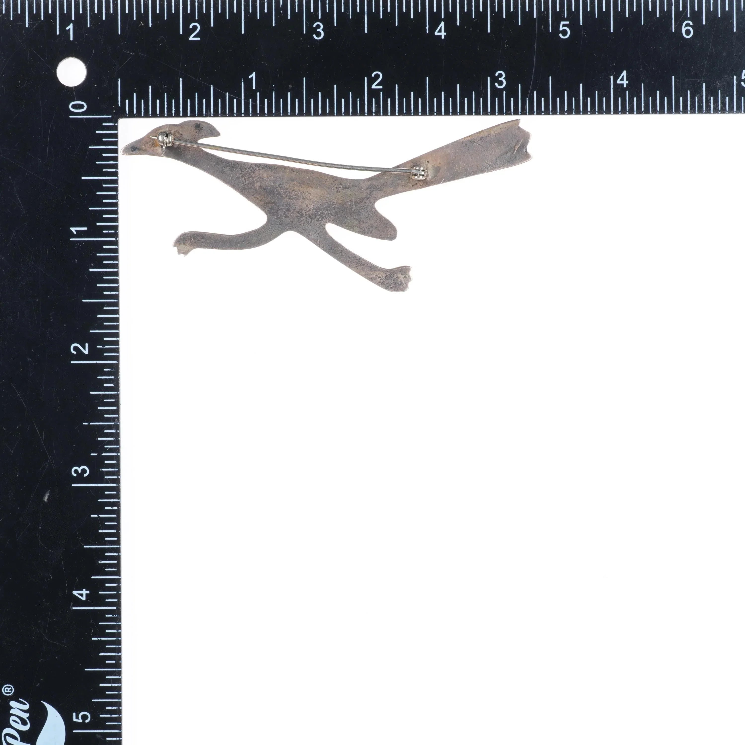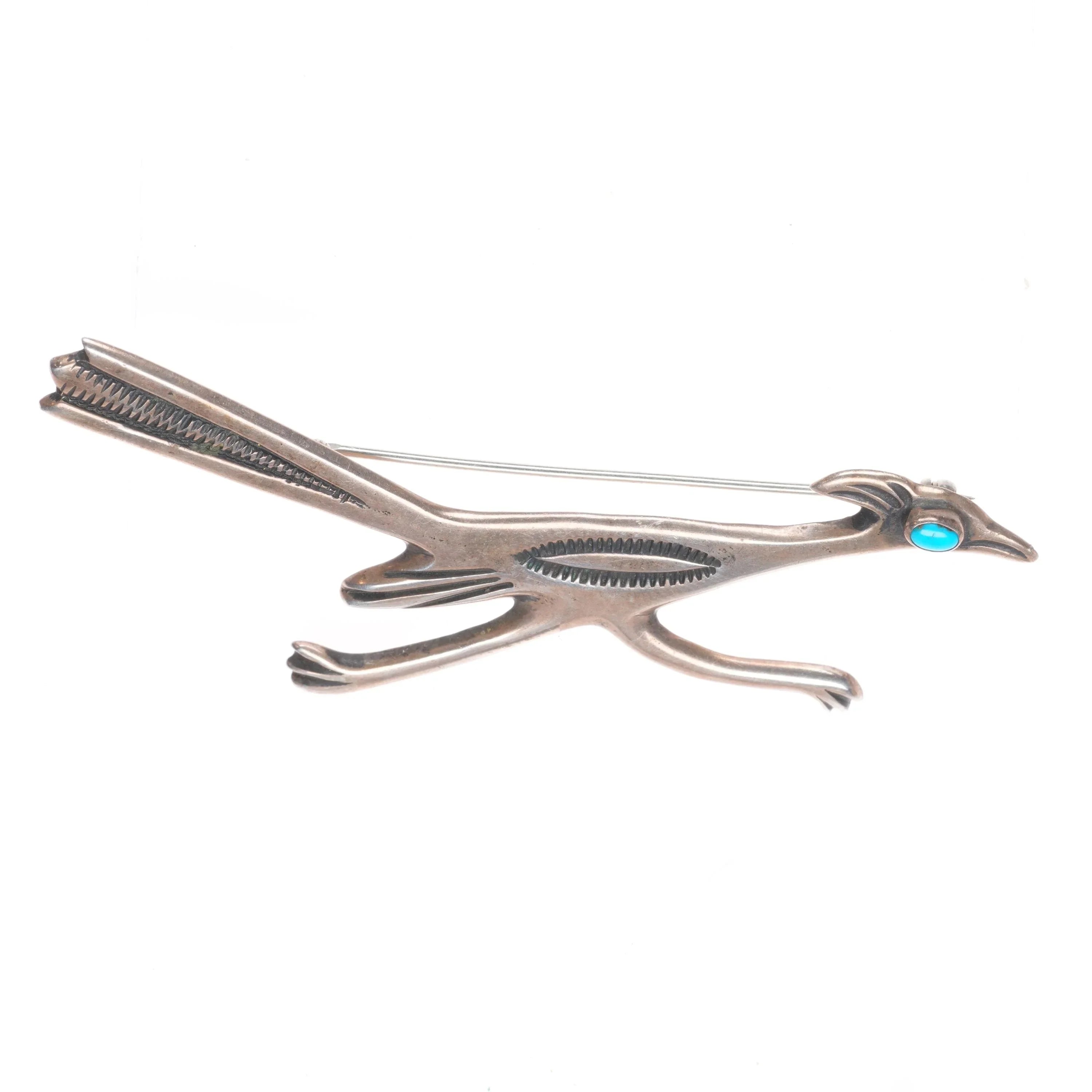Large vintage Navajo sterling silver roadrunner pin/brooch w/ turquoise eye