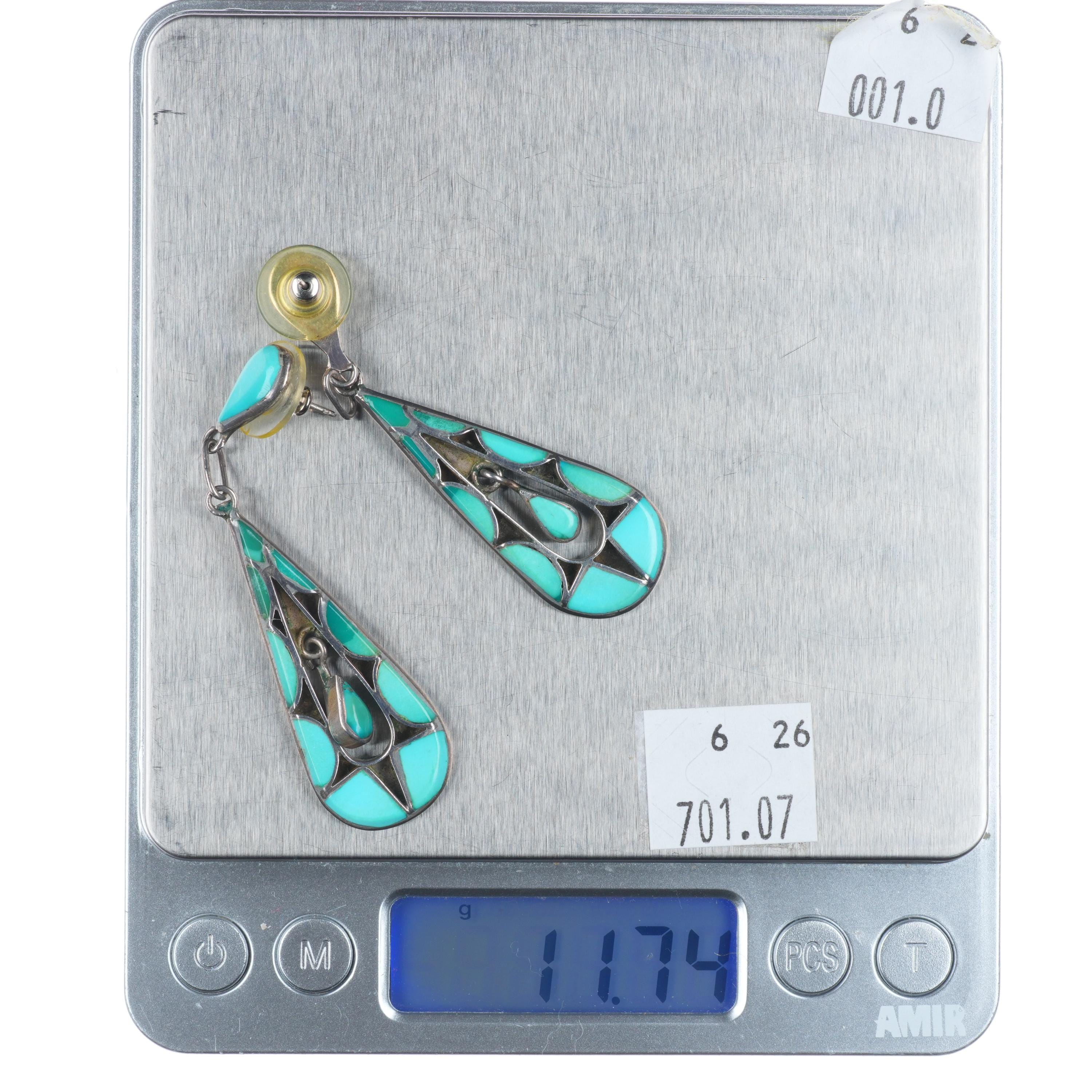 Large Vintage Zuni sterling silver channel inlay turquoise dangly long earrings.. Great earrings with no issues, tested and guaranteed solid sterling silver, any marks detected, weight, and measurements will be shown in the pictures.