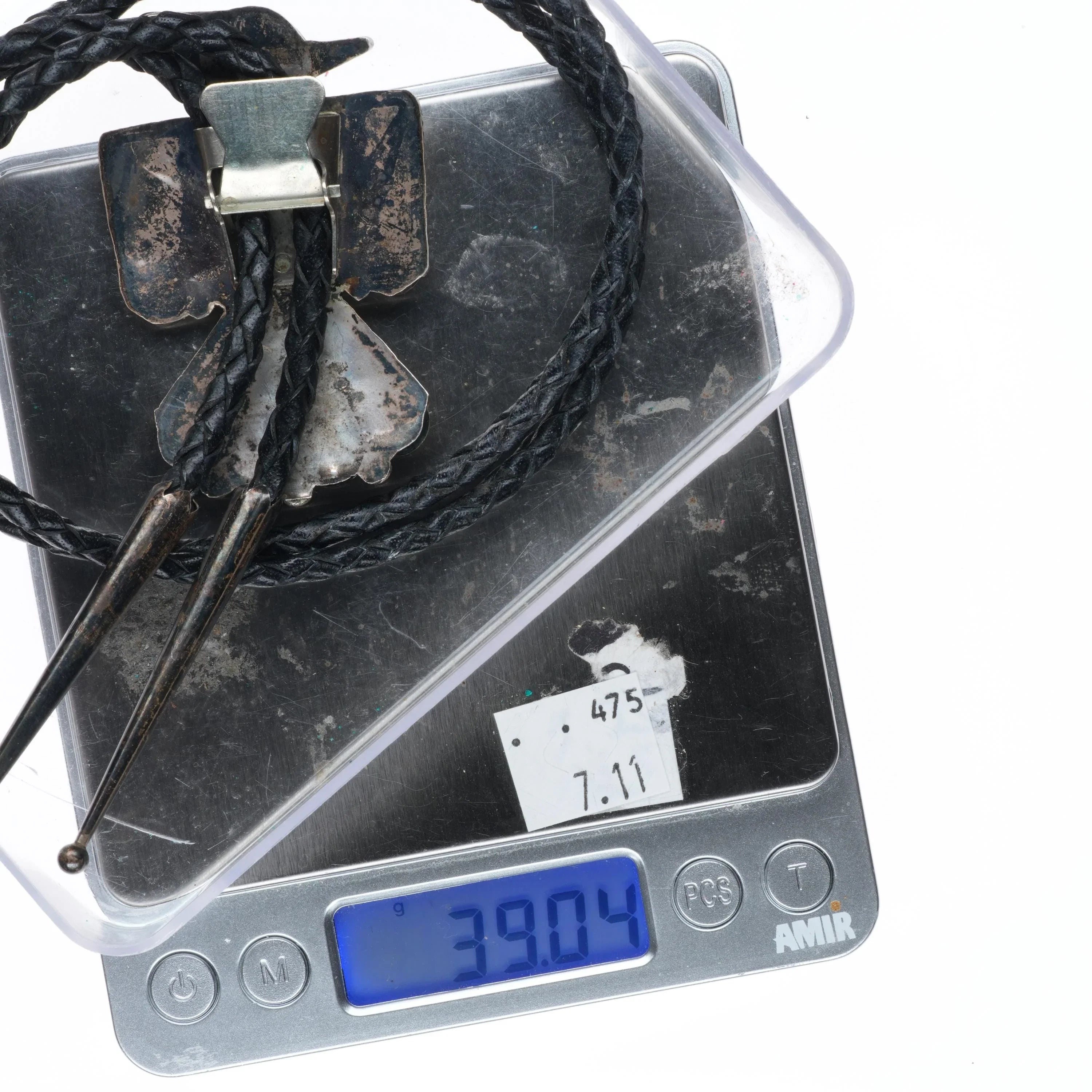 Large Vintage Zuni sterling silver thunderbird shell/stone inlay bolo tie. Tested and guaranteed solid sterling silver slide and tips. Weight and measurements in pictures. Great bolo, 39" long with no issues. Tray is tared out, so weight shown is just the bolo of course.