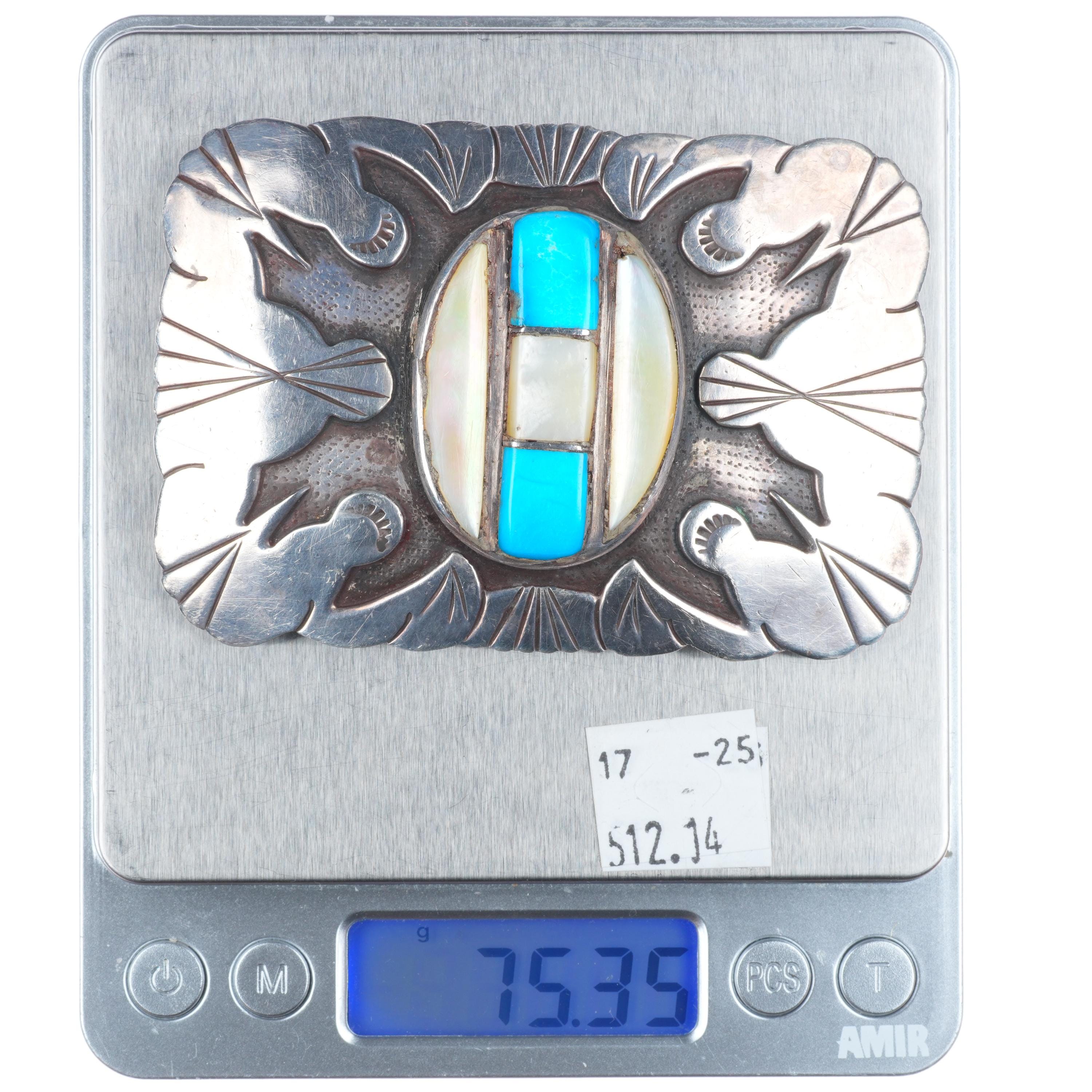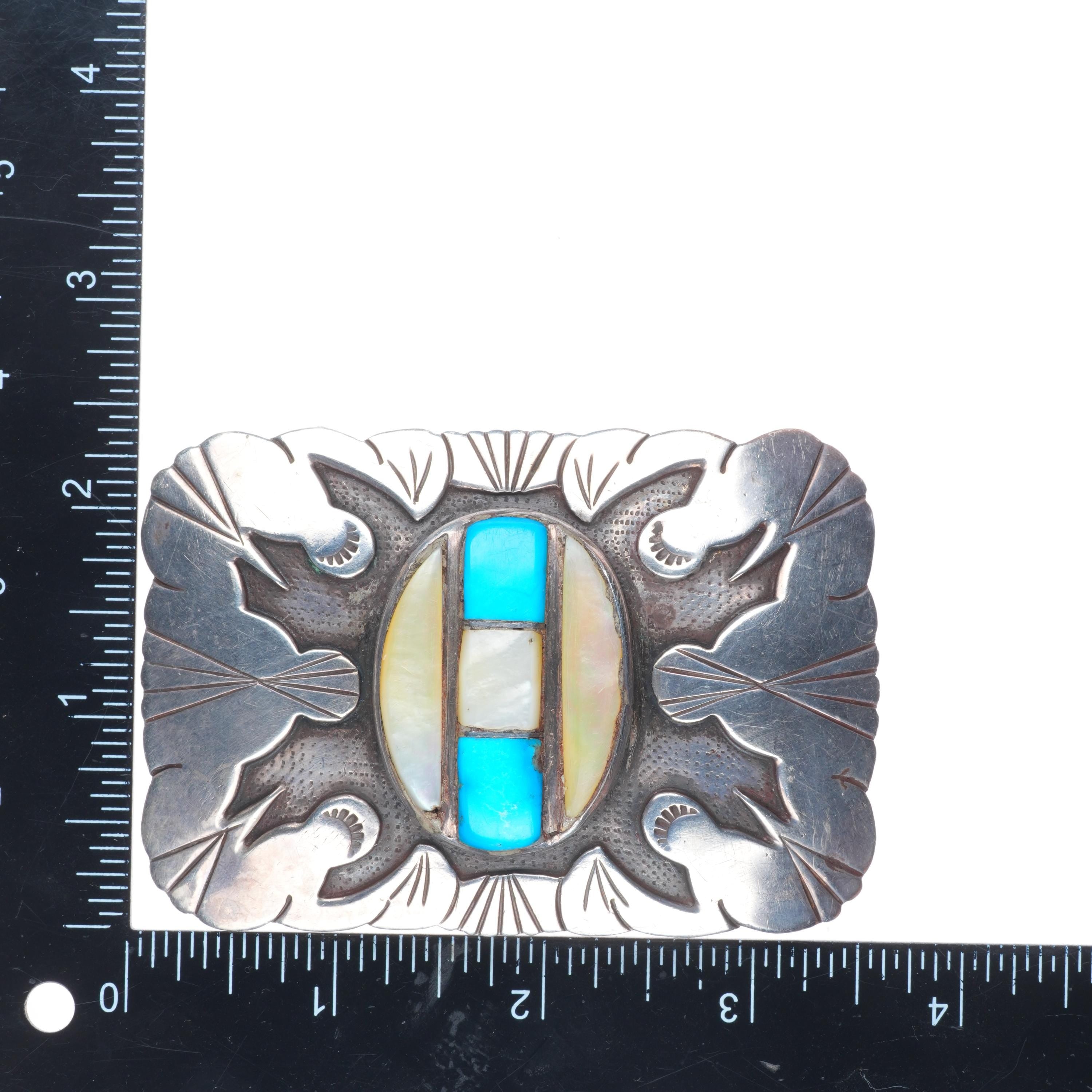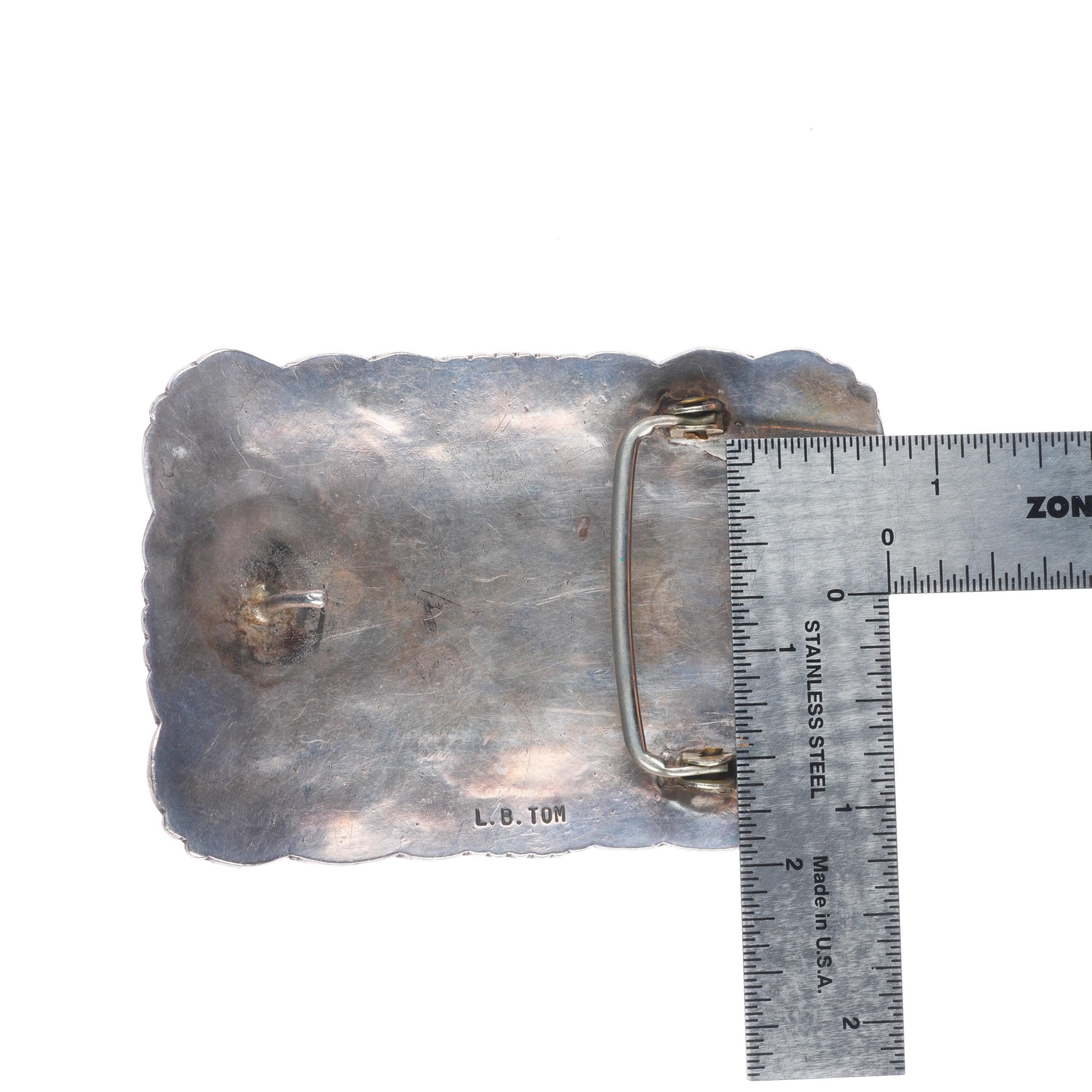 LB Tom Vintage Navajo sterling silver turquoise/shell inlay belt buckle. Tested and guaranteed solid sterling silver with weight and measurements in pictures. Fully functional. All items will likely have some age appropriate/expected wear, the older they are the more wear they should have. Circa third quarter of the 20th century.. Fits up to a 1.5" belt.
