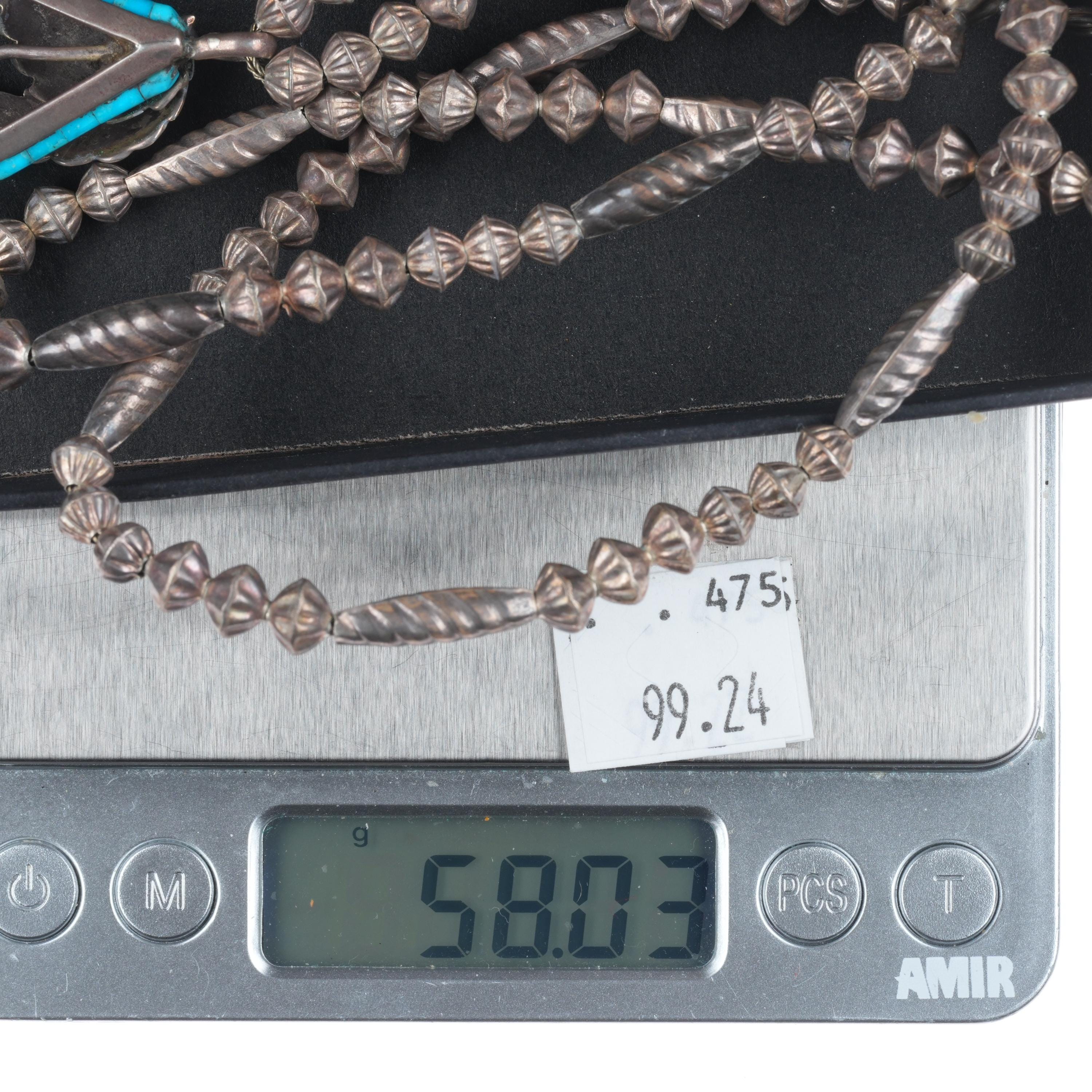 Les Baker Shop Vintage Navajo sterling silver turquoise pendant necklace heishi. Solid sterling silver tested and guaranteed with weight and measurements in the pictures. Circa fourth quarter of the 20th century. No issues, 25" long necklace.