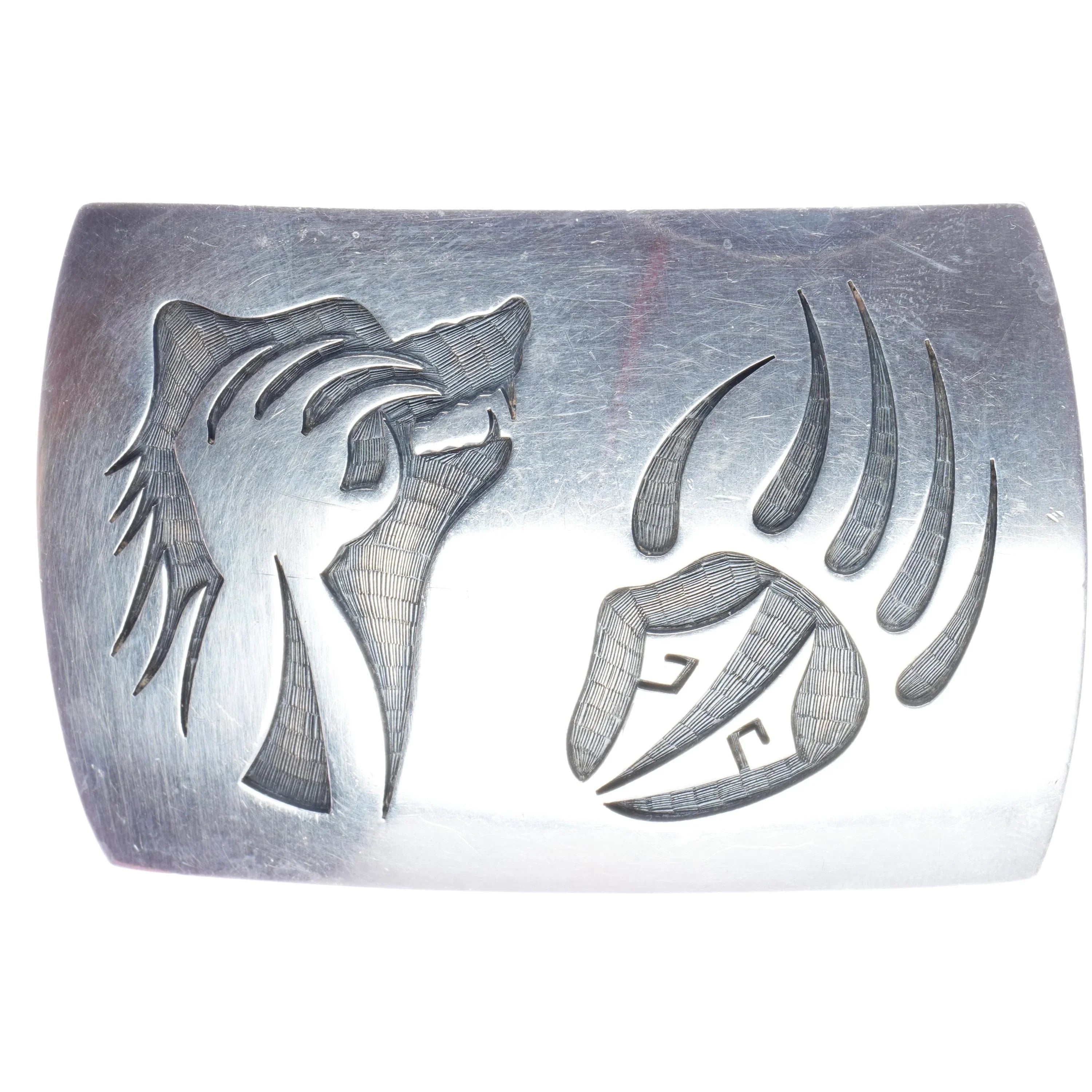 Loren Phillips Hopi overlay bear themed belt buckle sterling silver. Solid sterling silver with weight and measurements in pics. Fully functional, with appropriate wear as shown in the pictures.