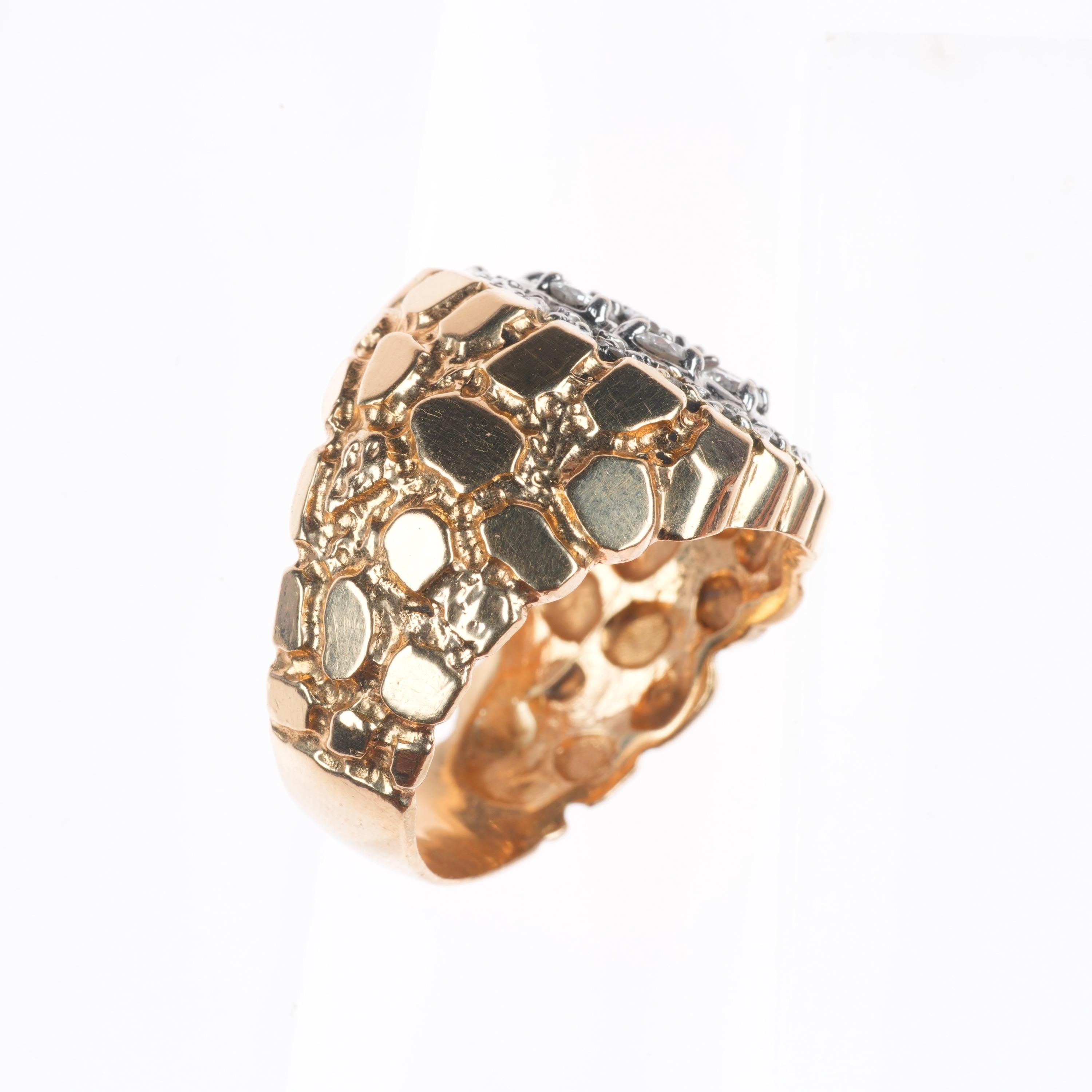 sz11 14k gold natural diamond vintage nugget men's ring. Tested and guaranteed solid 14k gold, circa last quarter of the 20th century. Some expected wear, weight and measurements in pictures. No damage to stones, no time to measure stones but they are decent sized diamonds (maybe 1cttw), tested and guaranteed.