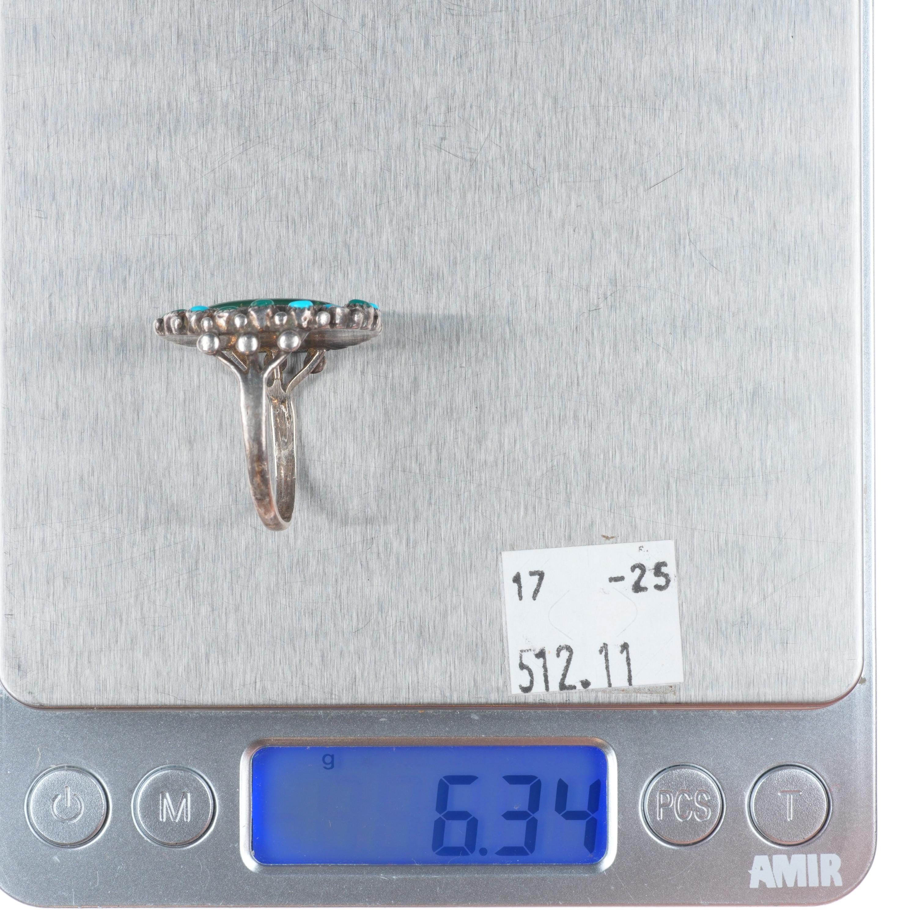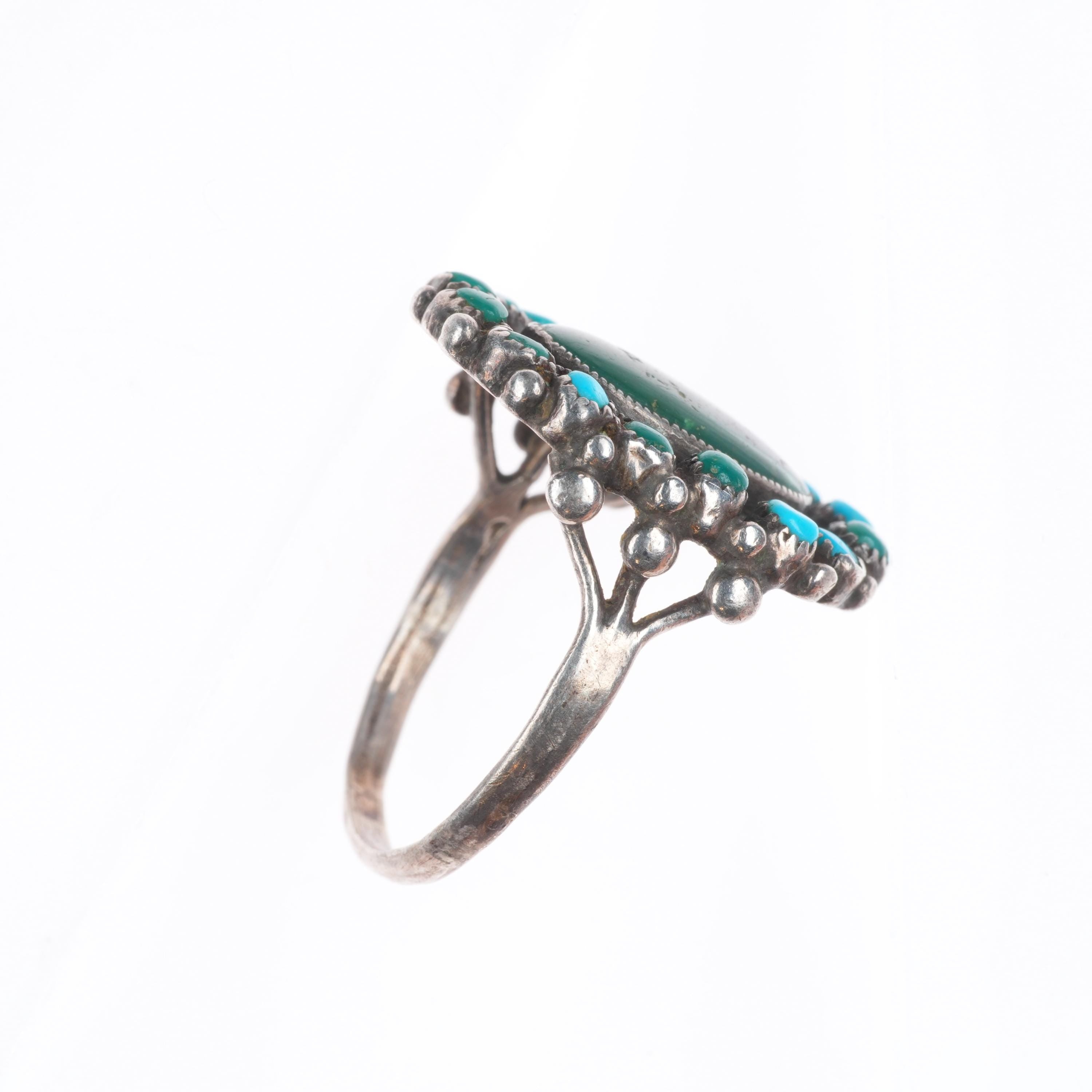 sz11.25 c1930's Navajo greasy green turquoise sterling silver cluster ring. Tested and guaranteed solid sterling silver, circa second quarter of the 20th century. Some expected wear, weight and measurements in pictures. Stones are secure, some wear to bezels