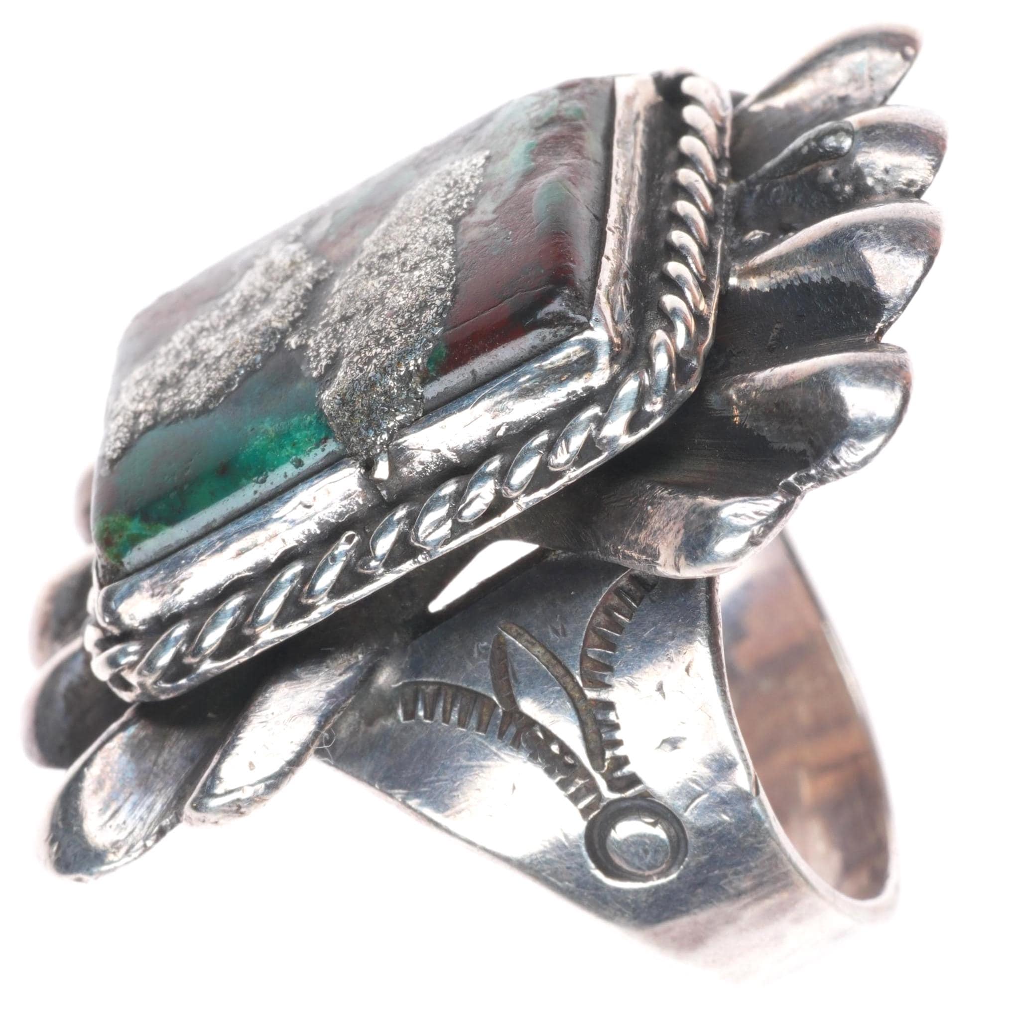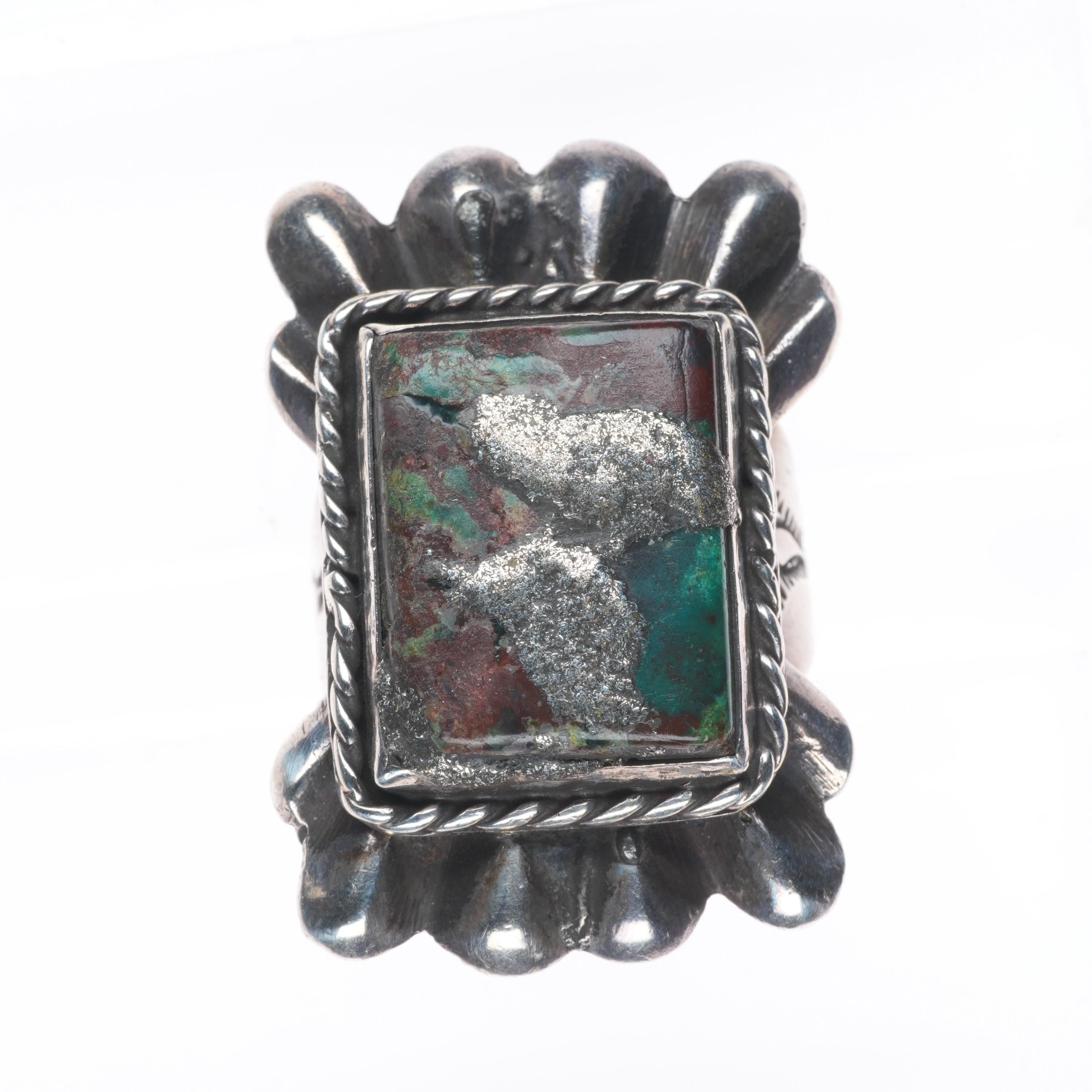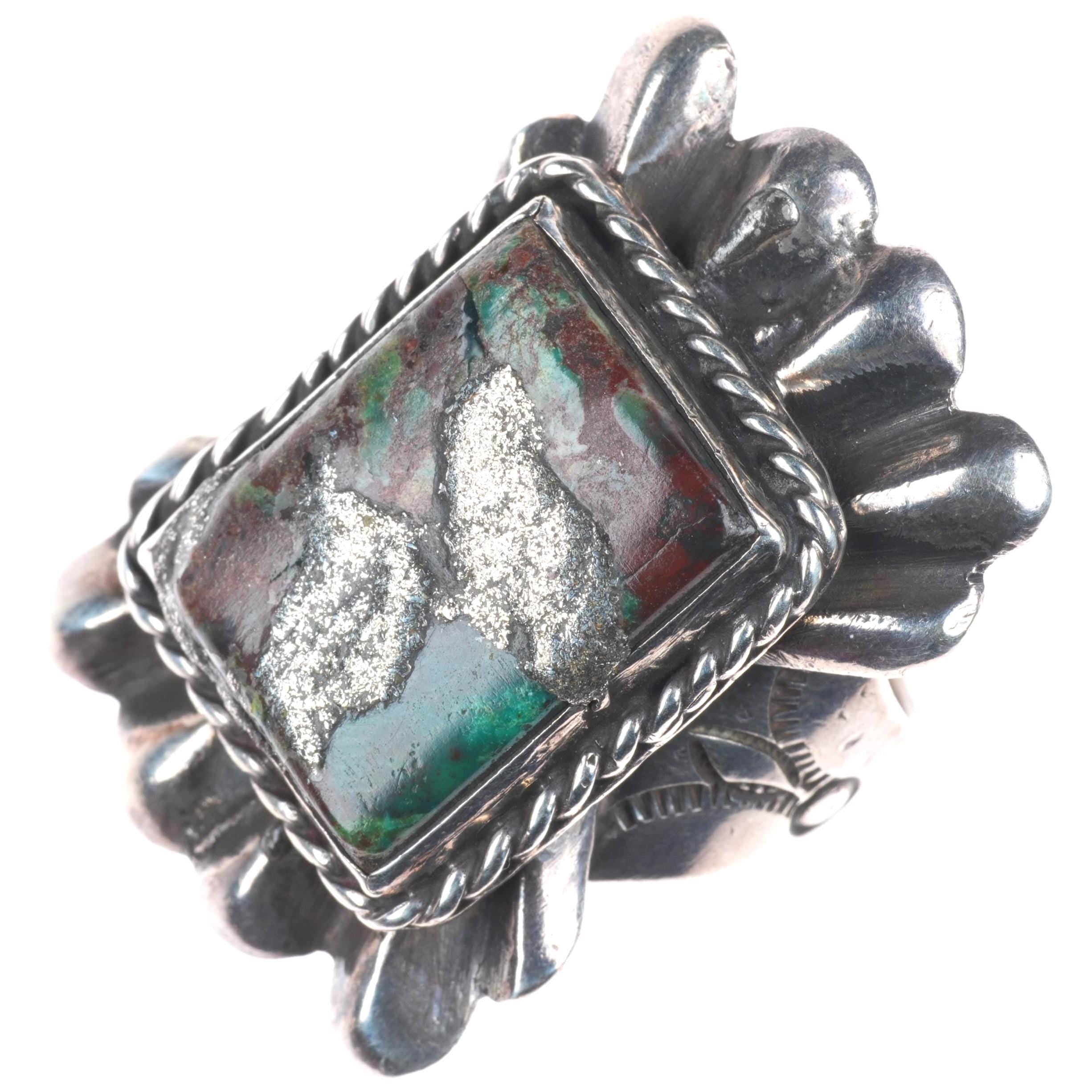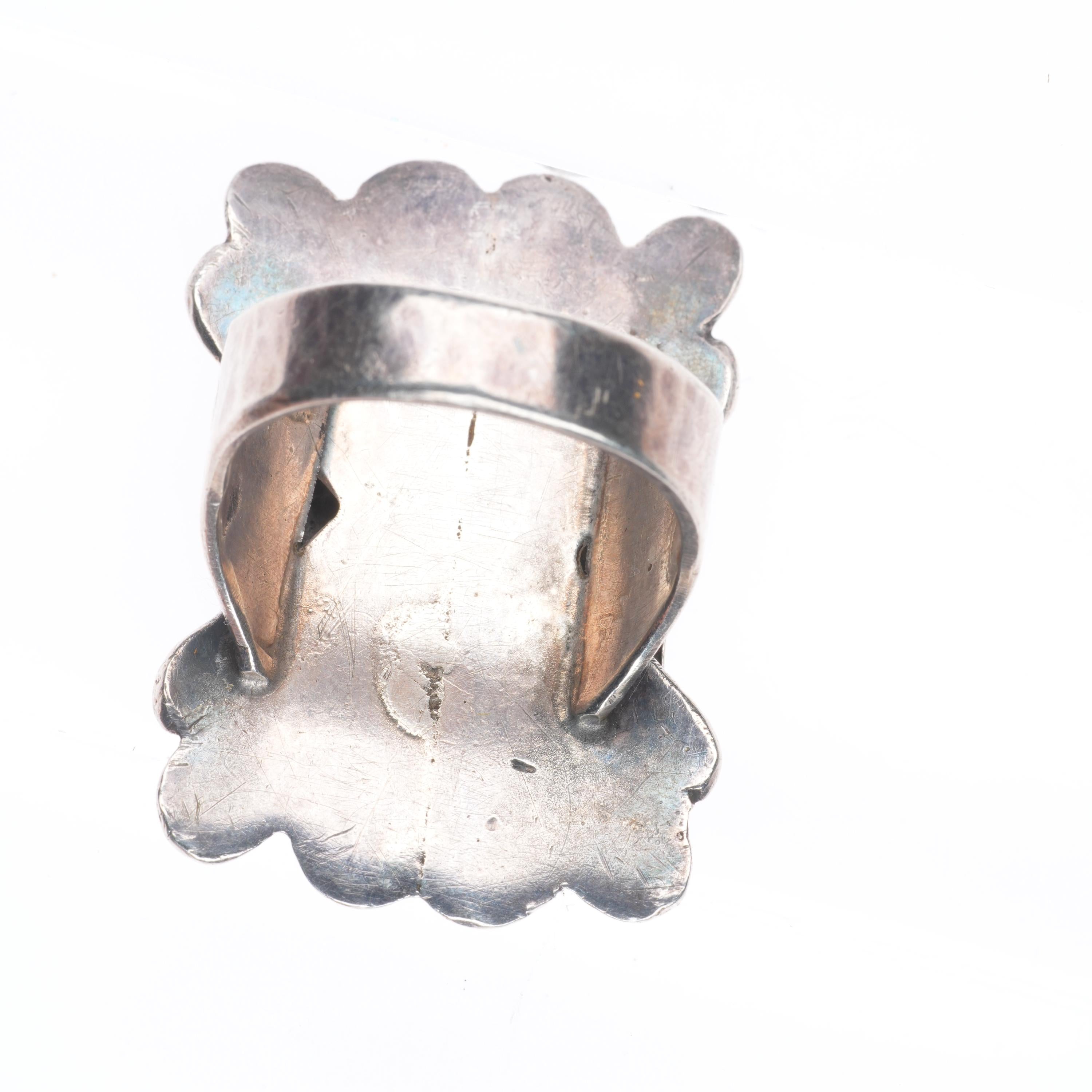 sz12 30's-40's Big Navajo sterling silver cast top ring with turquoise.. Tested and guaranteed solid sterling silver, circa second quarter of the 20th century. Some expected wear, weight and measurements in pictures. Old repair to fractures in stone, I'm unsure if they used silver to fill it or something else.