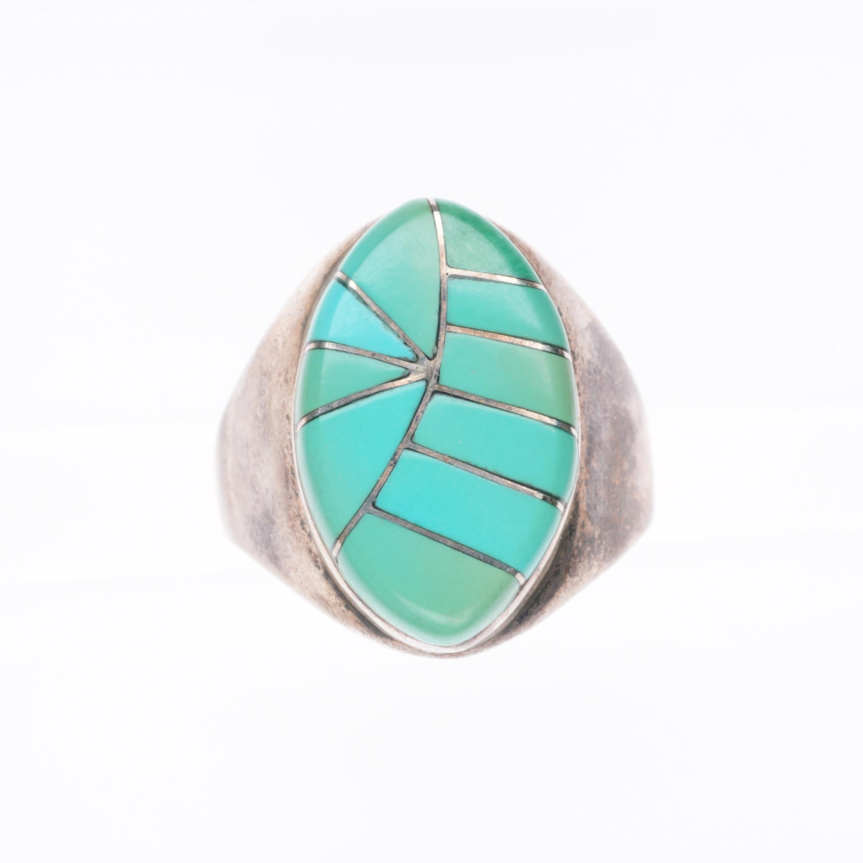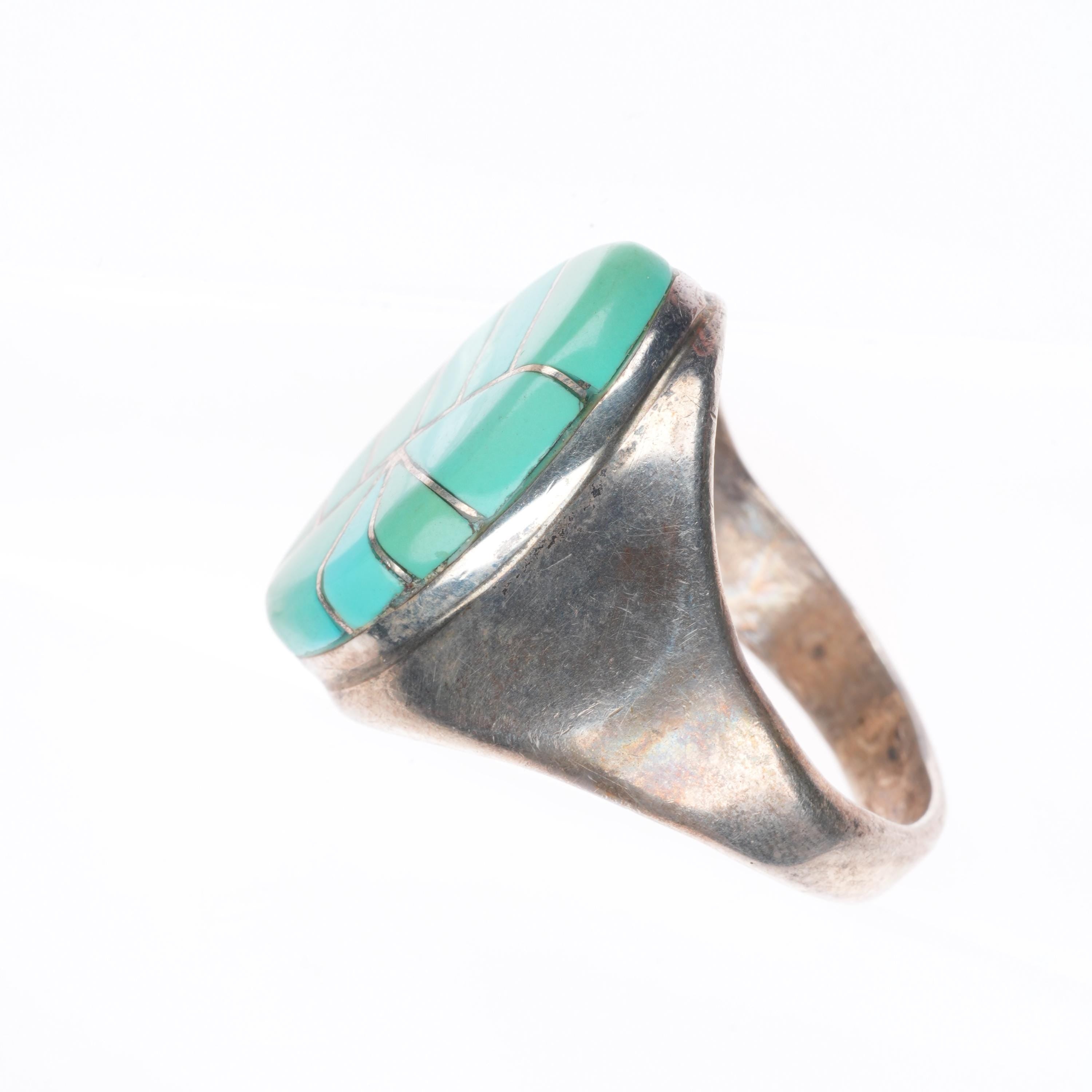 sz12 vintage Zuni sterling silver turquoise channel inlay men's ring. Tested and guaranteed solid sterling silver, circa third quarter of the 20th century. Some expected wear, weight and measurements in pictures. Apparently unmarked.
