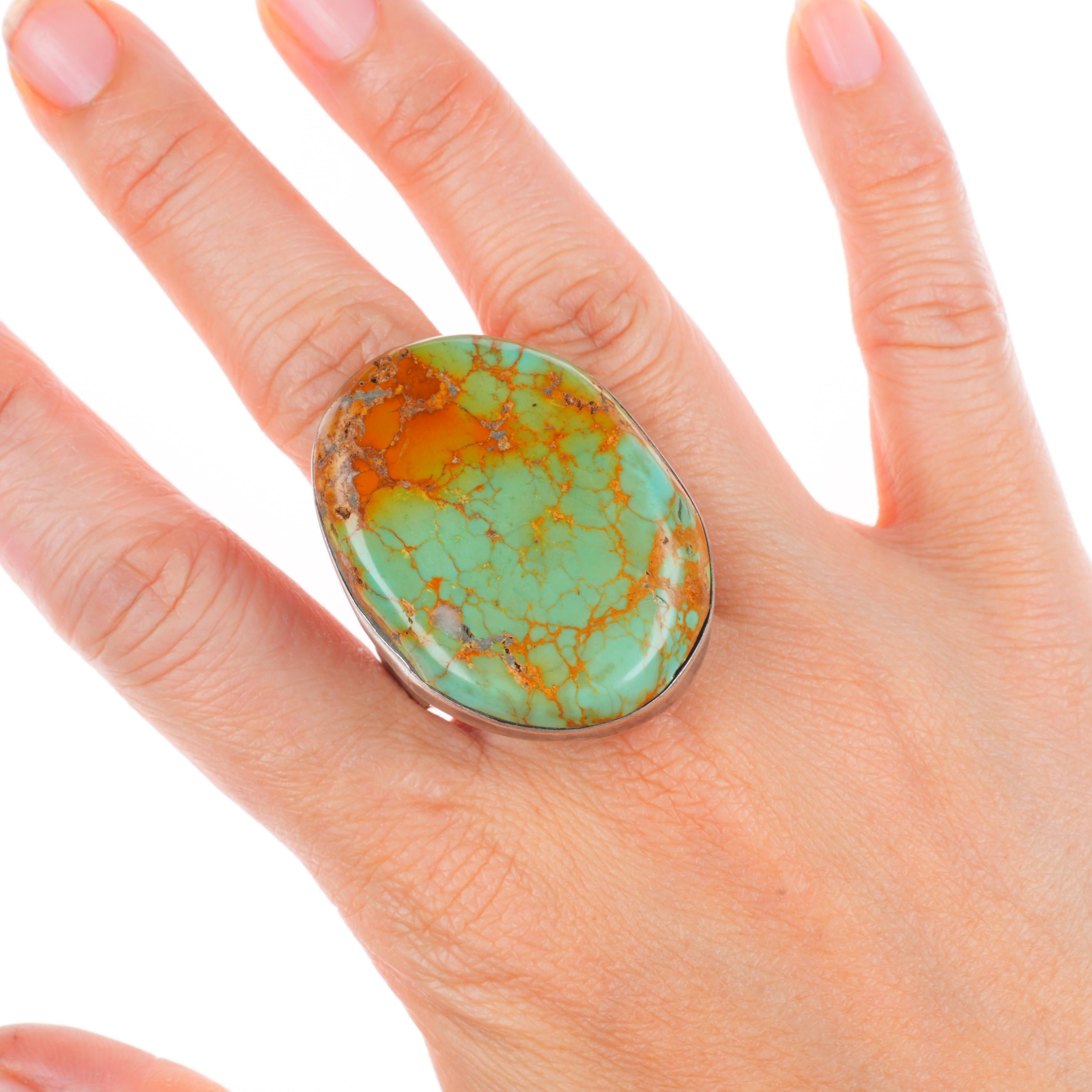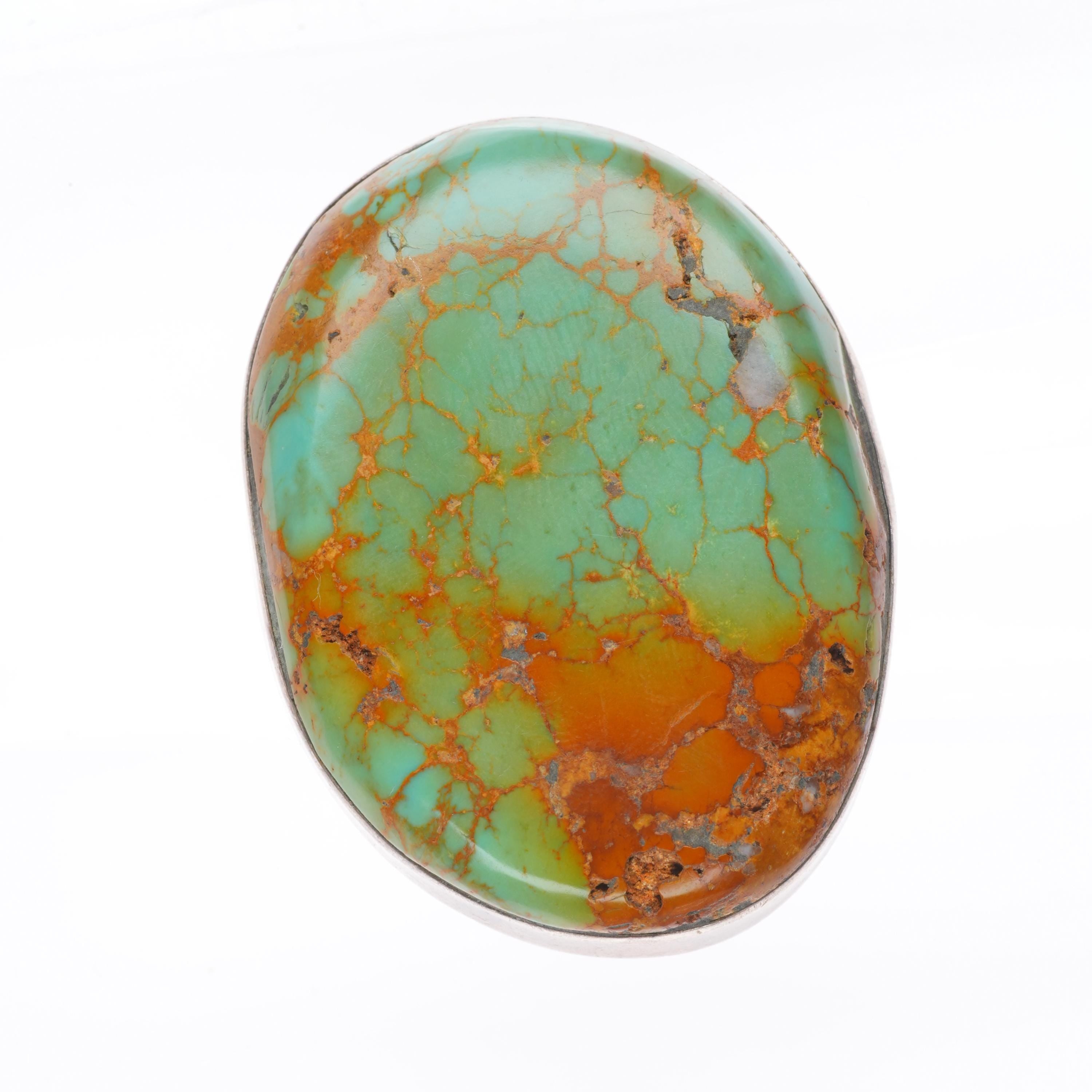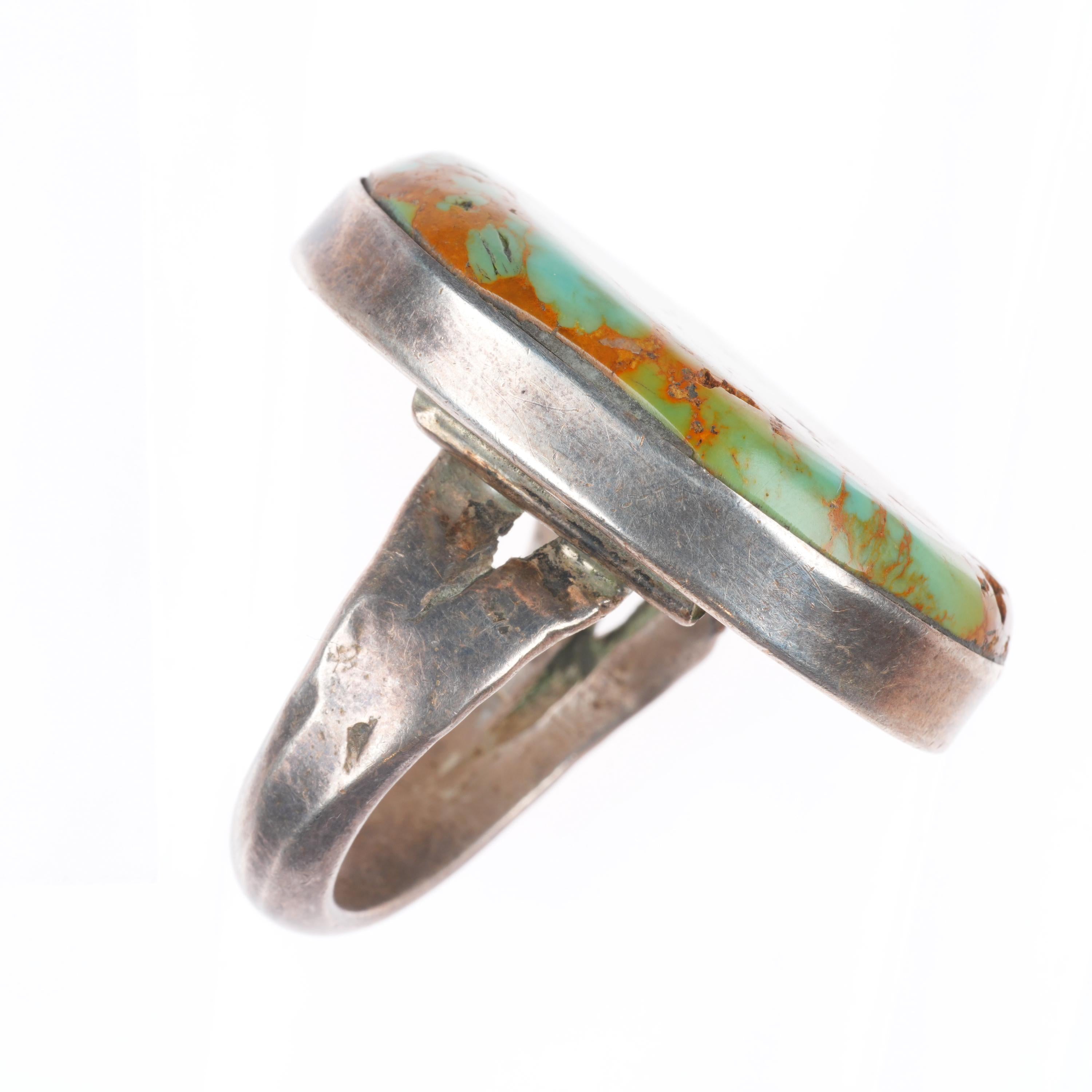 sz14 Big vintage Navajo sterling silver ceremonial Kingman turquoise ring. Tested and guaranteed solid sterling silver, circa third quarter of the 20th century. Some expected wear, weight and measurements in pictures.