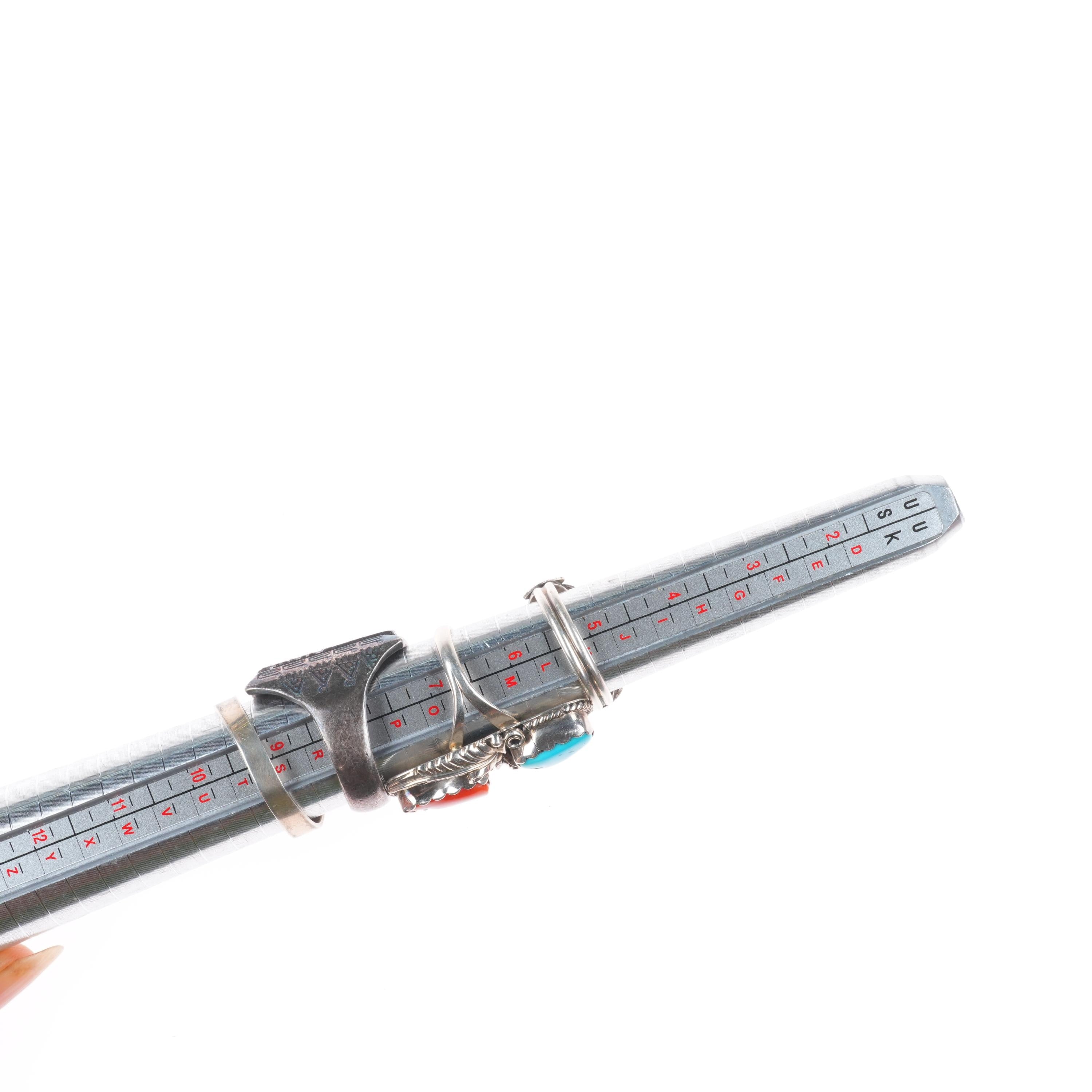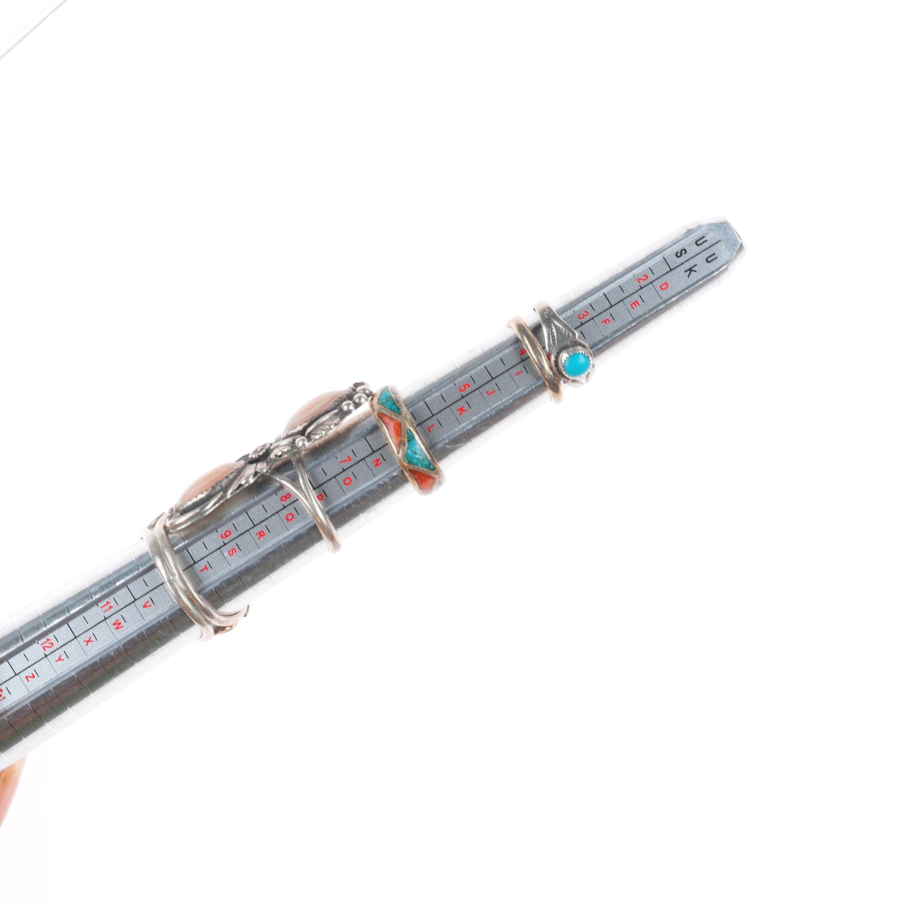 sz5-10 Southwestern/Navajo sterling silver turquoise/coral/shell ring lot. Tested and guaranteed solid sterling silver, circa 20th century. Some expected wear, weight and measurements in pictures.