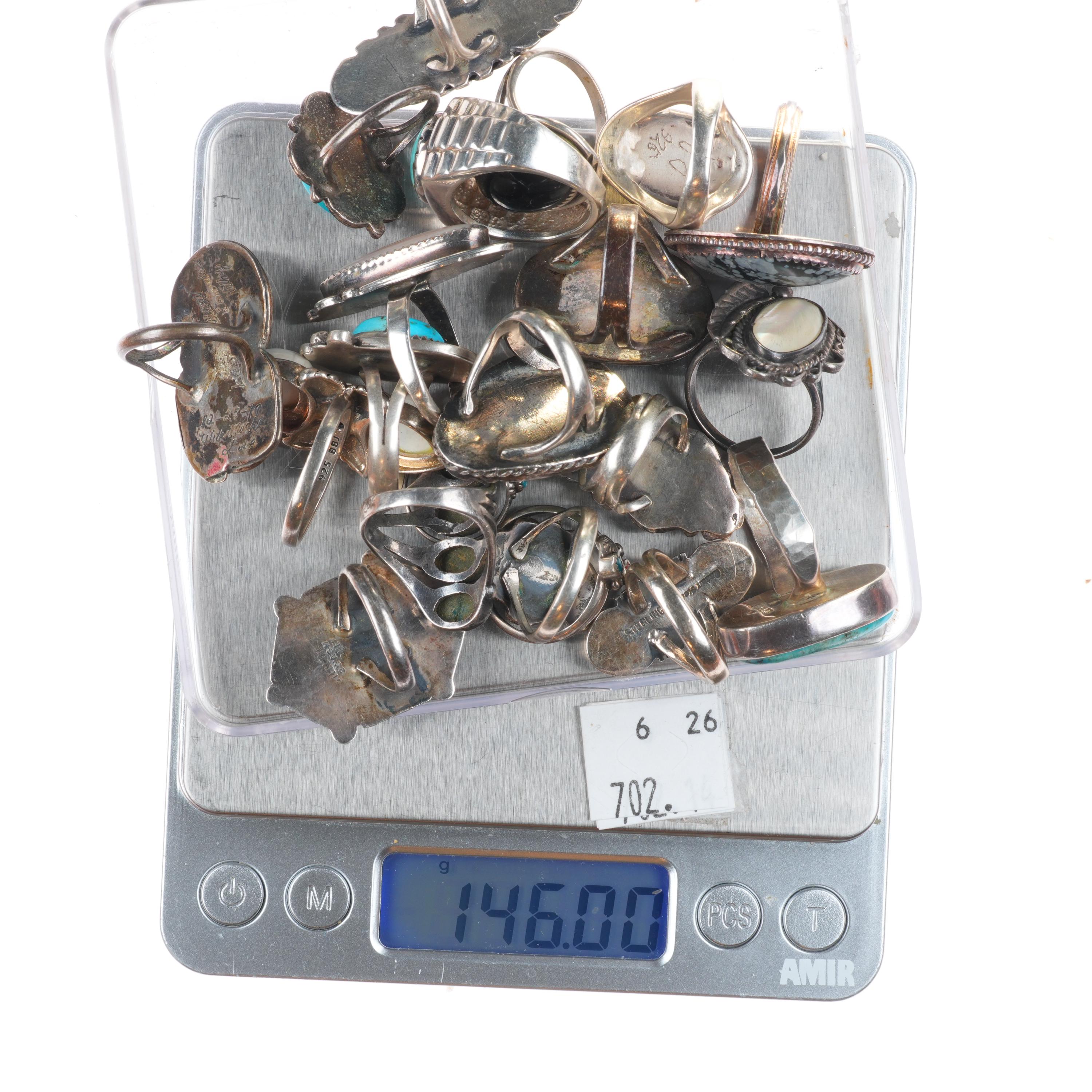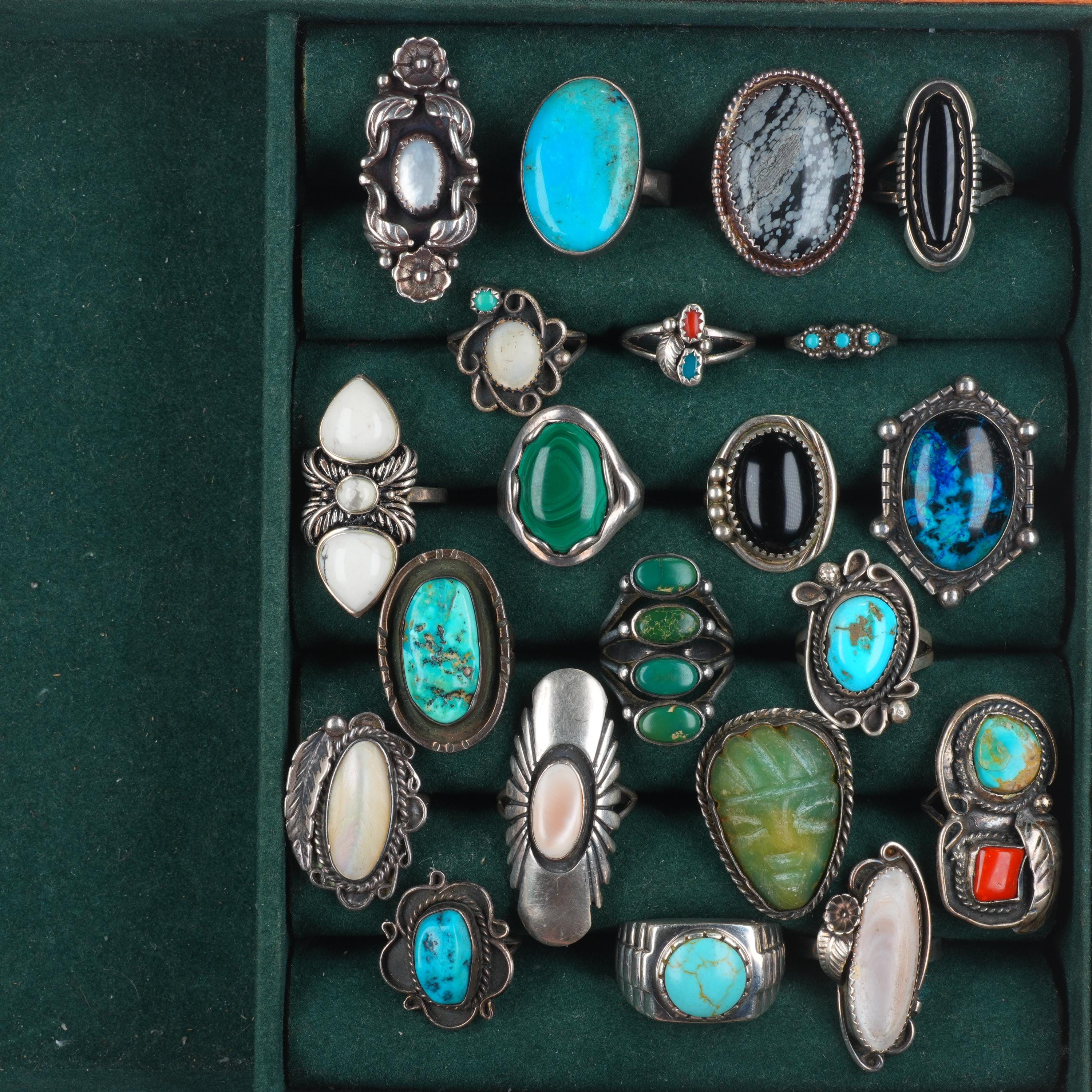 sz4-12 Southwestern/Navajo sterling silver turquoise/coral/shell ring lot. Tested and guaranteed solid sterling silver, circa 20th century. Some expected wear, weight and measurements in pictures.