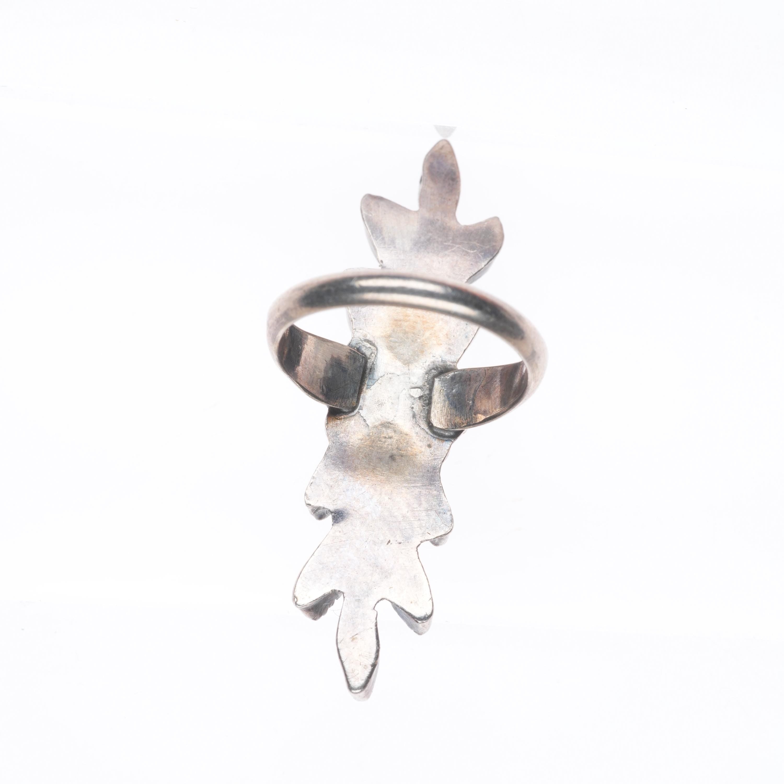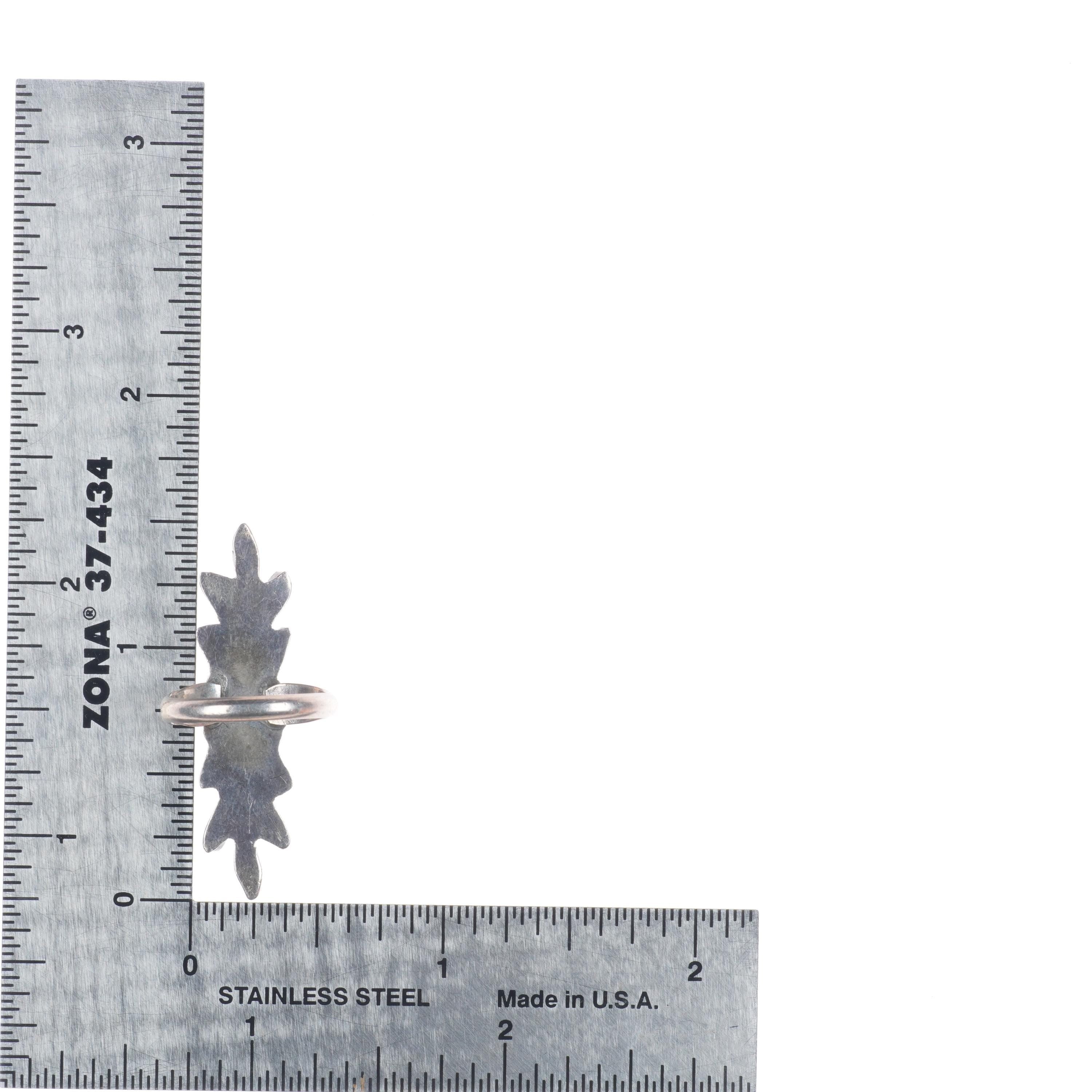 sz4.5 Vintage Zuni sterling silver long needlepoint turquoise ring. Tested and guaranteed solid sterling silver, circa mid 20th century. Some expected wear, weight and measurements in pictures.