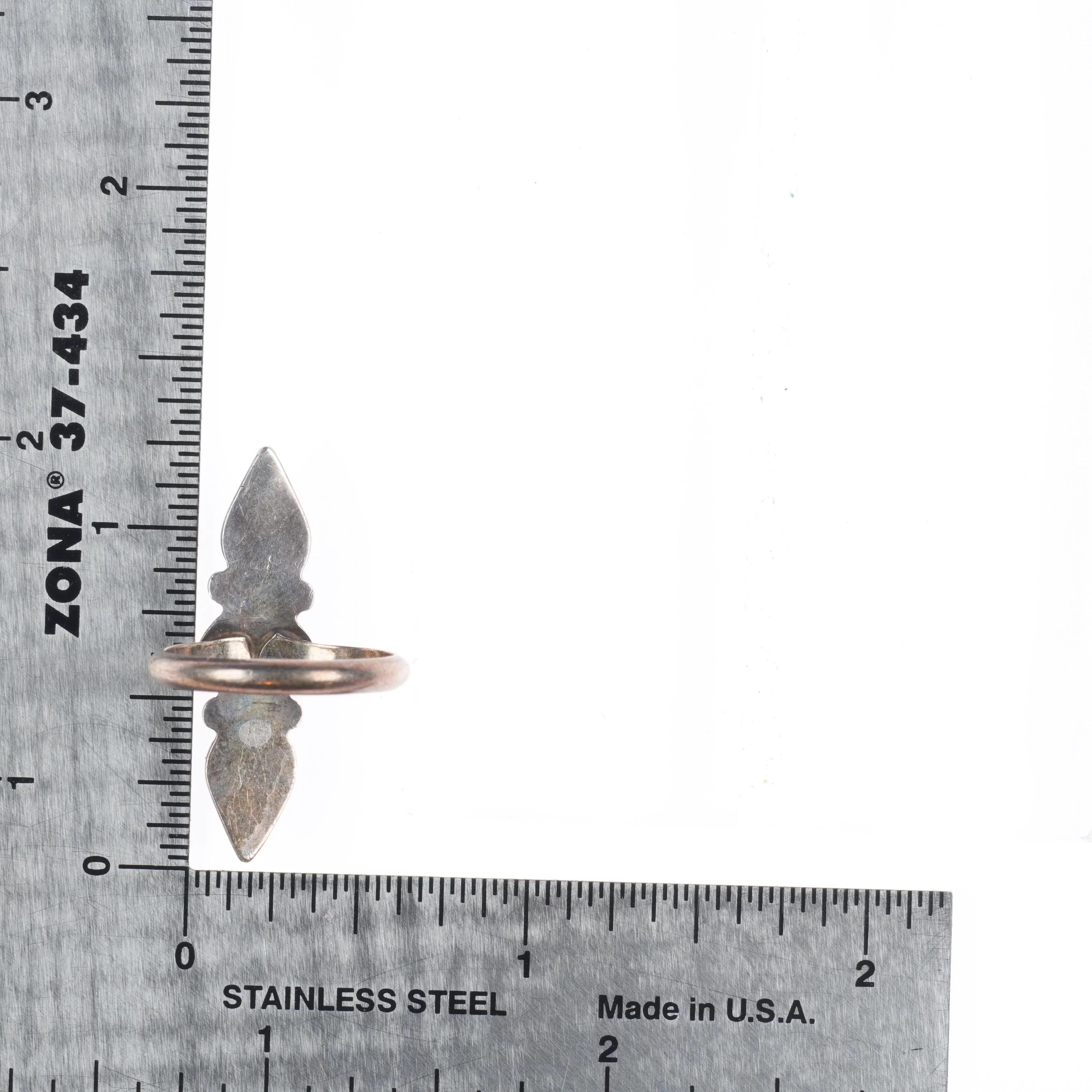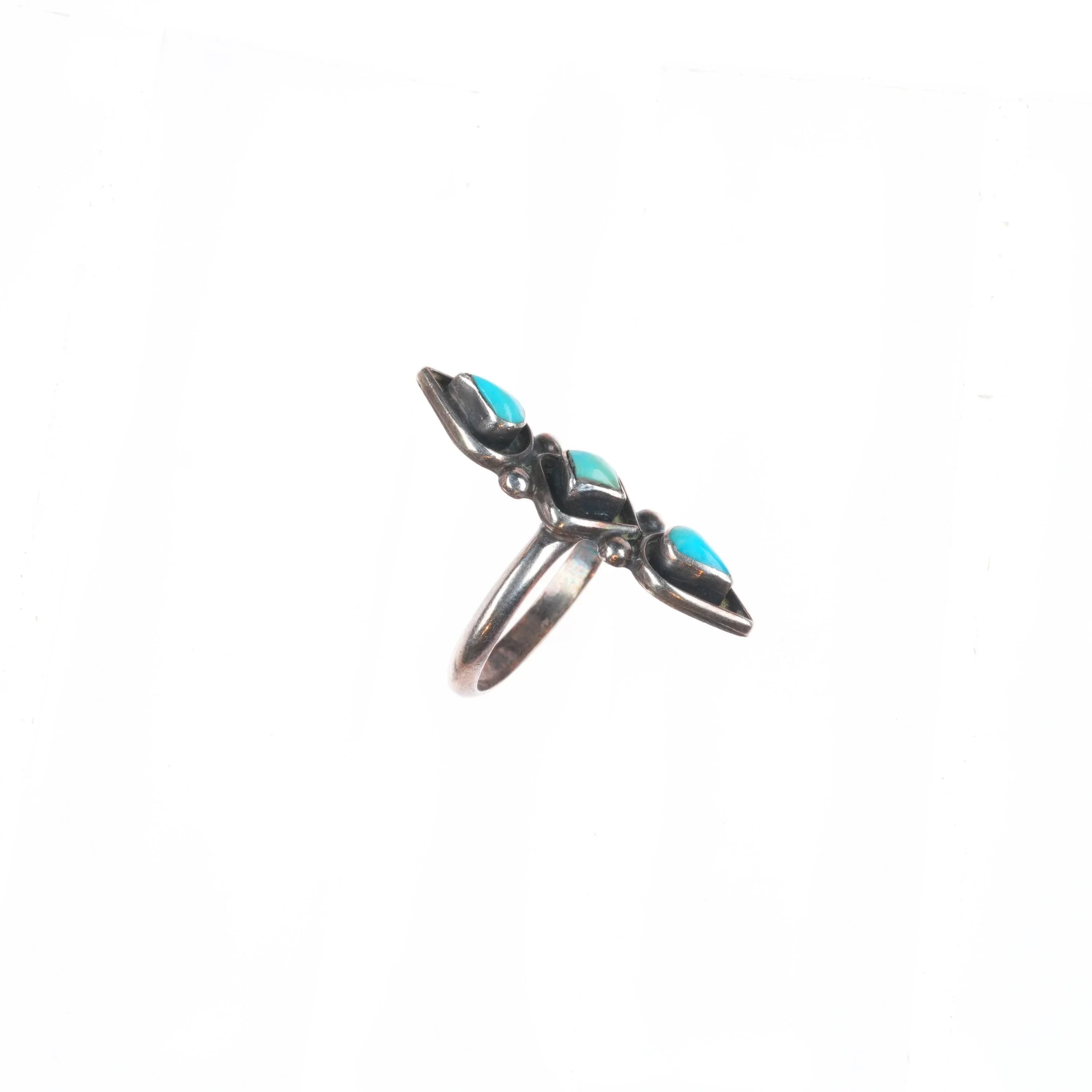 sz5.75 Vintage Zuni sterling silver 3 stone flush inlay turquoise ring. Tested and guaranteed solid sterling silver with weight and measurements in pictures. Nice ring from the third quarter of the 20th century. expected wear with no damage. Unmarked.