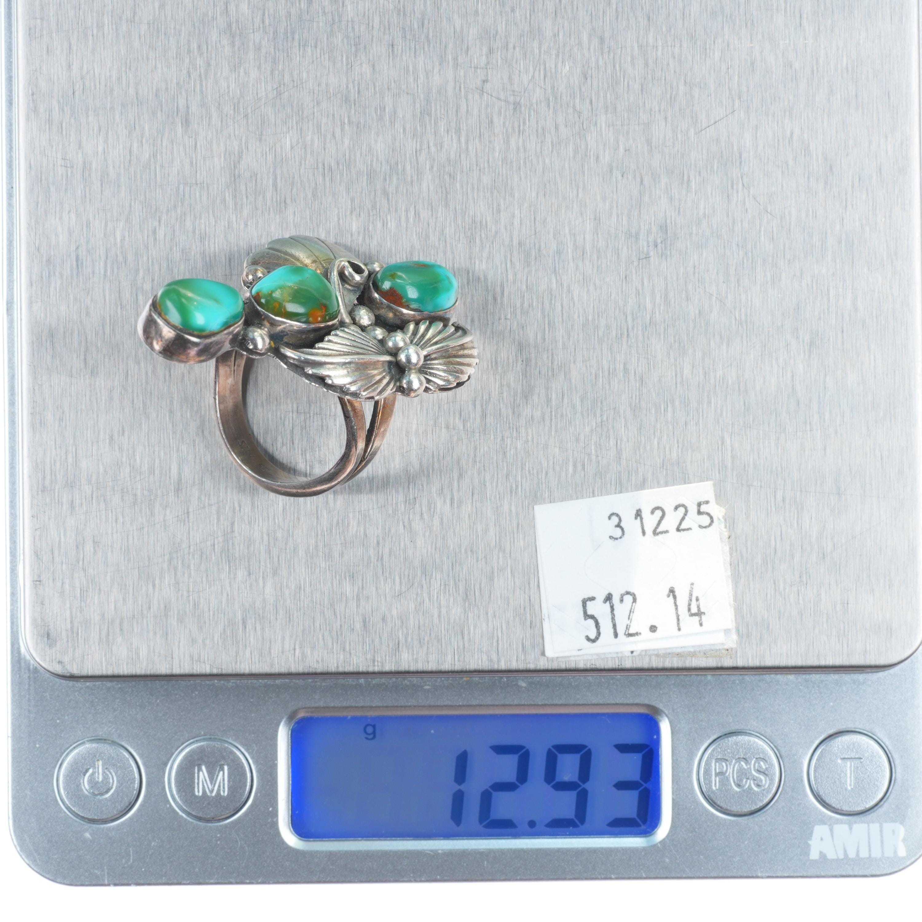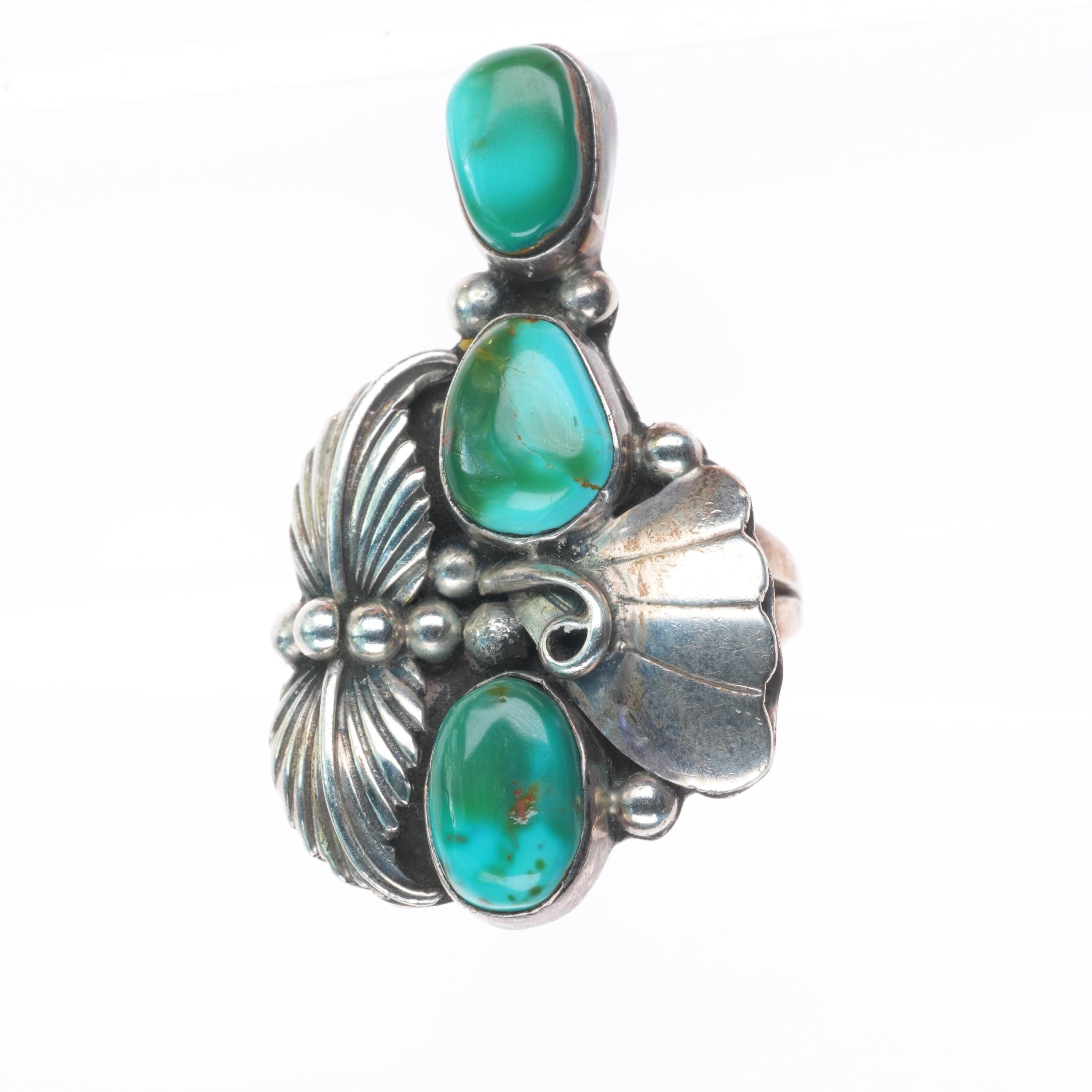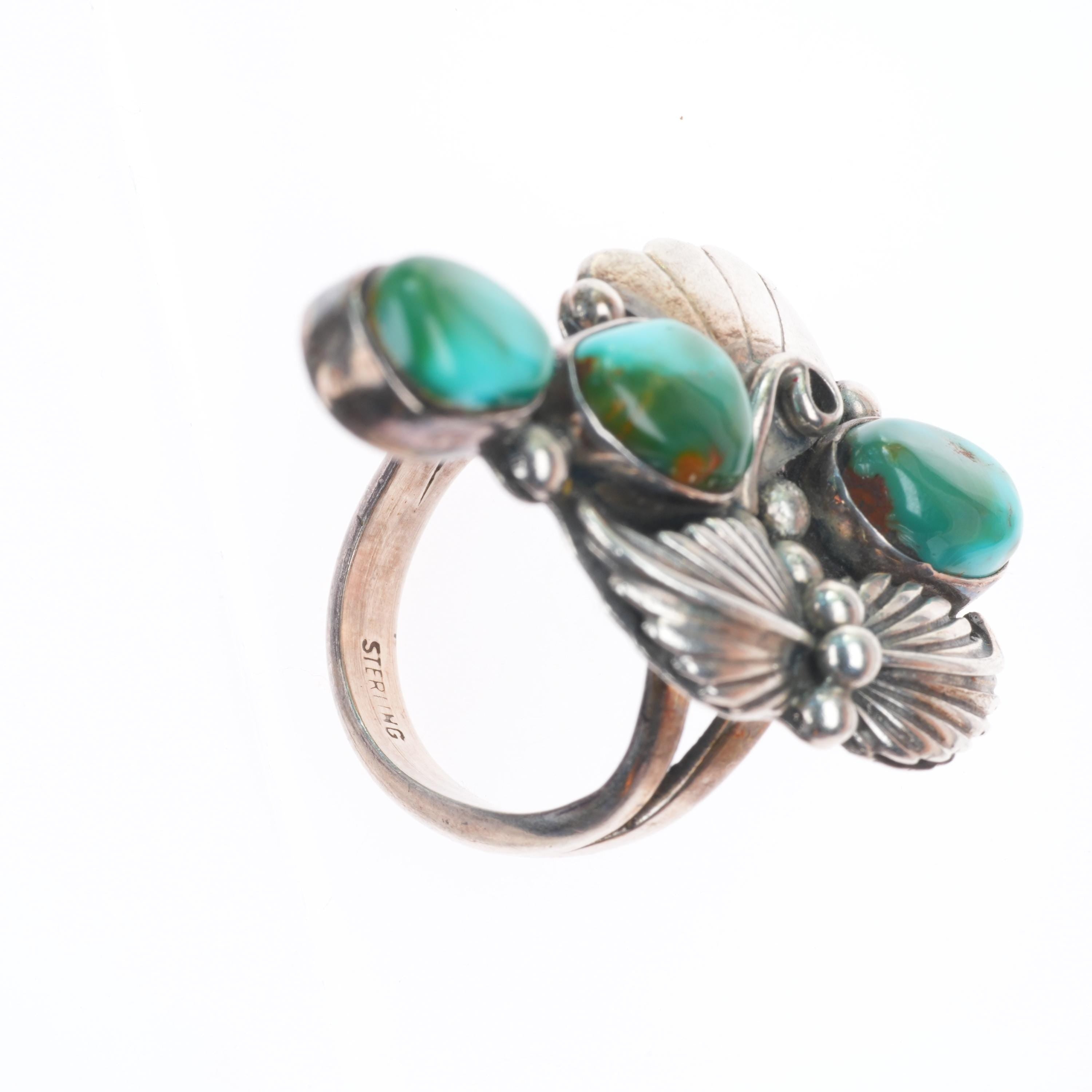 sz8.5 Vintage Royston turquoise big sterling silver Navajo long ring 3 stone
