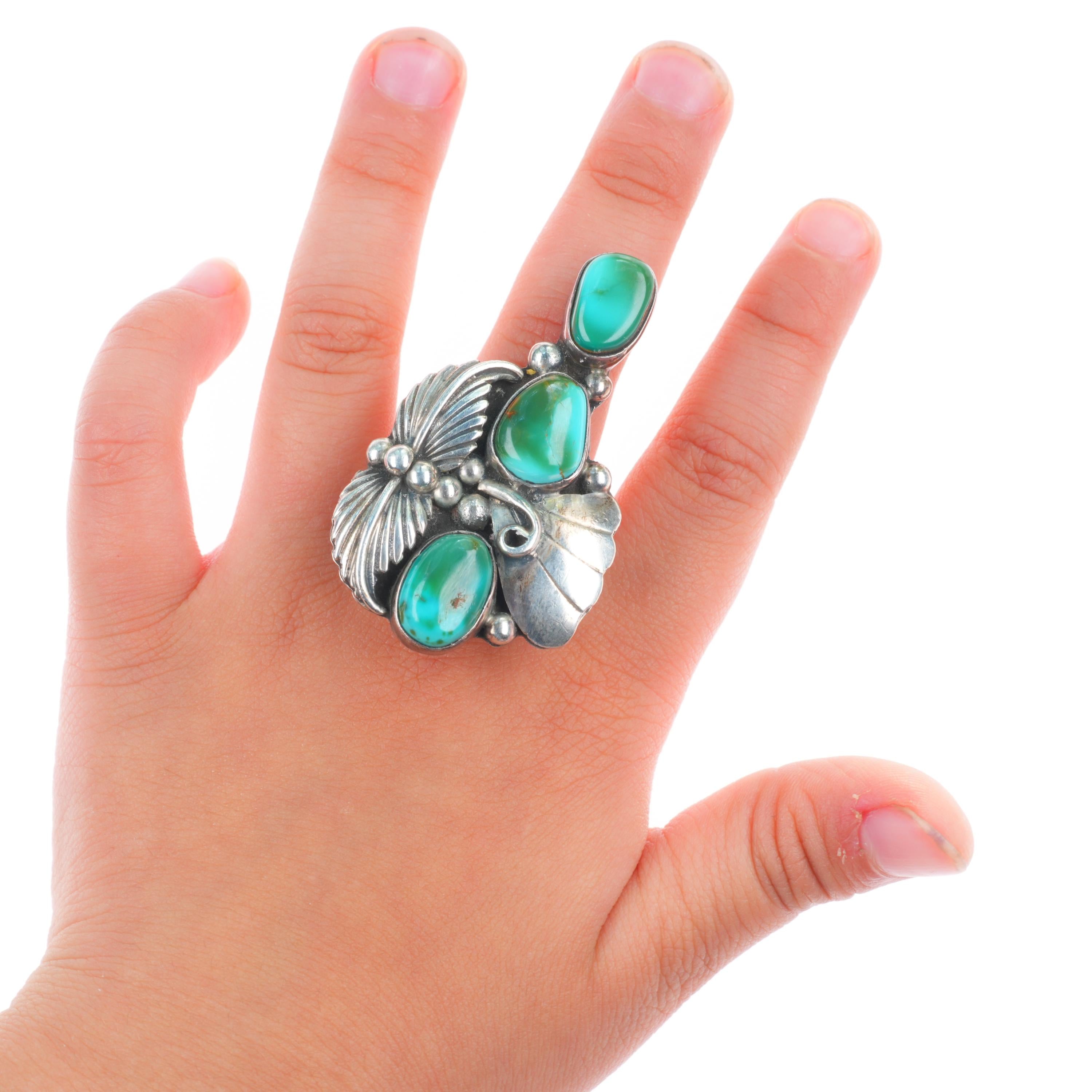 sz8.5 Vintage Royston turquoise big sterling silver Navajo long ring 3 stone. Tested and guaranteed solid sterling silver, circa third quarter of the 20th century. Some expected wear, weight and measurements in pictures. Shown on 3 year old's hand, so it's large but not that large.