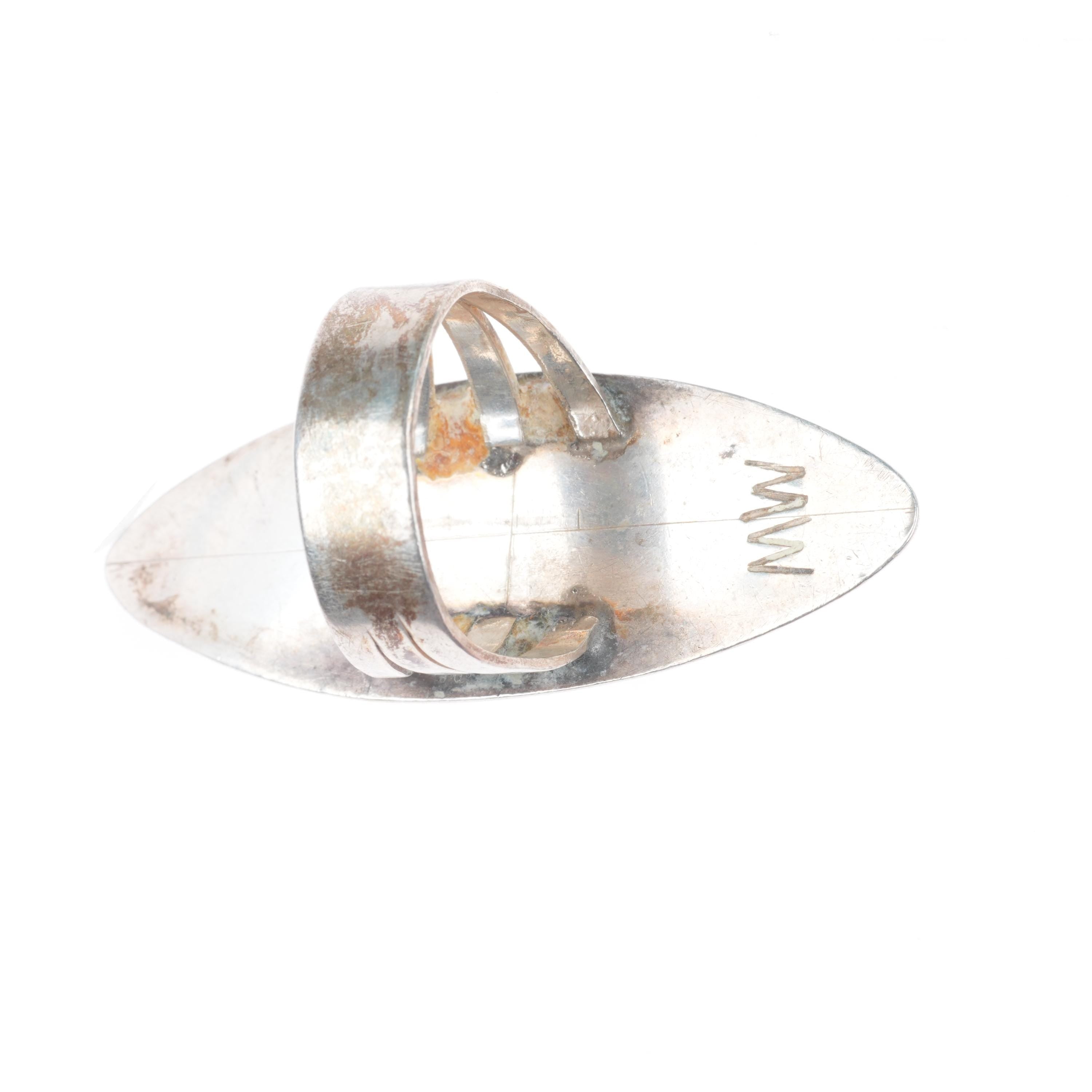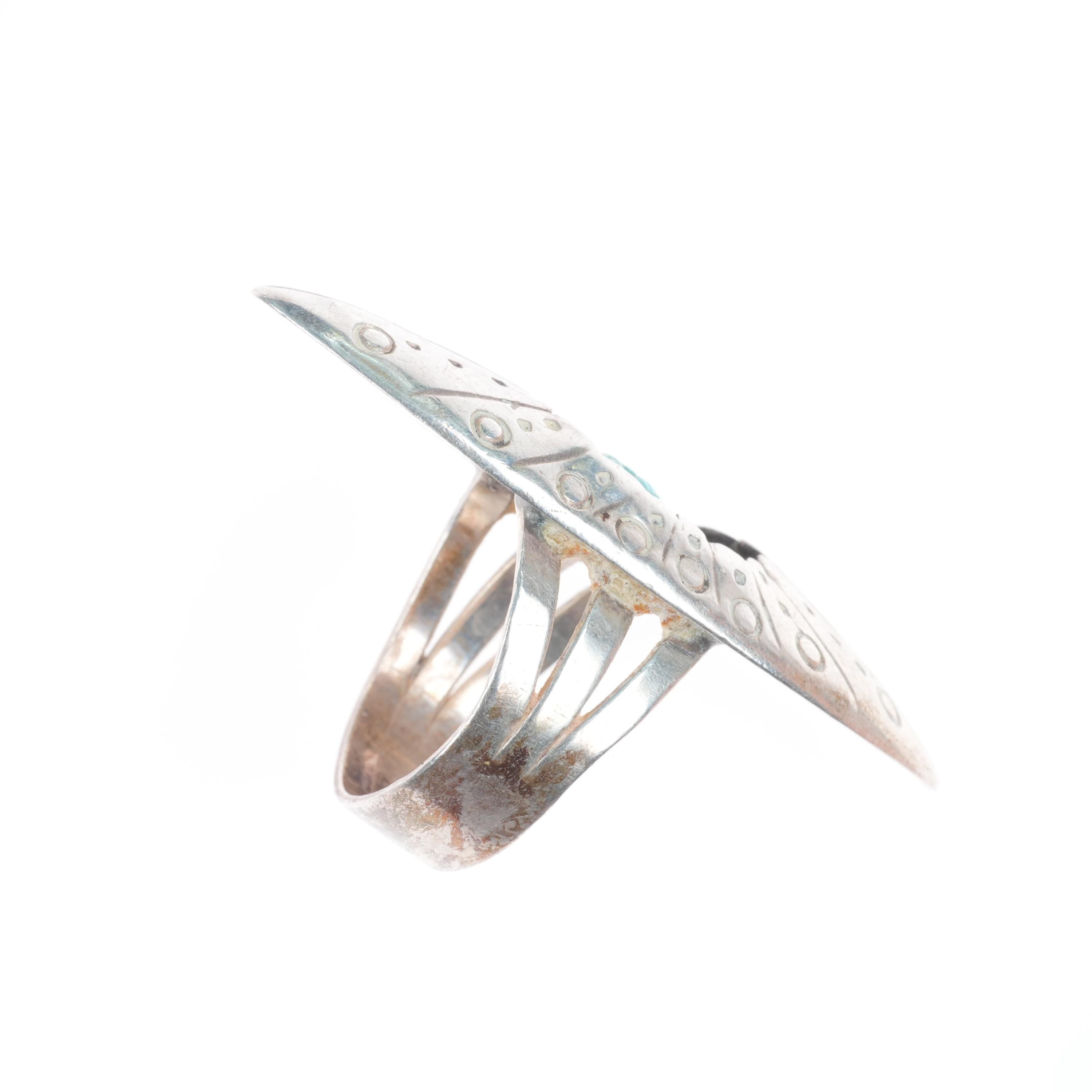 sz8 MW Navajo sterling silver long shadowbox stamped ring with turquoise. Tested and guaranteed solid sterling silver, circa third quarter of the 20th century. Some expected wear, weight and measurements in pictures.