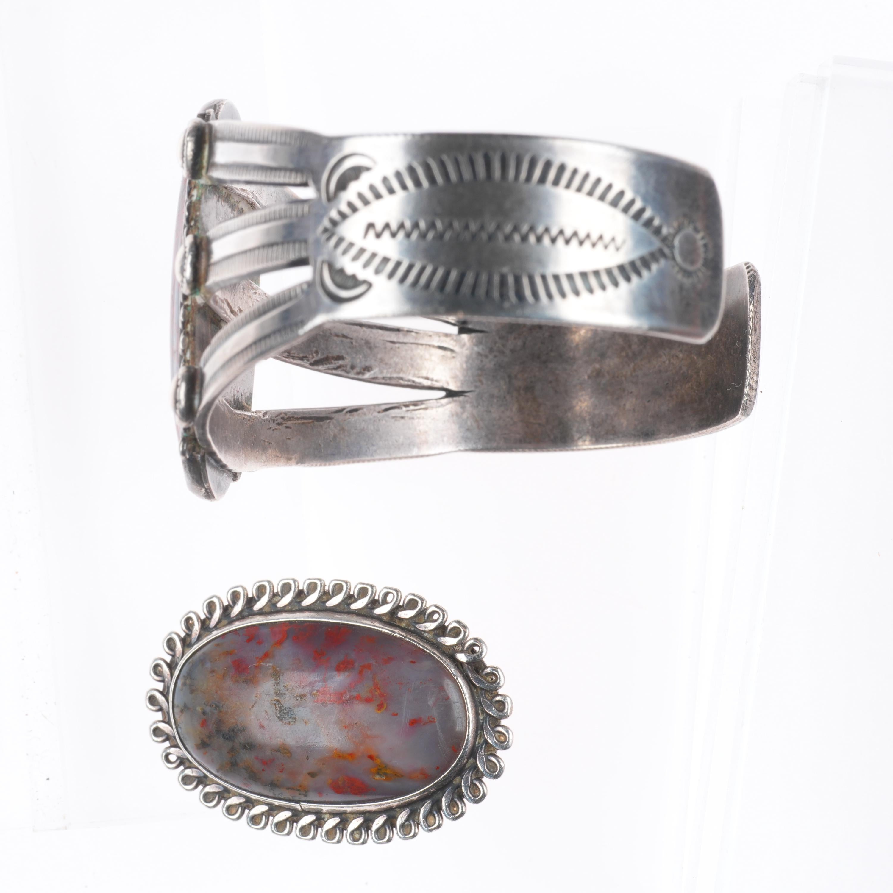 sz8 ring 6.8" c1940 Navajo sterling silver petrified wood cuff bracelet set. Tested and guaranteed solid sterling silver, weight and measurements in photos. Third second quarter of the 20th century.