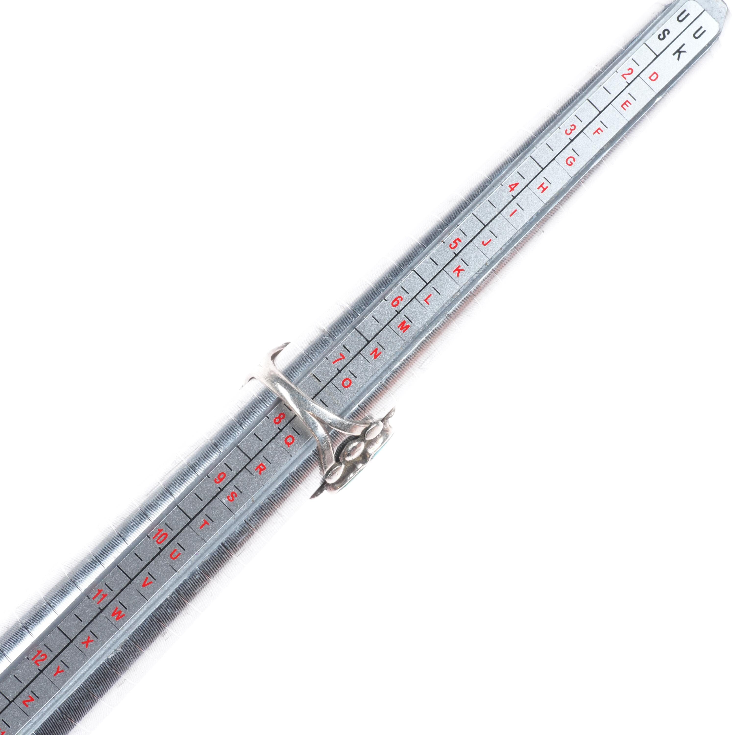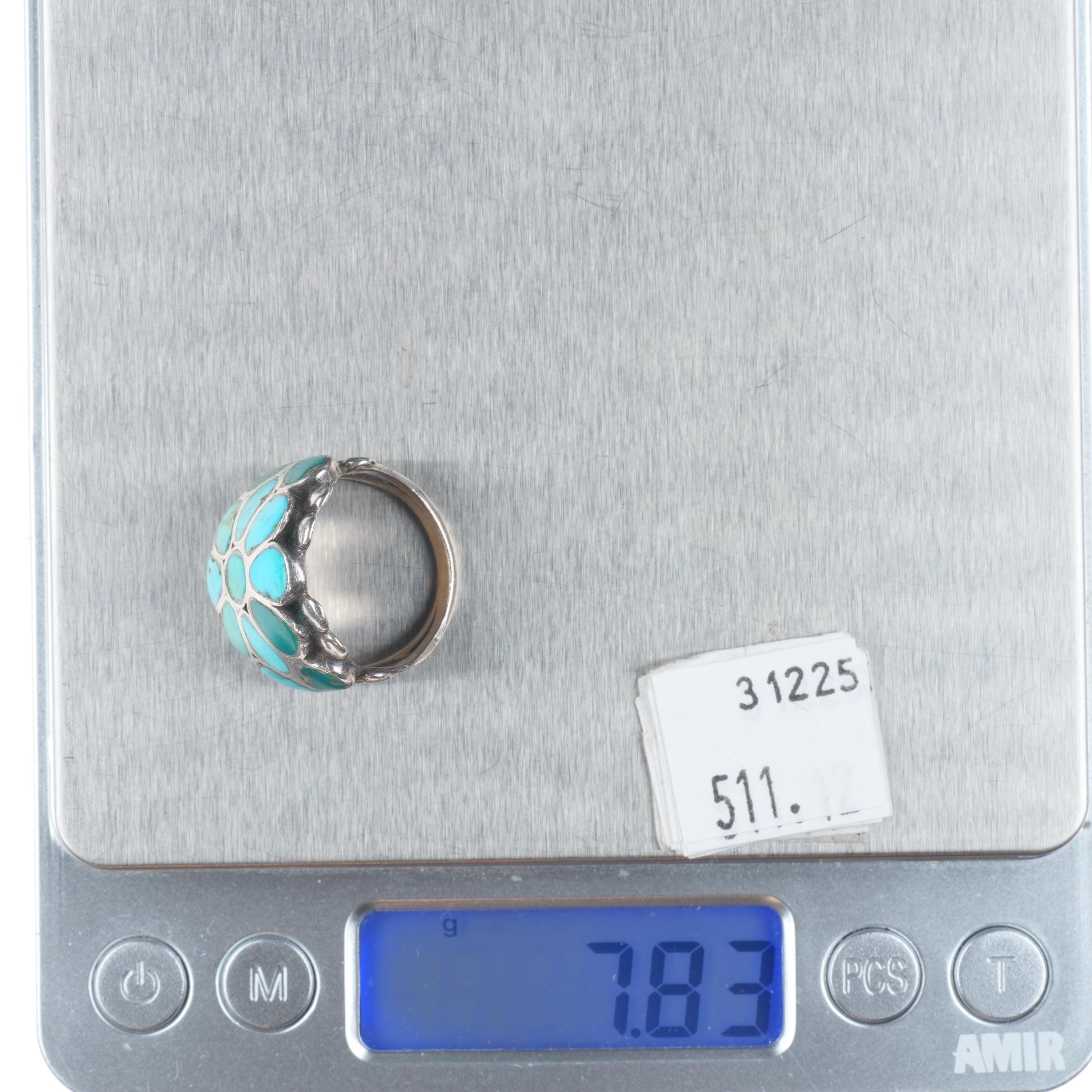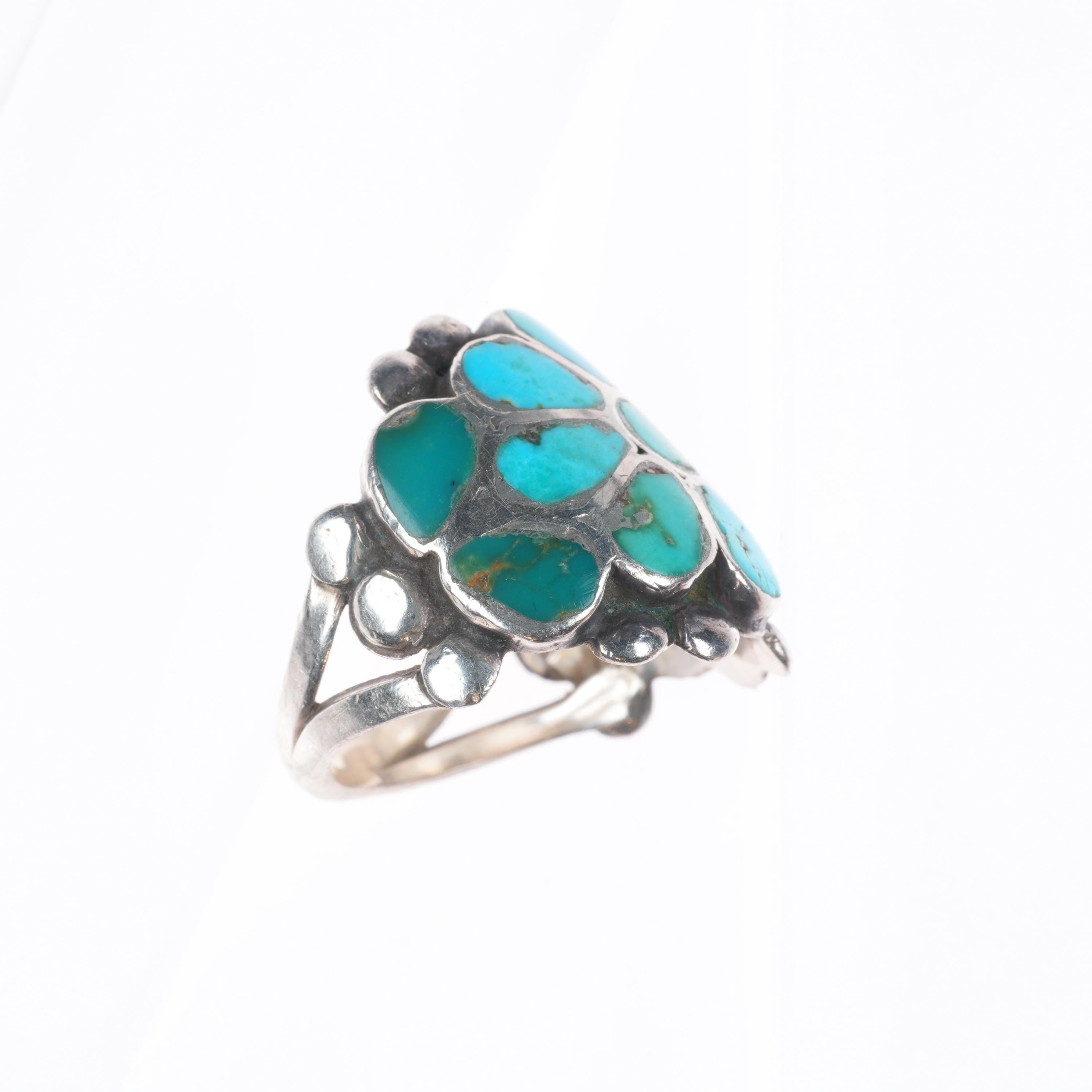 sz8 Vintage Zuni sterling silver flush inlay turquoise floriform ring. Nice ring from the third quarter of the 20th century. Unmarked.