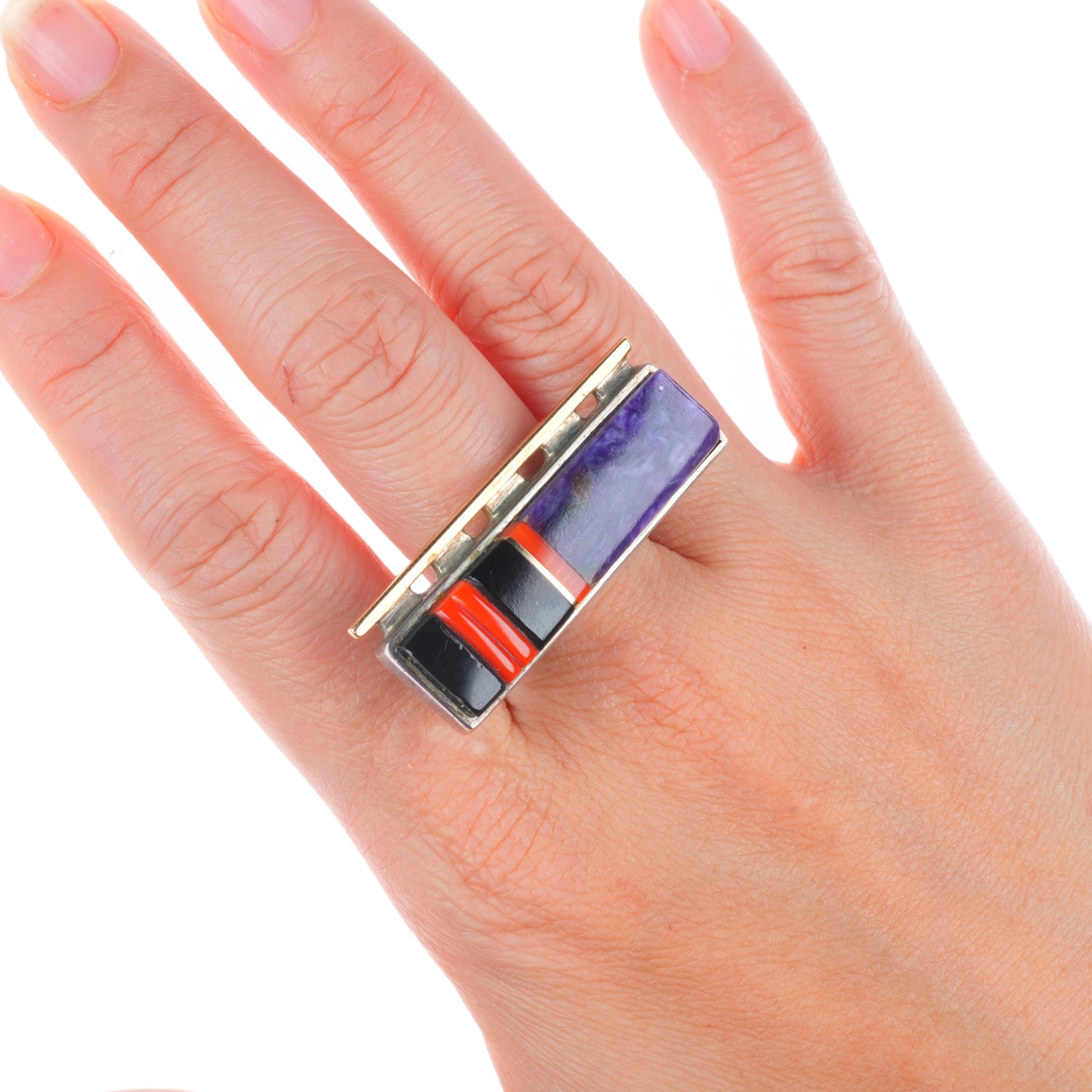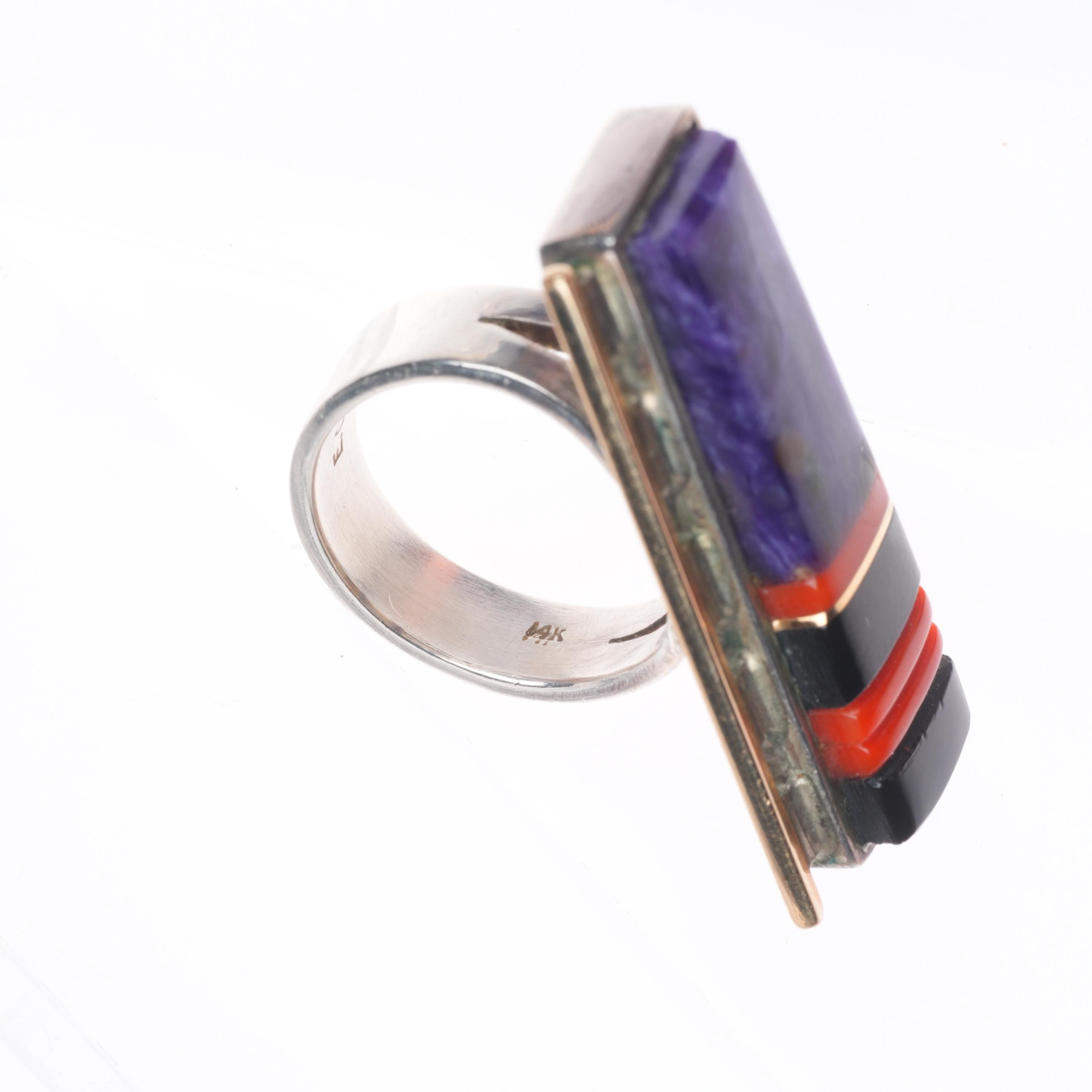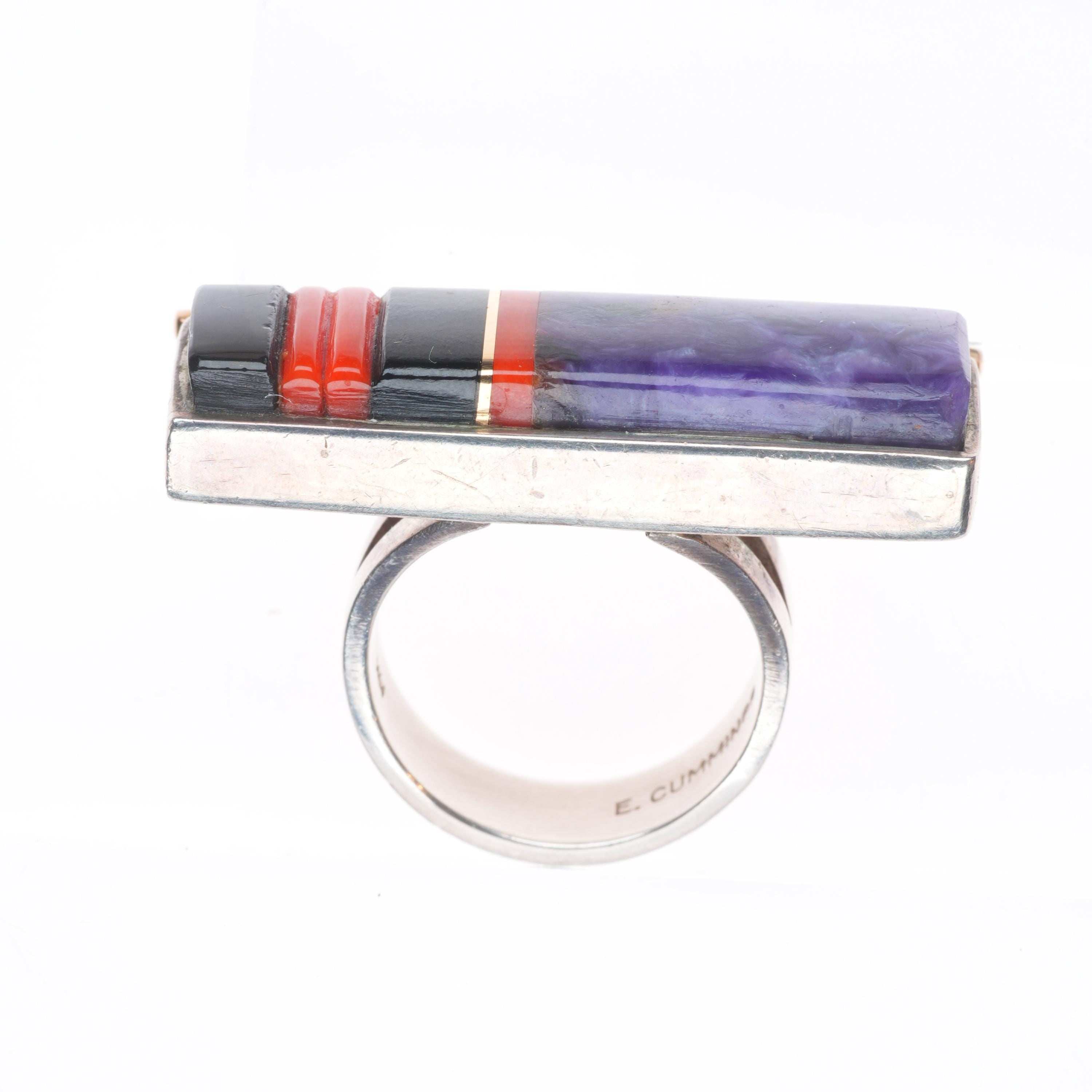 sz9.25 Edison Cummings Navajo sterling silver 14k gold sugilite, coral ring . Tested and guaranteed solid 14k gold side bar and inlay, the rest solid sterling silver, circa last quarter of the 20th century. Some expected wear, weight and measurements in pictures.