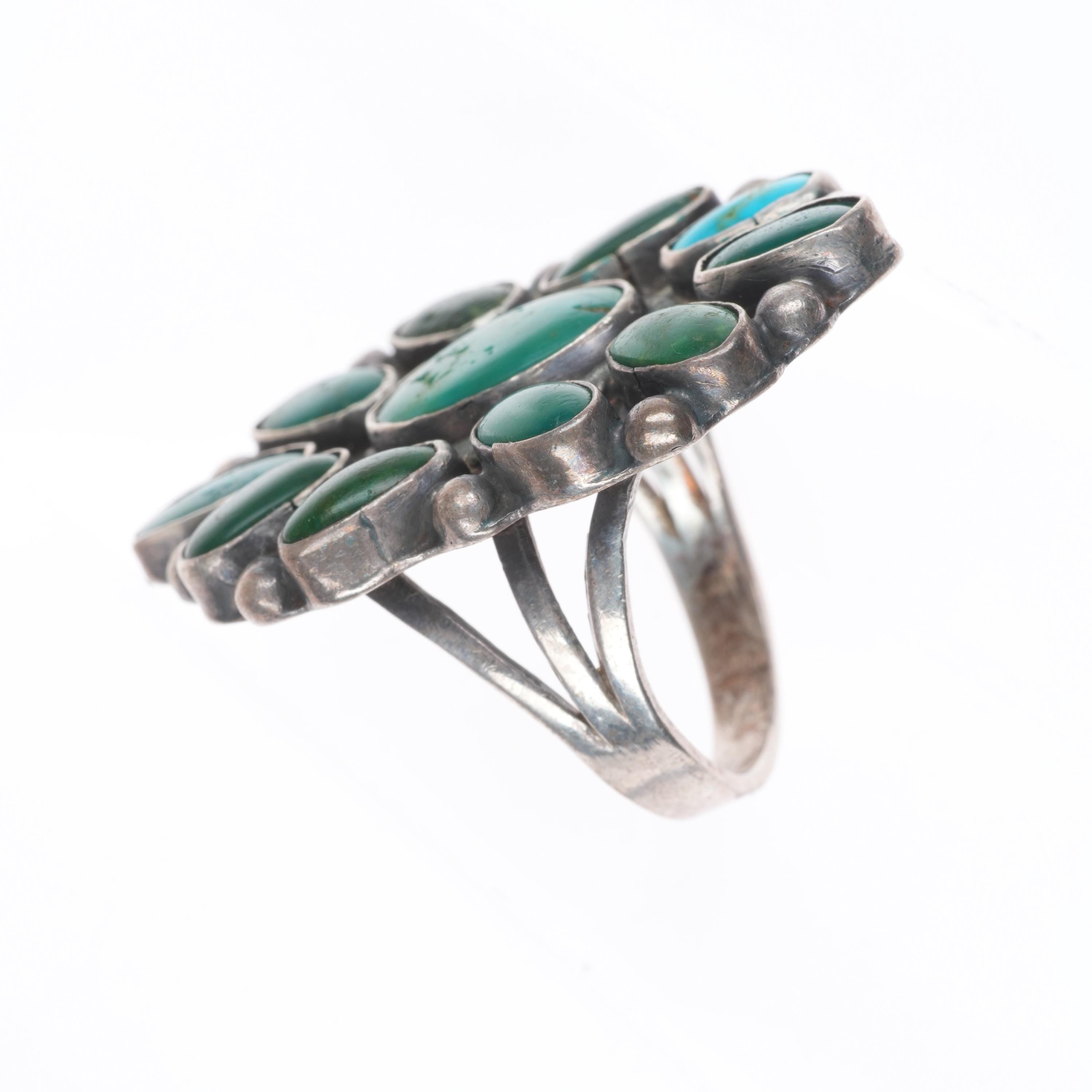 sz9.5 30's-40's Zuni sterling silver greasy green turquoise cluster ring