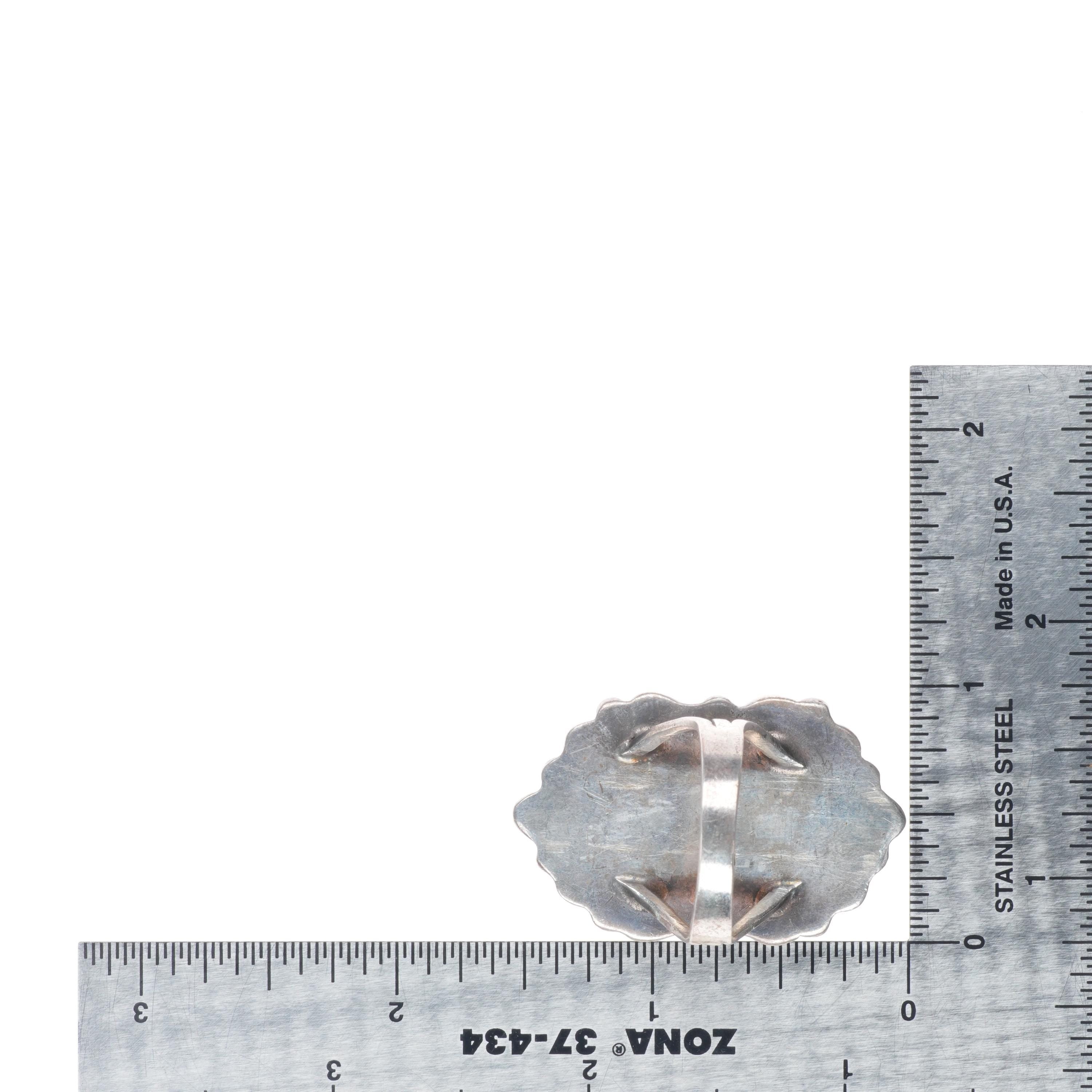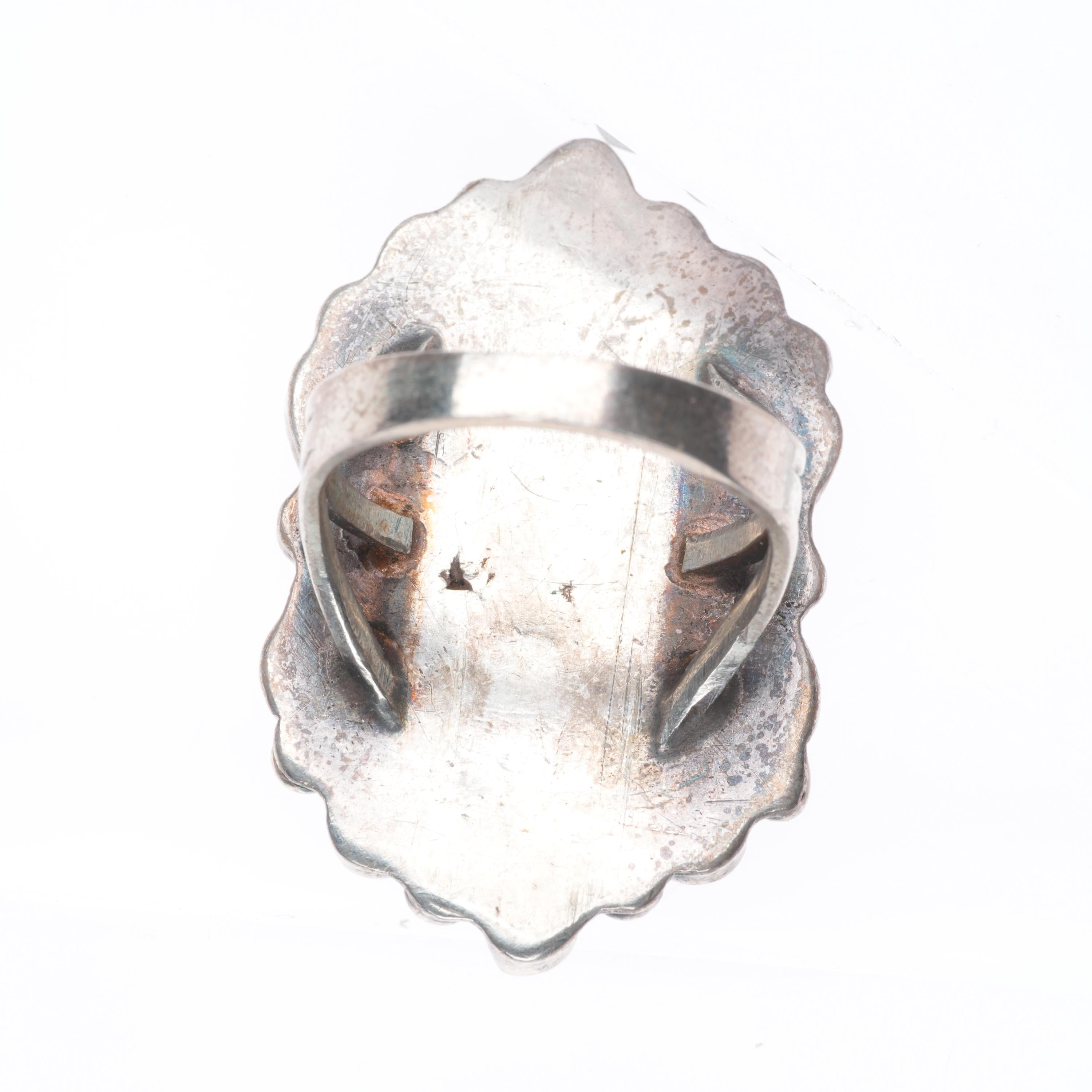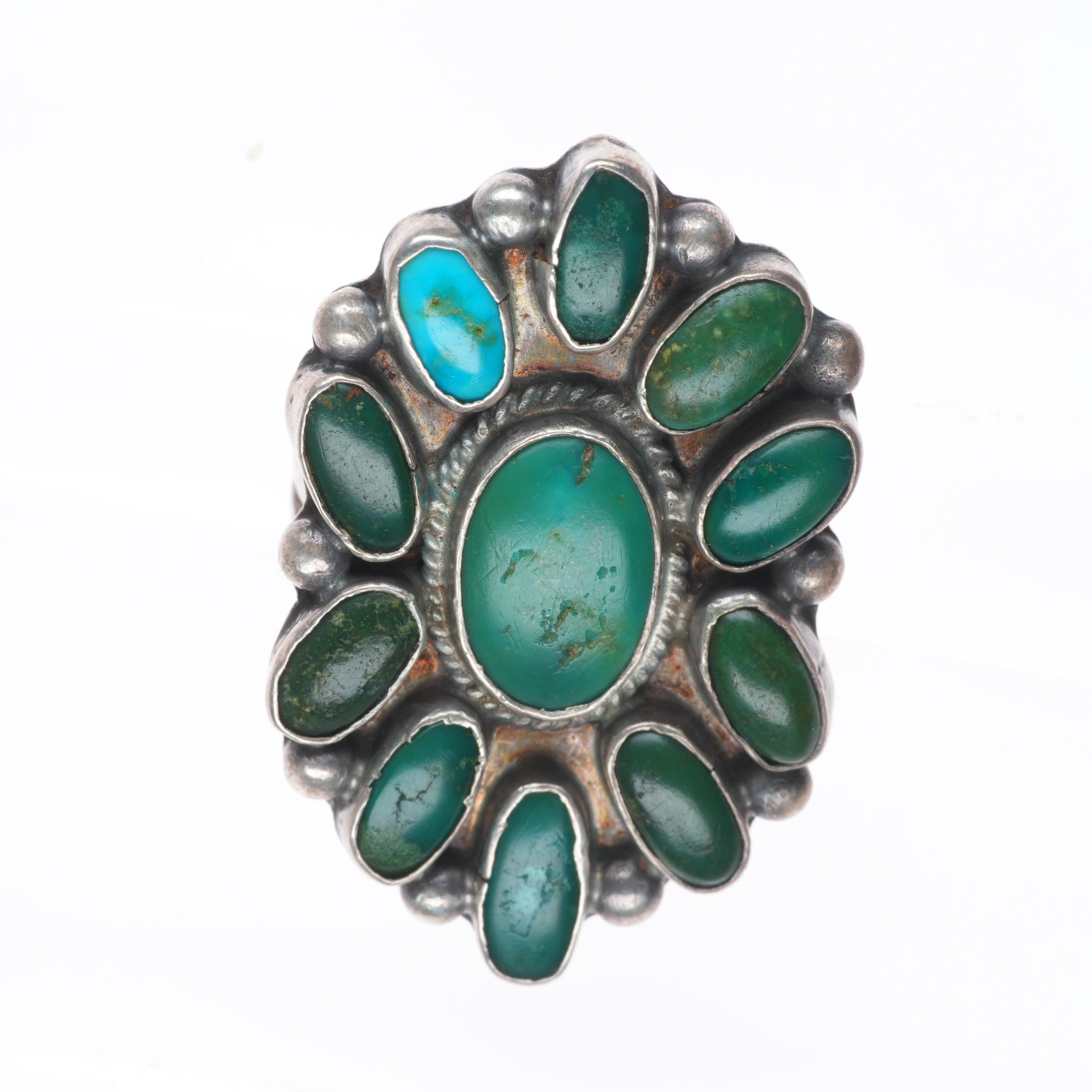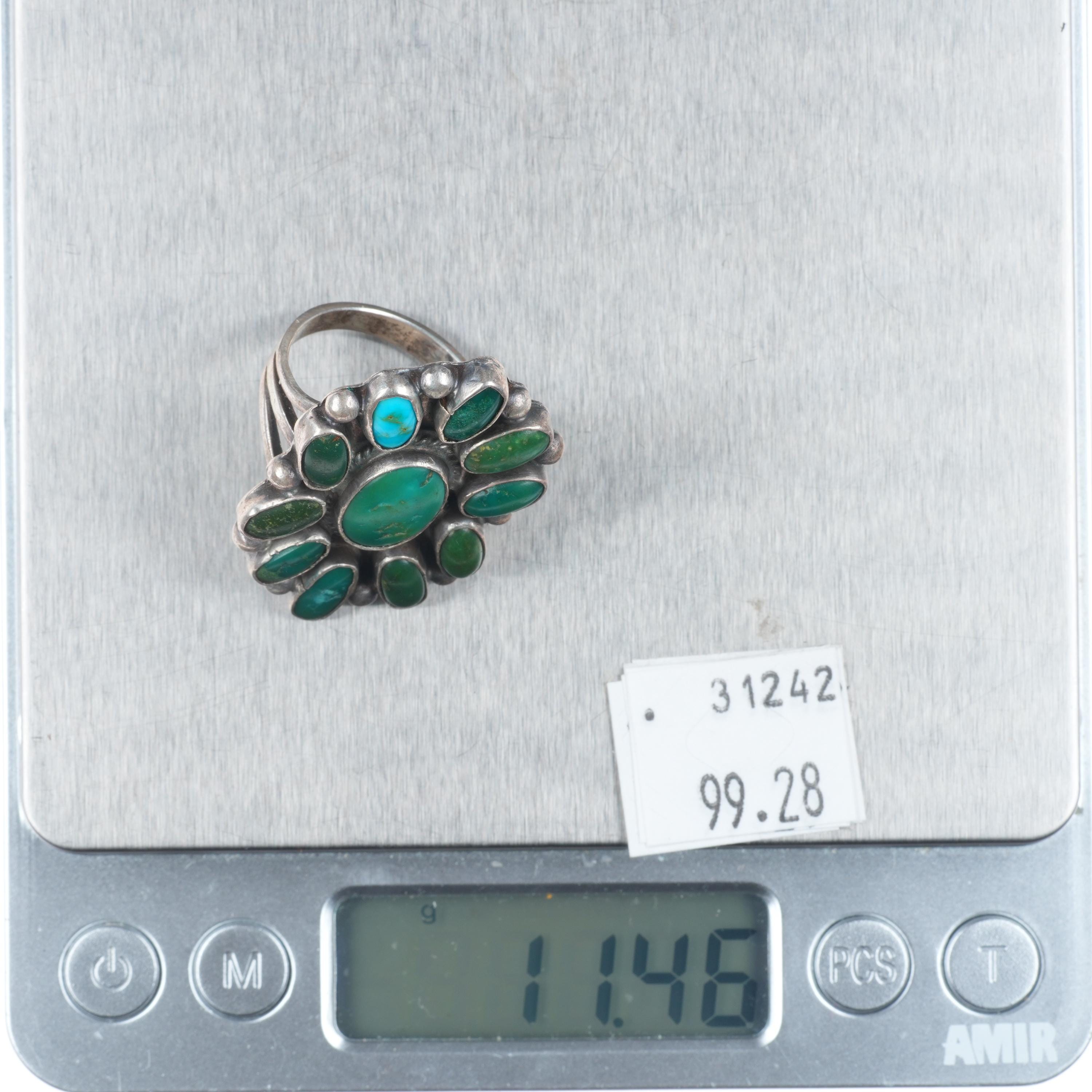 sz9.5 30‘s-40‘s Zuni sterling silver greasy green turquoise cluster ring. Tested and guaranteed solid sterling silver. Nice ring from second quarter of the 20th century. Some expected wear, weight and measurements in pictures.